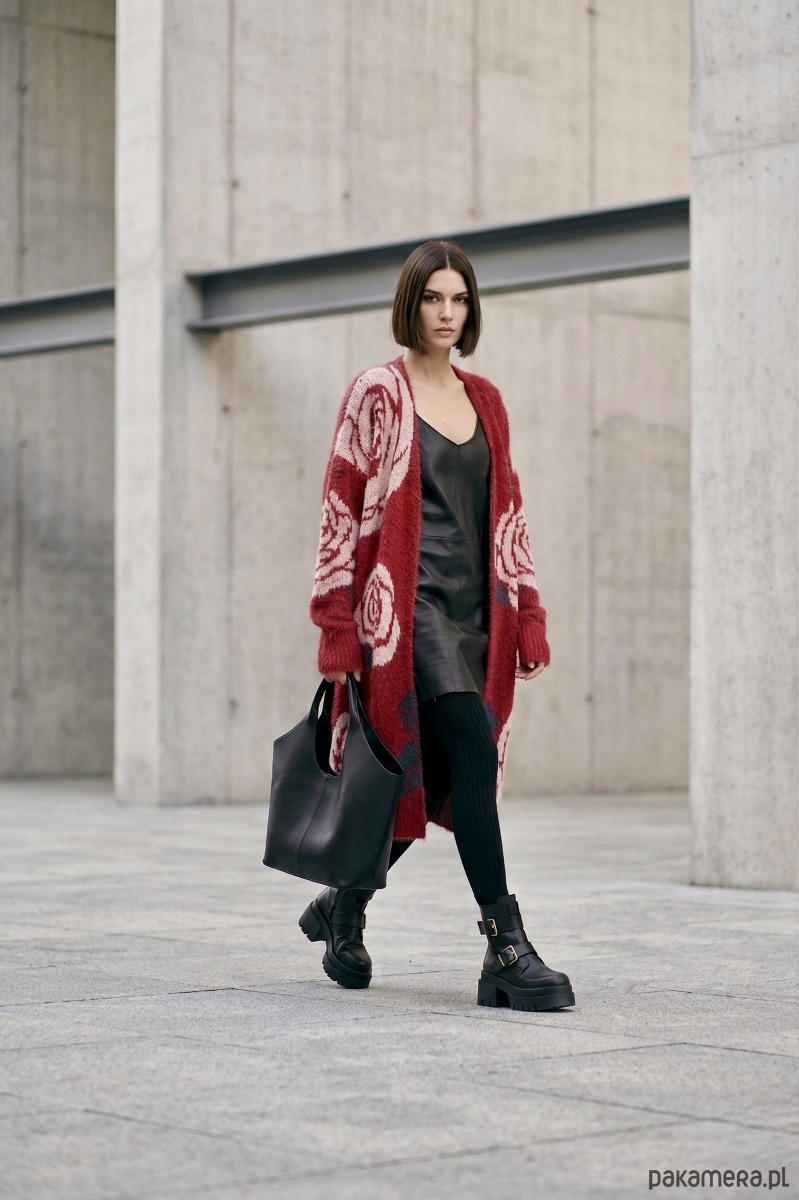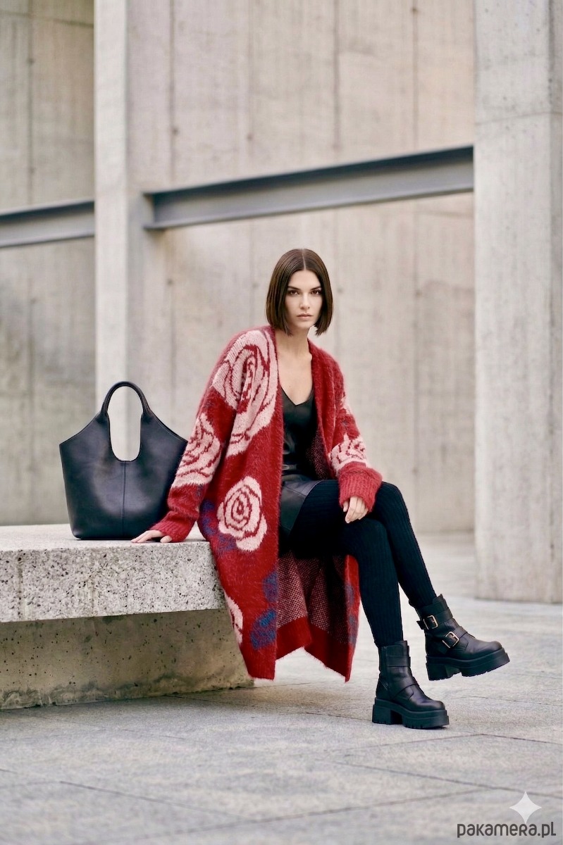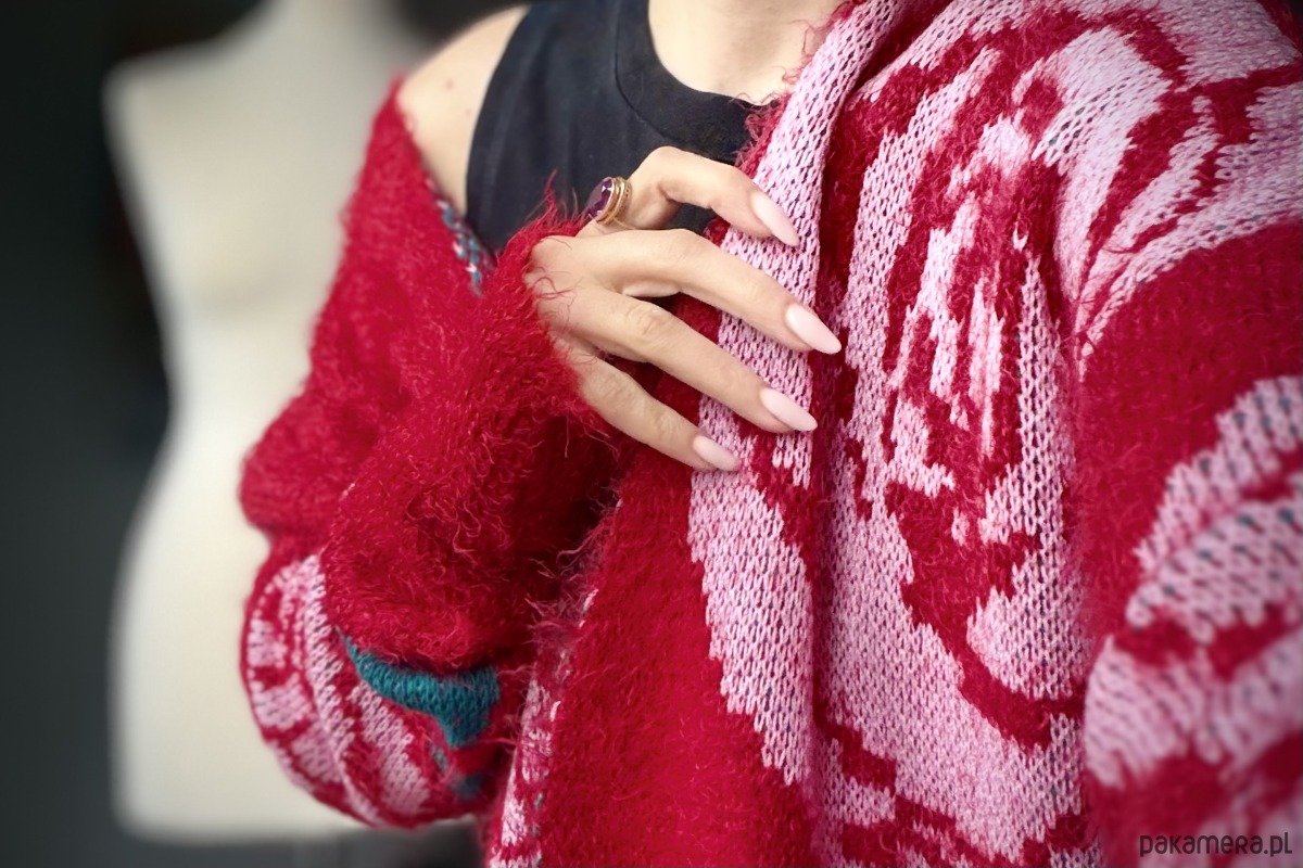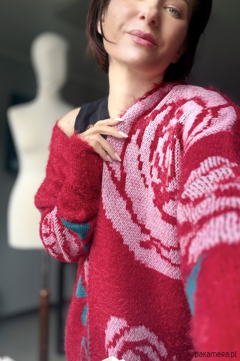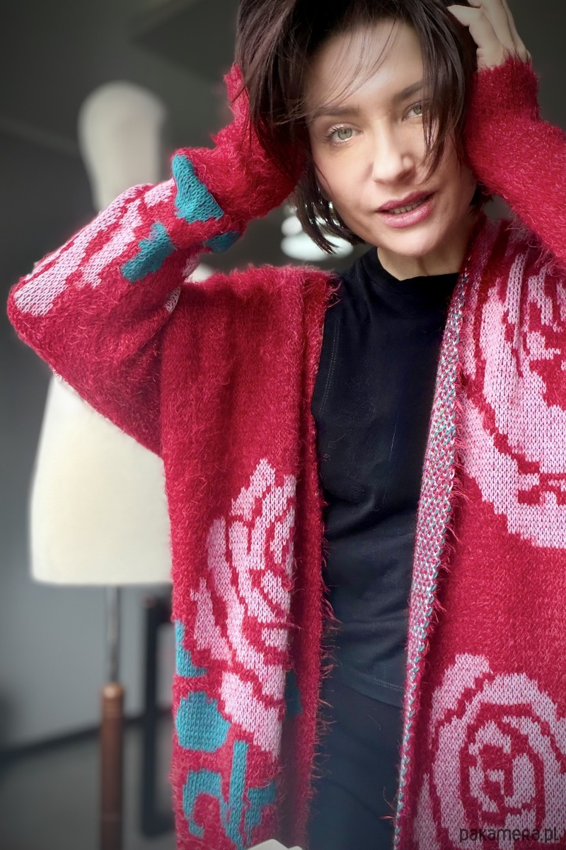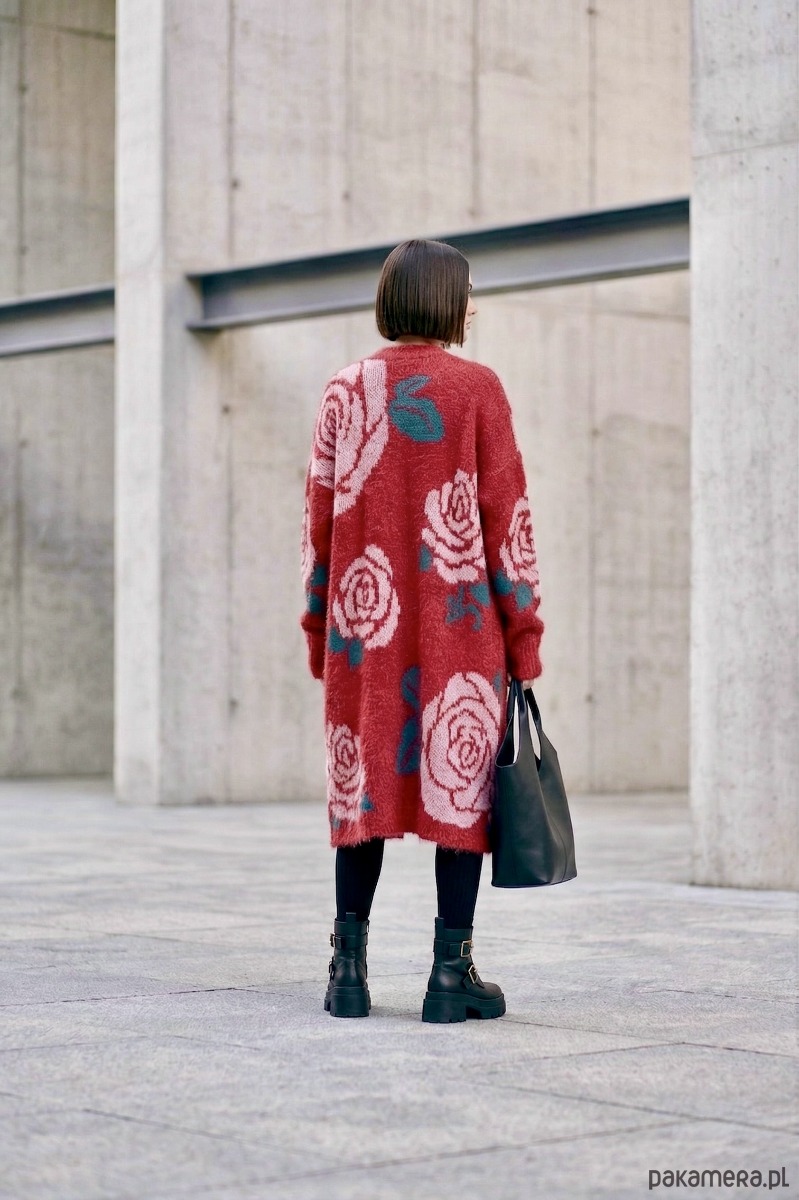 Spektakularny kardigan w różany print. Wykonany z fantazyjnej przędzy z włosiem. Niezmiernie miękki i przyjemny w dotyku.