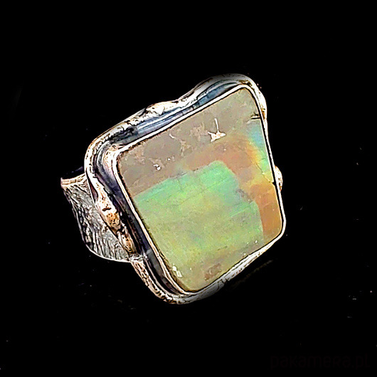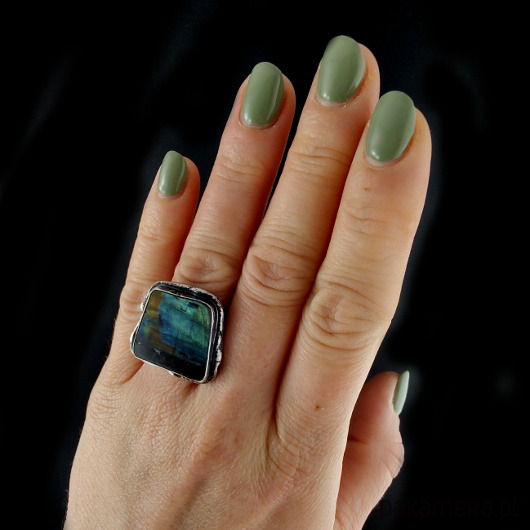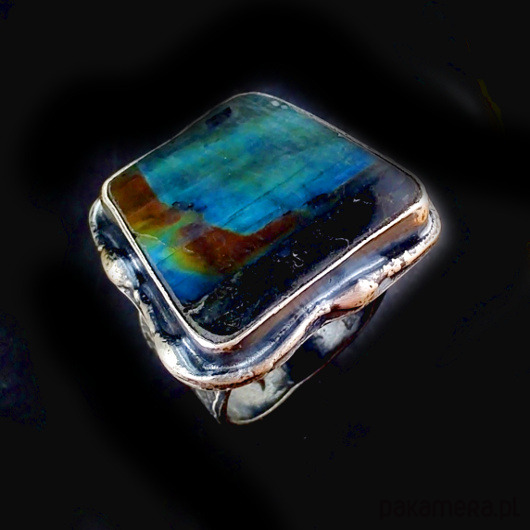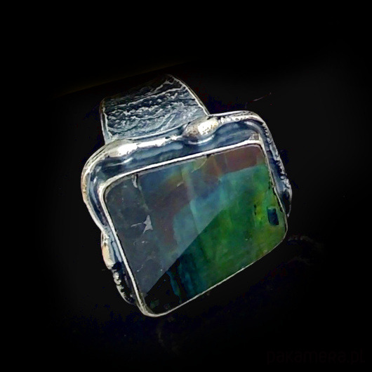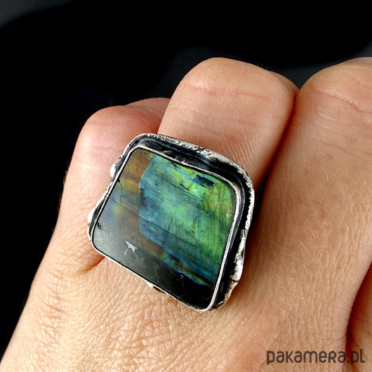 Pierścień z oprawionym w oksydowane srebro próby 925 naturalnym spektrolitem, najcenniejszą odmianą labradorytu pochodzącą z Finlandii. Niemal czarny, pod odpowiednim kątem ukazuje intensywny ogień odcieni zieleni, błękitu i granatu. Tafla kamienia gładka, z licznymi charakterystycznymi inkluzjami. Wymiary całej oprawy 24 x 25 mm. Waga pierścionka 14,5 g. Rozmiar jubilerski 17, możliwe powiększenie na max. rozmiar 18. Szerokość obrączki max. 14 mm. Pierścionek zostanie zapakowany w ozdobne pudełeczko.
