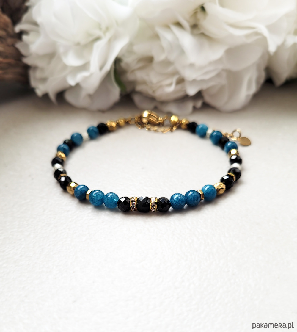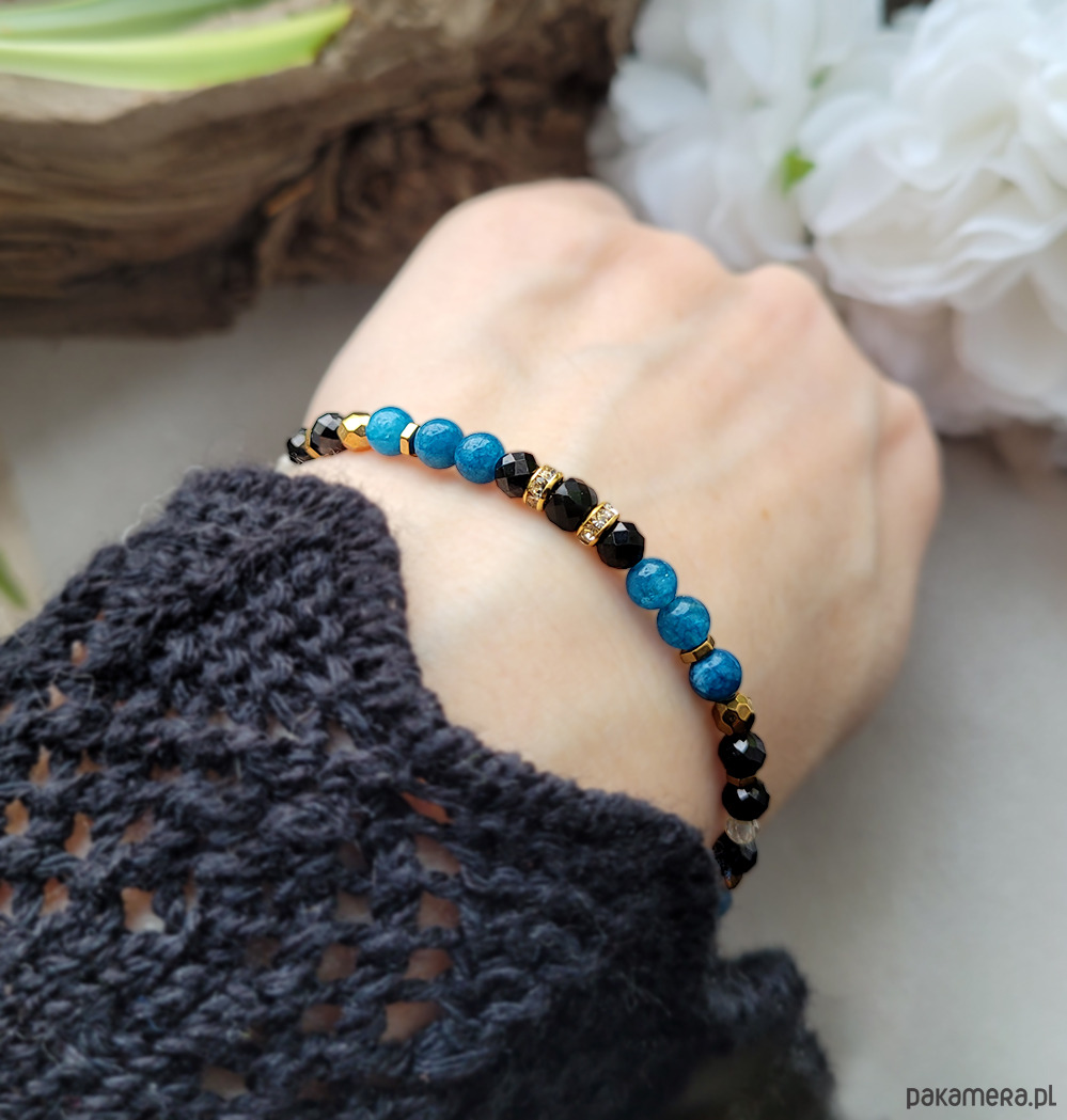 Piękna elegancka bransoletka zrobiona z kamieni naturalnych: Turmalinu, Apatytu, Hematytu w kolorze złota oraz Cyrkonii.