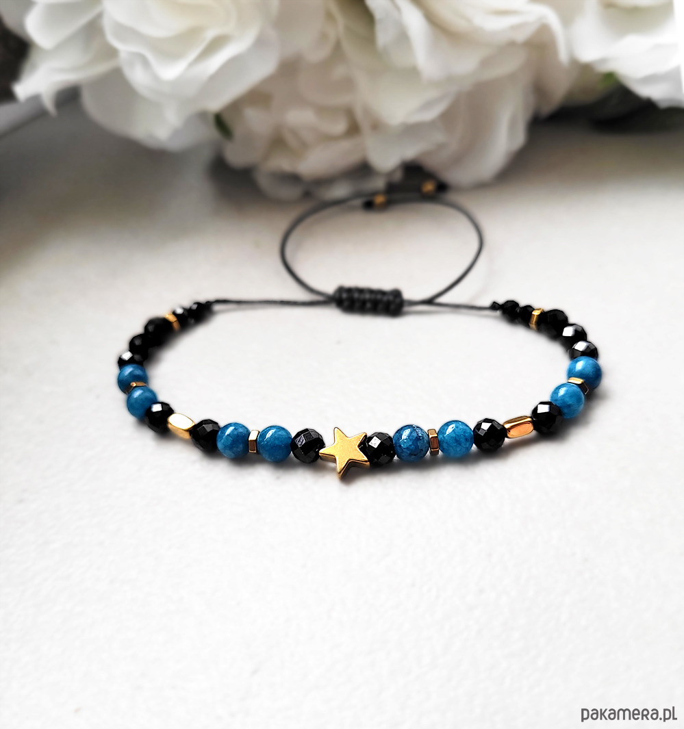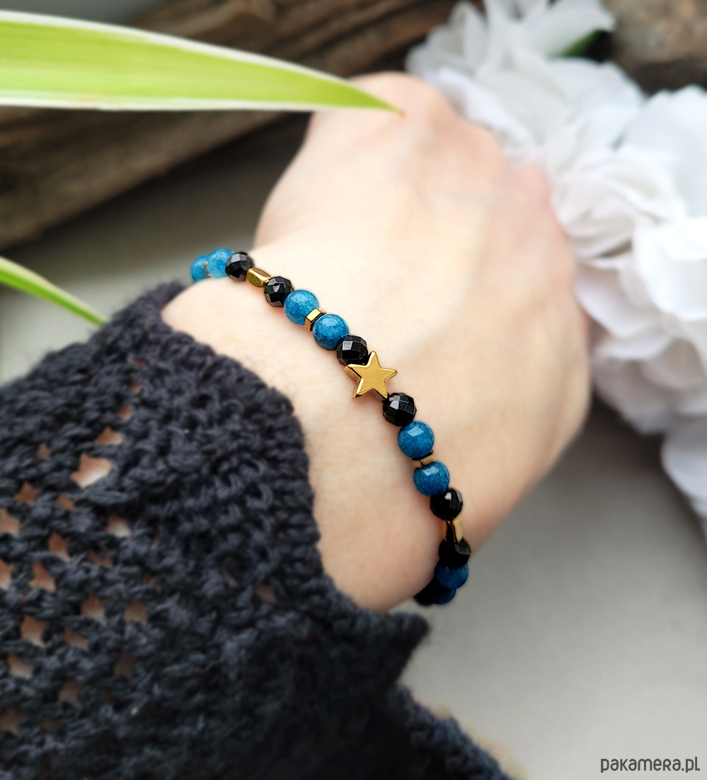 Bransoletka zrobiona z kamieni naturalnych: Turmalinu, Apatytu oraz Hematytu w kolorze złota z gwiazdką z Hematytu.