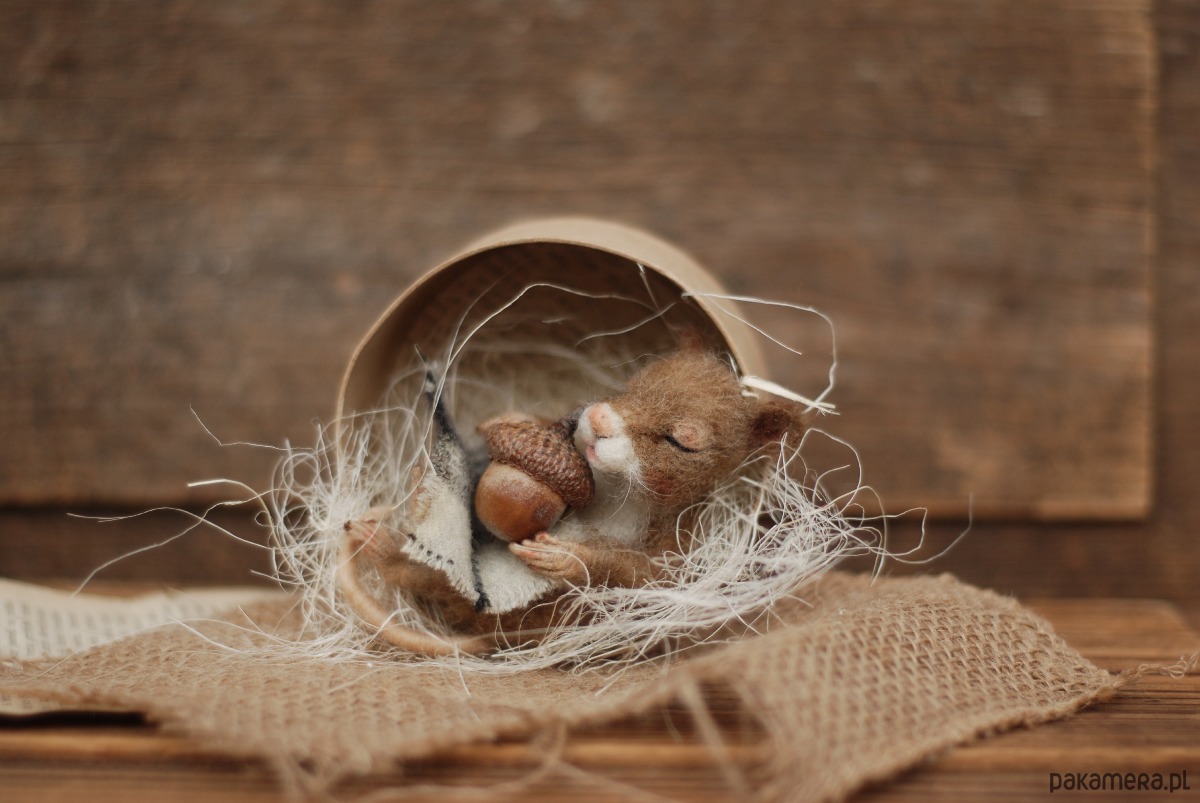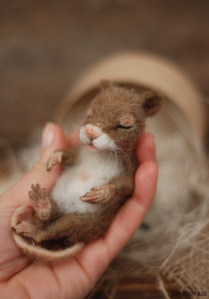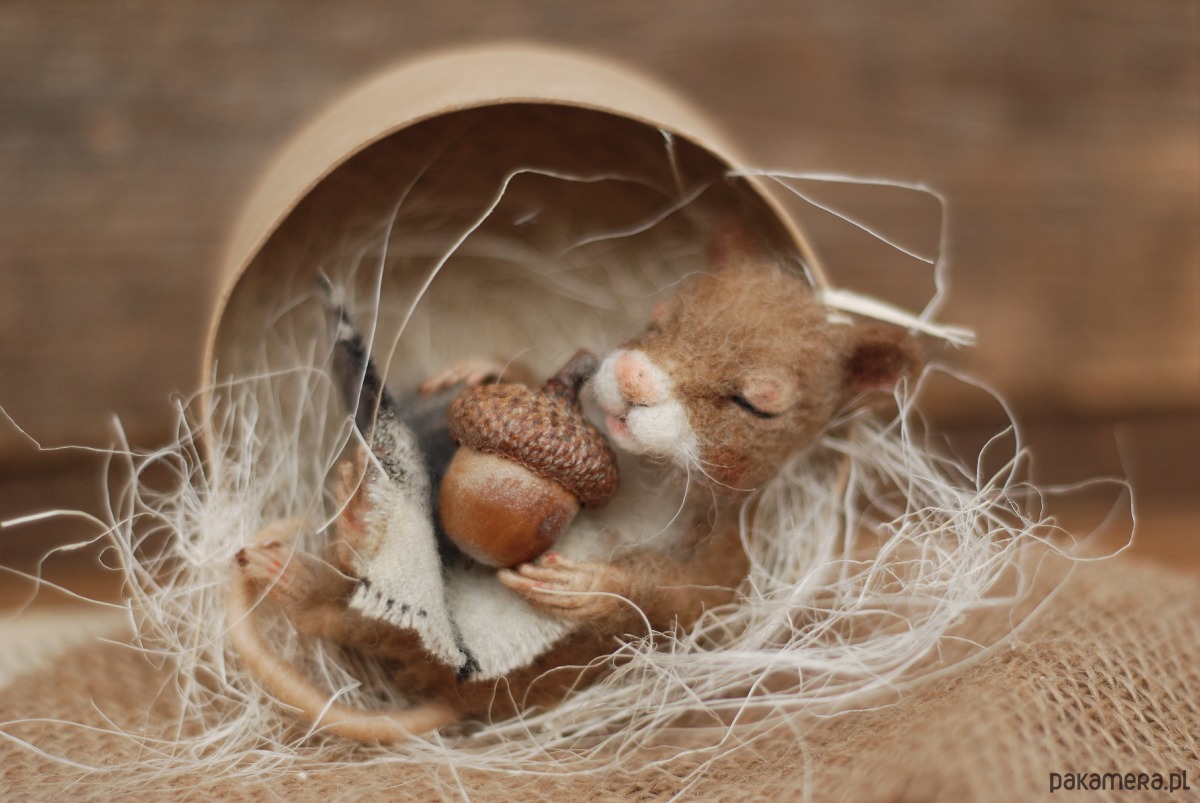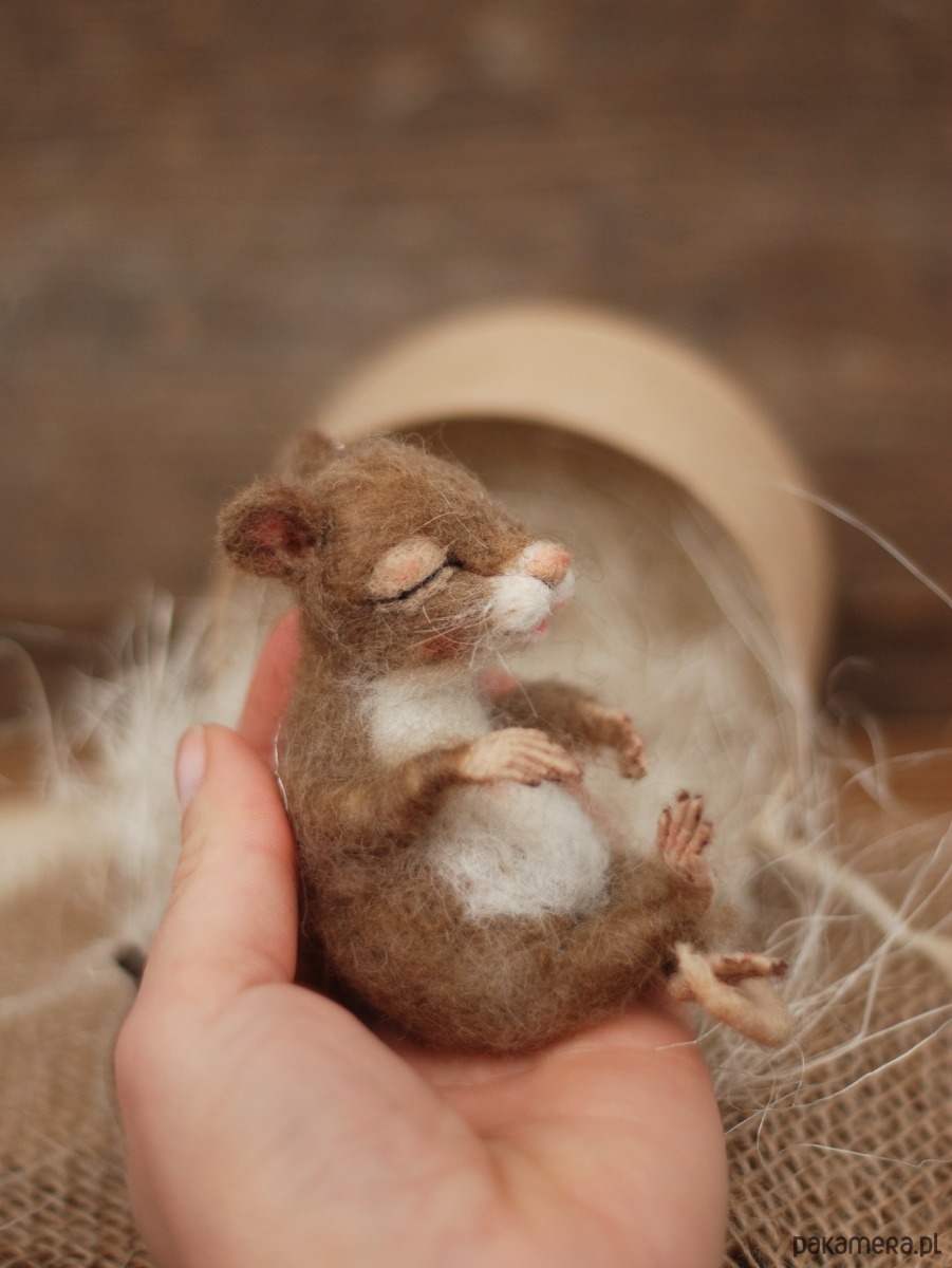 Myszka wykonany metodą filcowania na sucho z wełny merynos.