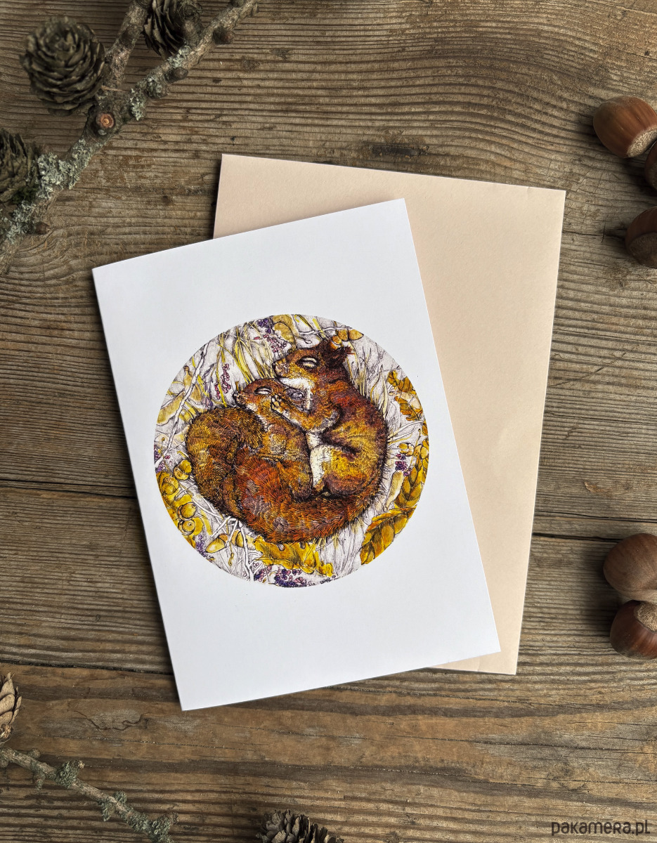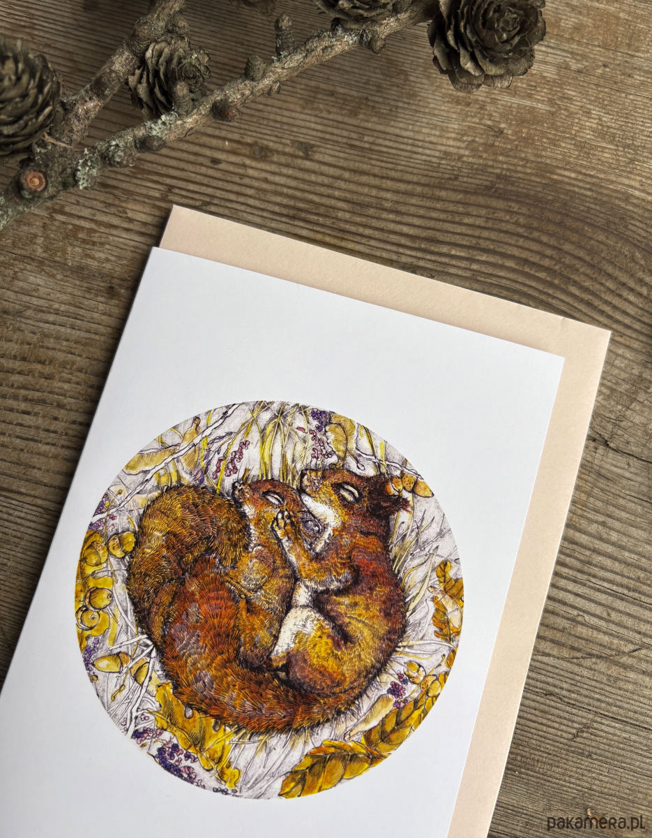 Śpiące wiewiórki- Kartka- Grafika- Ilustracja- Zwierzaki- Las
