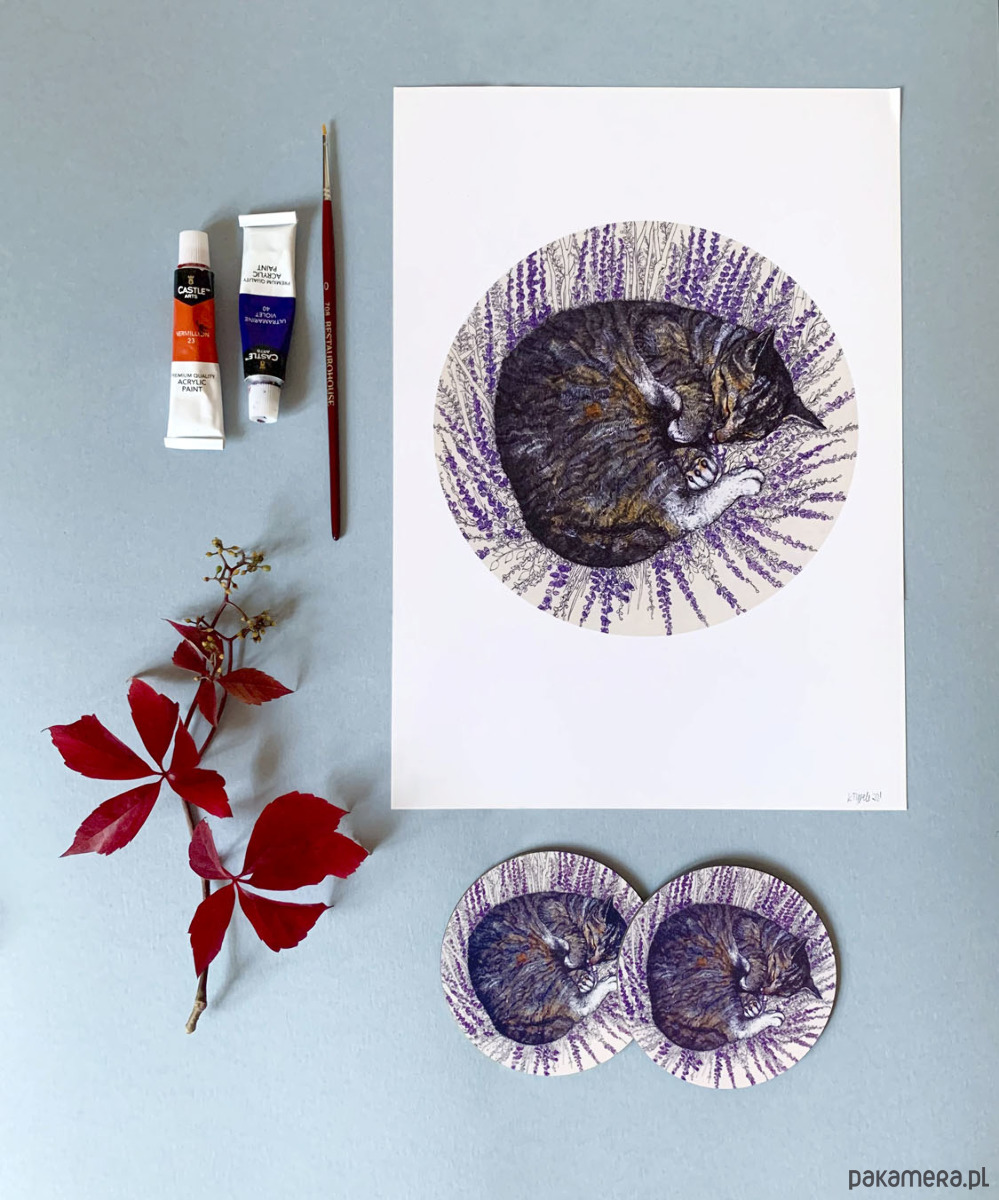 Grafika - Śpiący kot, to wydruk jednej z autorskich ilustracji inspirowanej życiem domowych zwierzaków