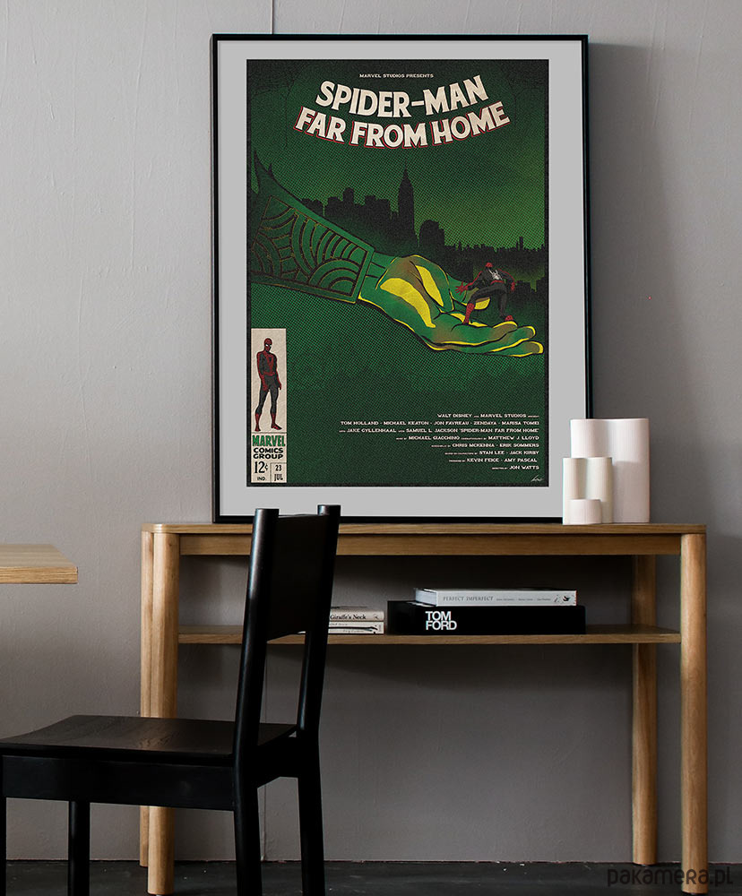 Plakat z autorską grafiką inspirowaną filmem "Spider-Man: Daleko od domu" (Spider-Man: Far from home), reż. J.Watts. Stylizowany na okładki starszych wydań komiksów ze Spider-Manem.