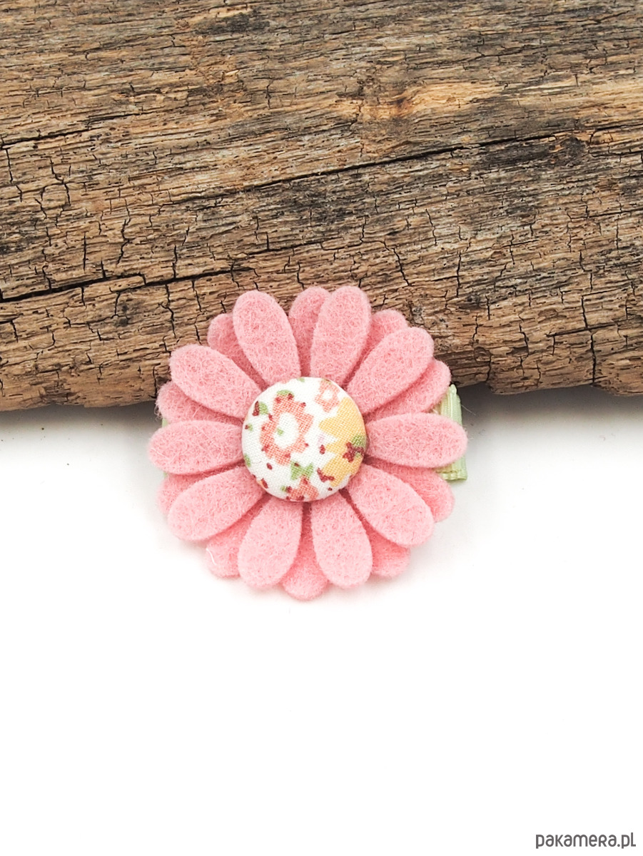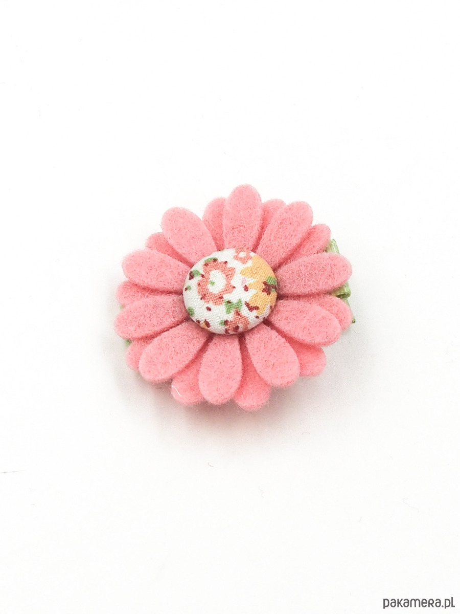 Kwiatek śr. ok 4 cm wykonany z wełnianego filcu, ozdobiony ręcznie robionym guziczkiem.