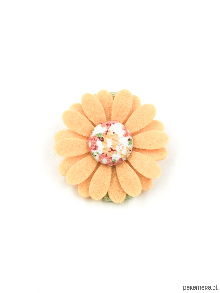 Kwiatek śr. ok 4 cm wykonany z wełnianego filcu, ozdobiony ręcznie robionym guziczkiem.