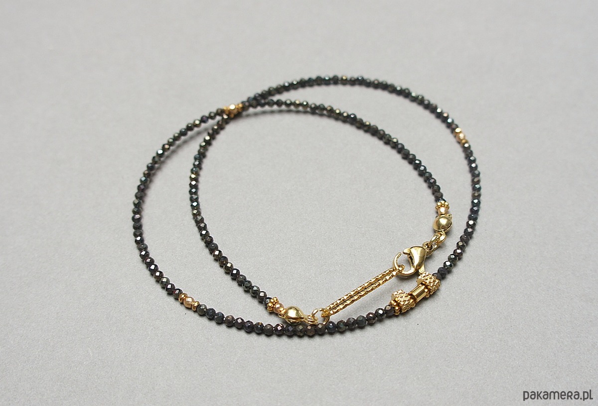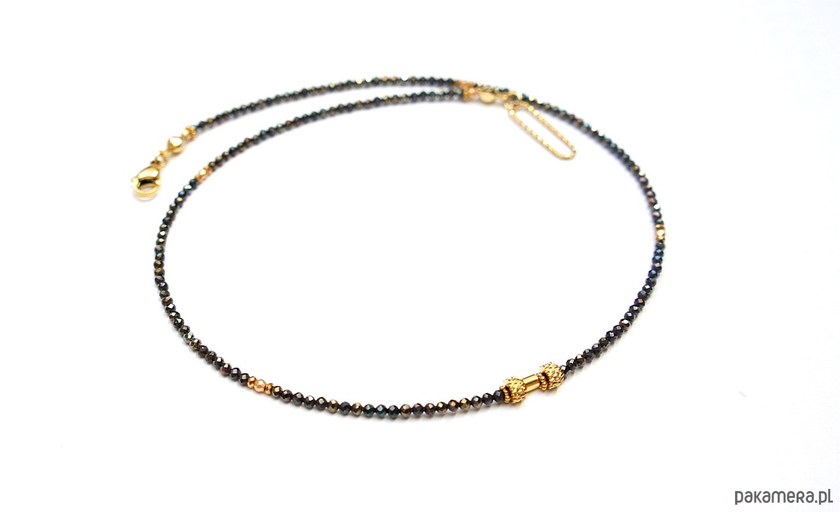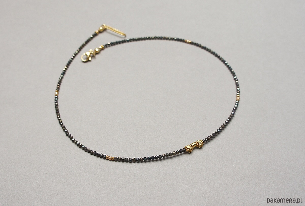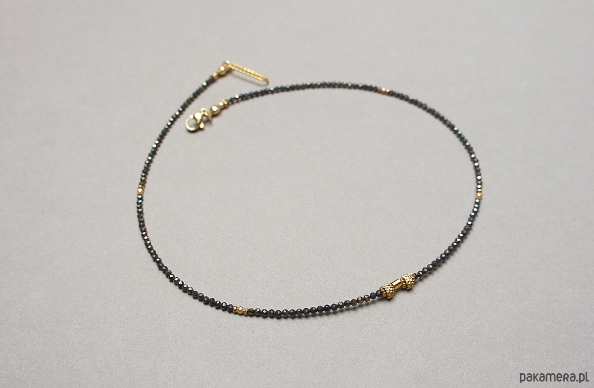 Krótki, delikatny naszyjnik wykonany w całości z pozłacanej stali szlachetnej oraz naturalnych, szlachetnych, wyselekcjonowanych kamieni - fasetowany spinel w kolorze czekolady - platerowany [ok. 2,2mm], hematyt fasetowany platerowany [2mm], przekładek z hematytu [1mm]. Naszyjnik o długości ok. 40cm.