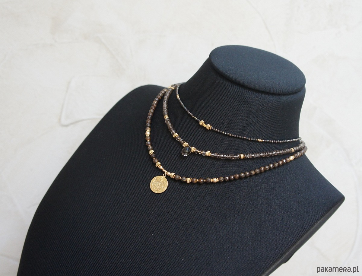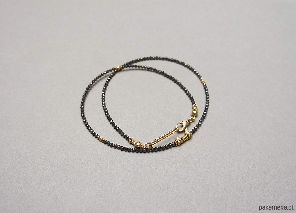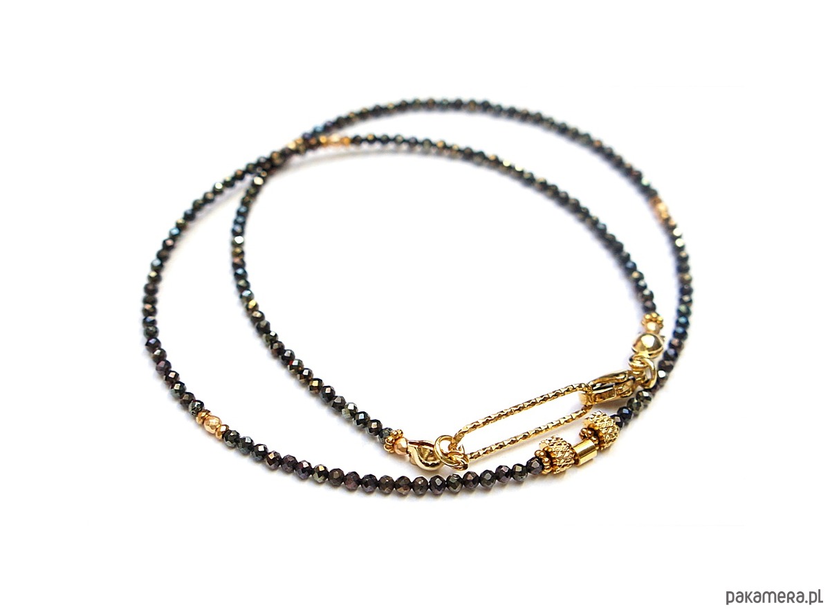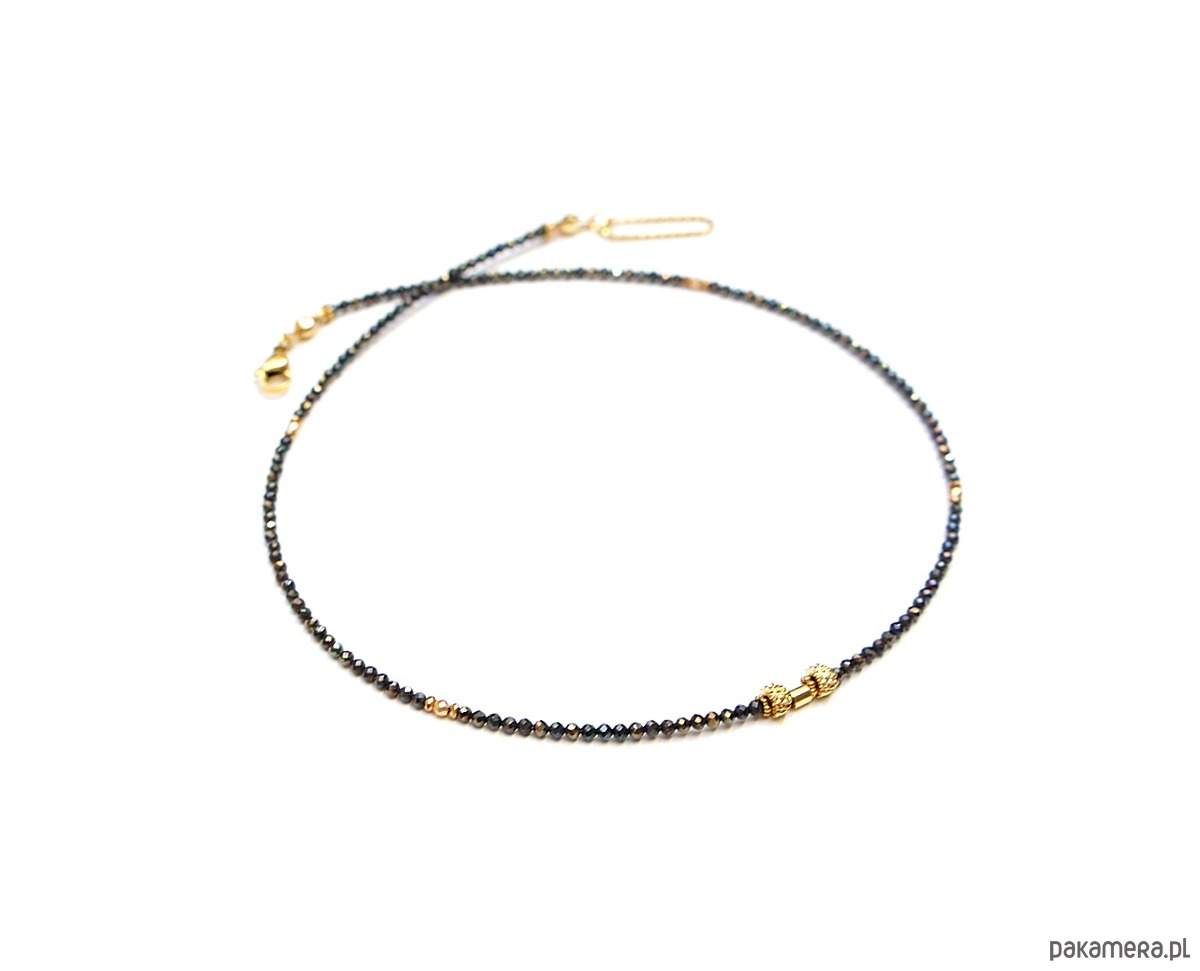 Krótki, delikatny naszyjnik wykonany w całości z pozłacanej stali szlachetnej oraz naturalnych, szlachetnych, wyselekcjonowanych kamieni - fasetowany spinel w kolorze czekolady - platerowany [ok. 2,2mm], hematyt fasetowany platerowany [2mm], przekładek z hematytu [1mm]. Naszyjnik o długości ok. 40cm.