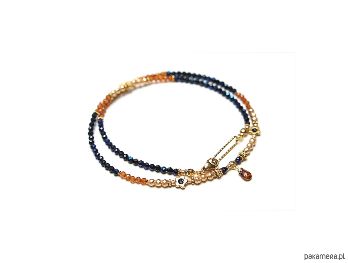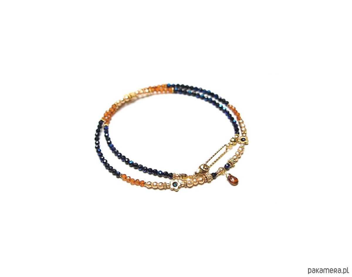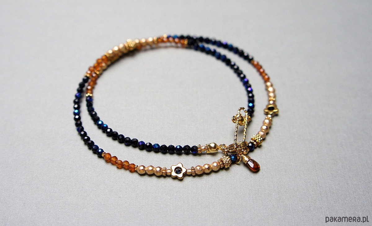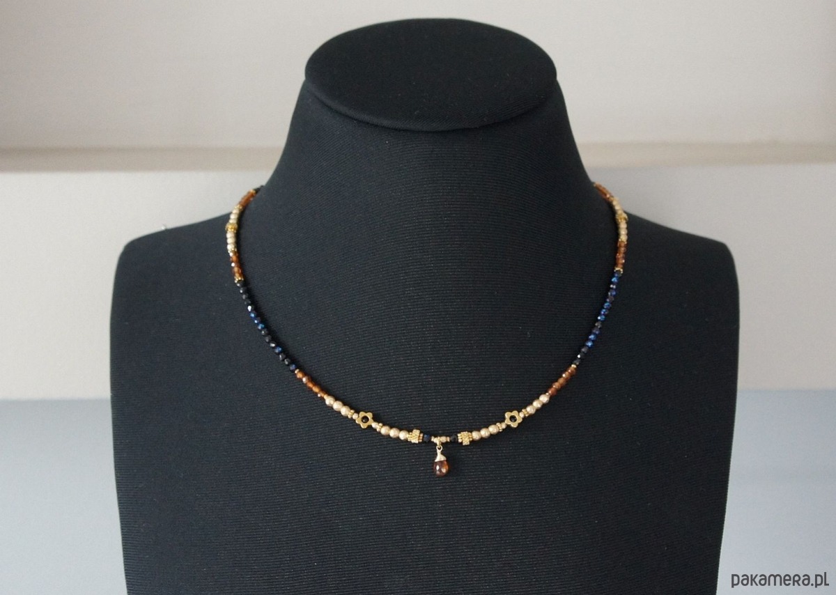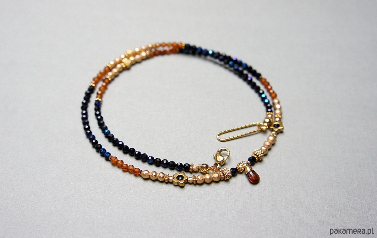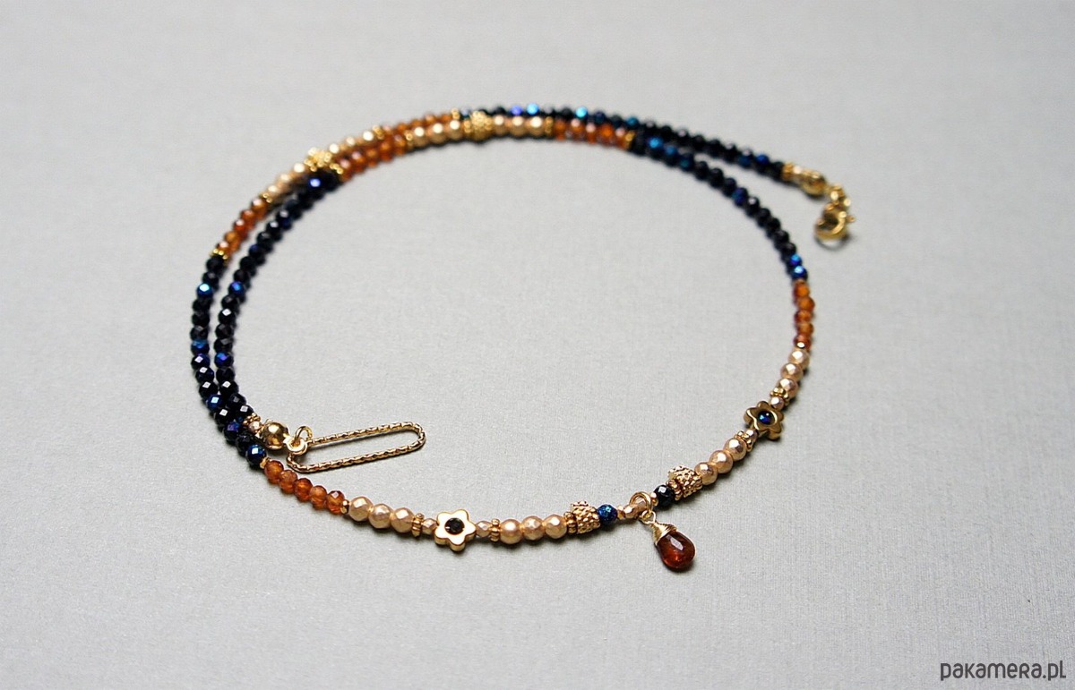 Krótki naszyjnik wykonany w całości z pozłacanej stali szlachetnej oraz kamieni naturalnych - spinel granatowy, platerowany (powłoka mystic na kamieniach; średnica 2,5mm oraz 1,5mm), granaty hessonit fasetowane [2,5mm], hematyt fasetowany, platerowany [2mm i 3mm], przekładek z hematytu [1mm], kwiatków z hematytu [6mm], turmalinu w kształcie brioletki. Naszyjnik o długości ok. 46,5cm. Jedyny egzemplarz.
