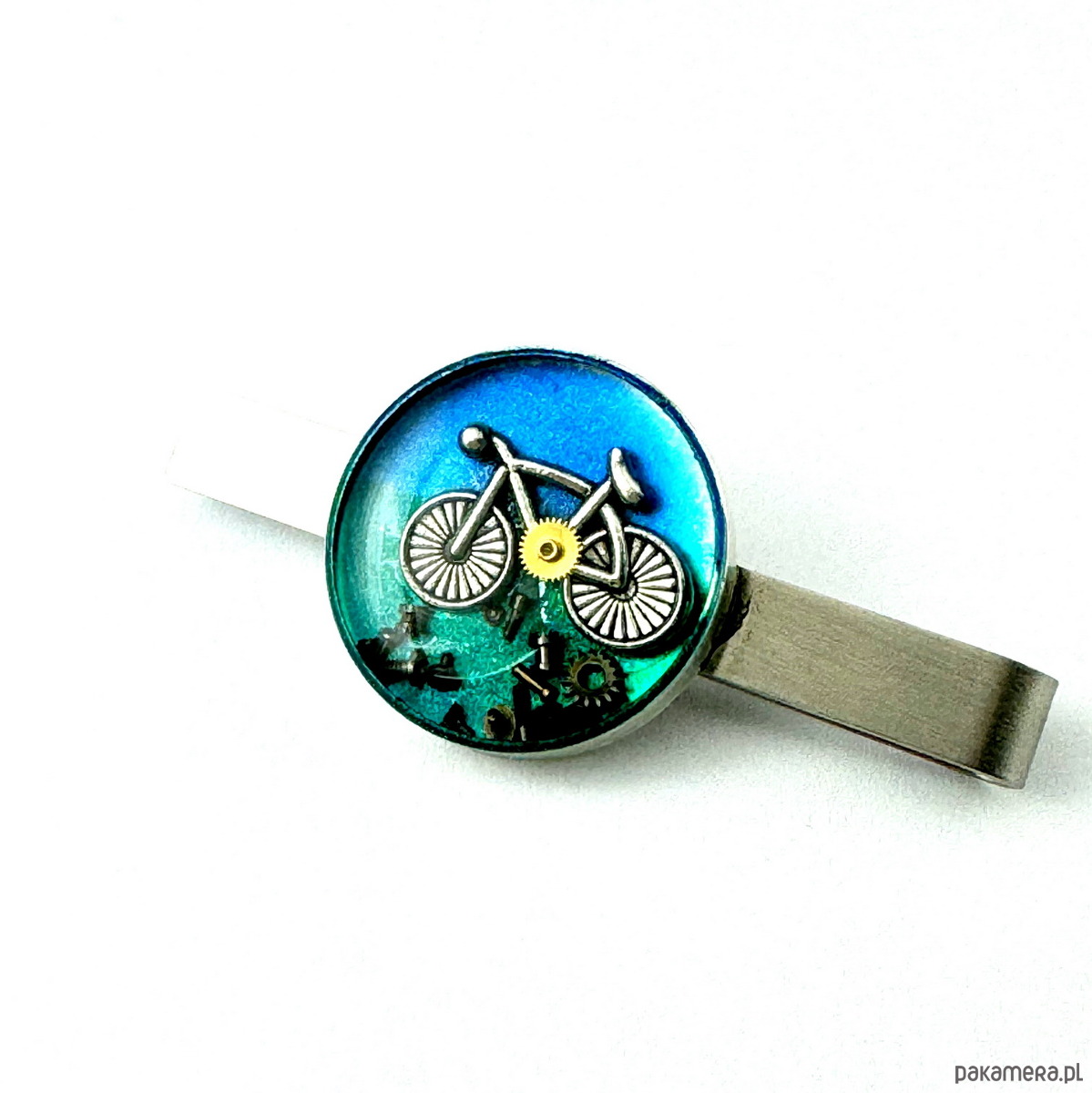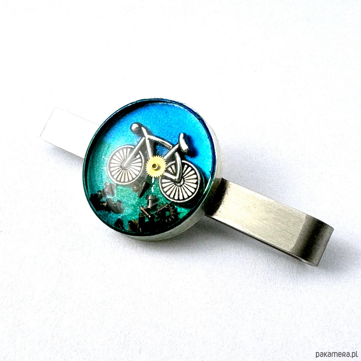 Ręcznie wykonana spinka do krawata, w bazie zatopiony rowerek na wyjątkowo wesołym i pogodnym tle :-)