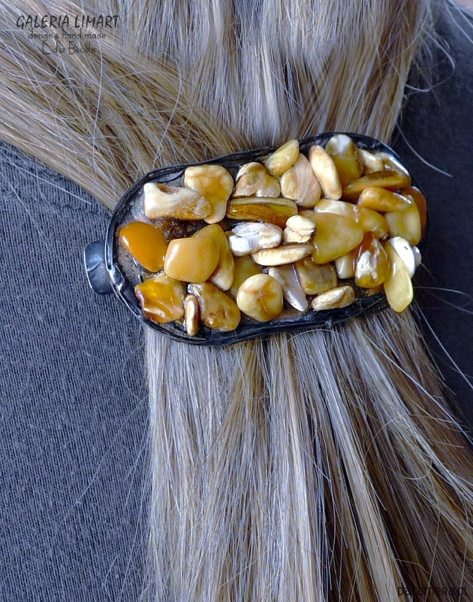 Autorska, UNIKATOWA (wykonana w jednym jedynym egzemplarzu) spinka do włosów z pięknymi w swym ciepłym słonecznym ubarwieniu, surowymi, mlecznymi bursztynami bałtyckimi. Unikatowa i ekologiczna oprawa w technice Tiffany. Patynowana na kolor starego srebra, co idealnie współgra z barwą bursztynu. Bardzo starannie wykonana. Oryginalna, elegancka i piękna ozdoba Twoich włosów ok. 8x3,5 cm. Dwustopniowy mechanizm zapinający o długości 8 cm. Lekka!