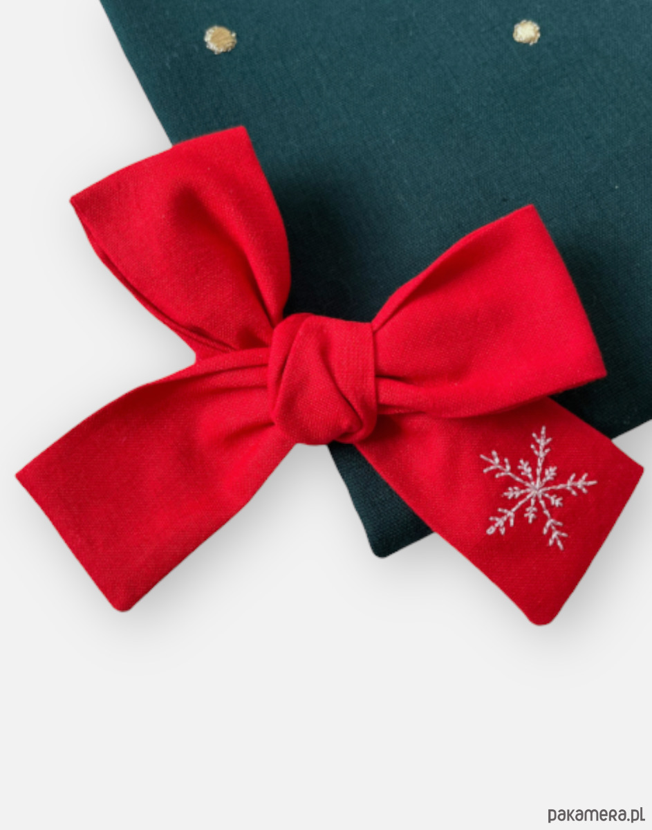 Wzór: spinka w kolorze czerwonym, na niej haft - płatek śniegu
