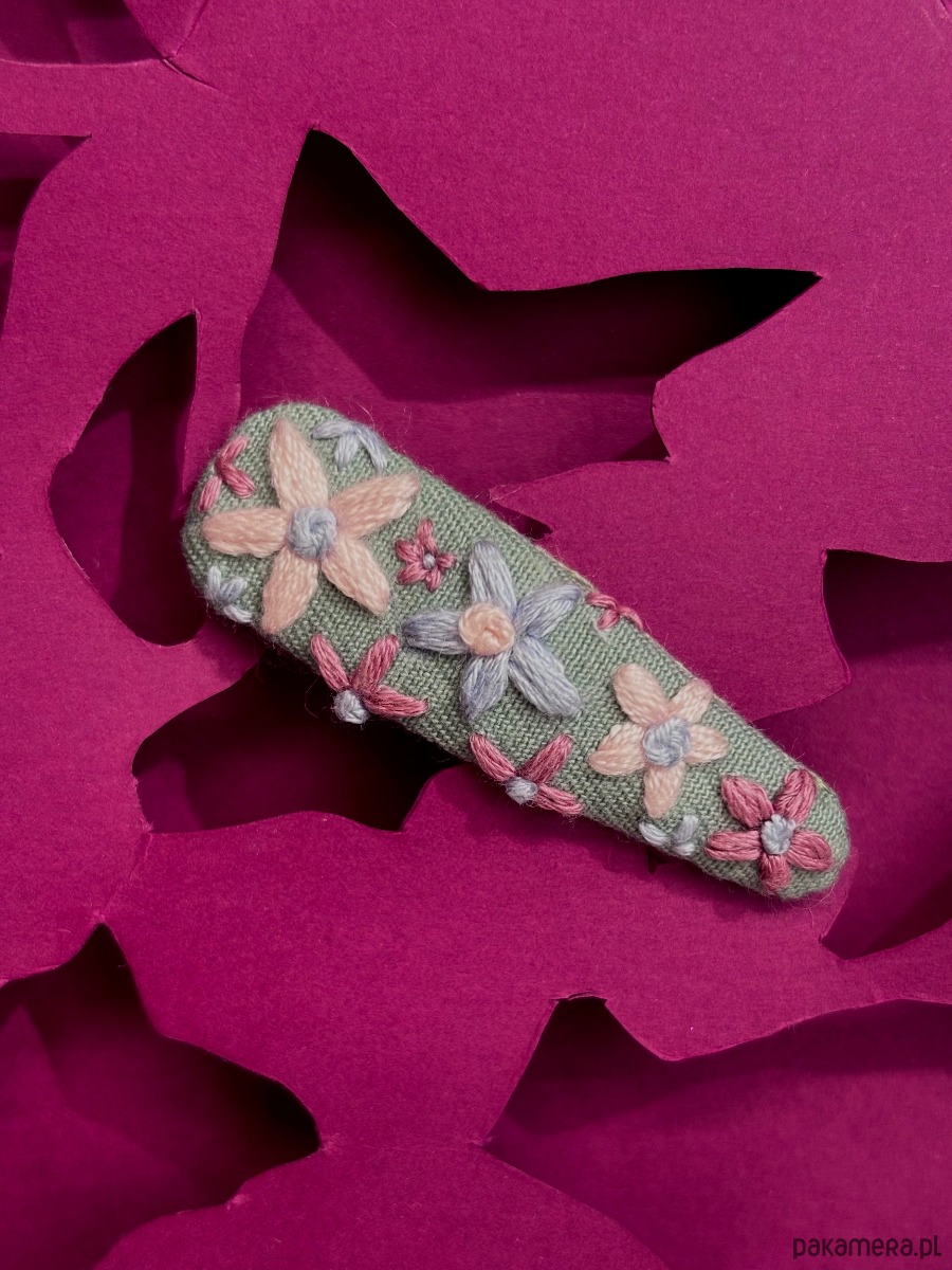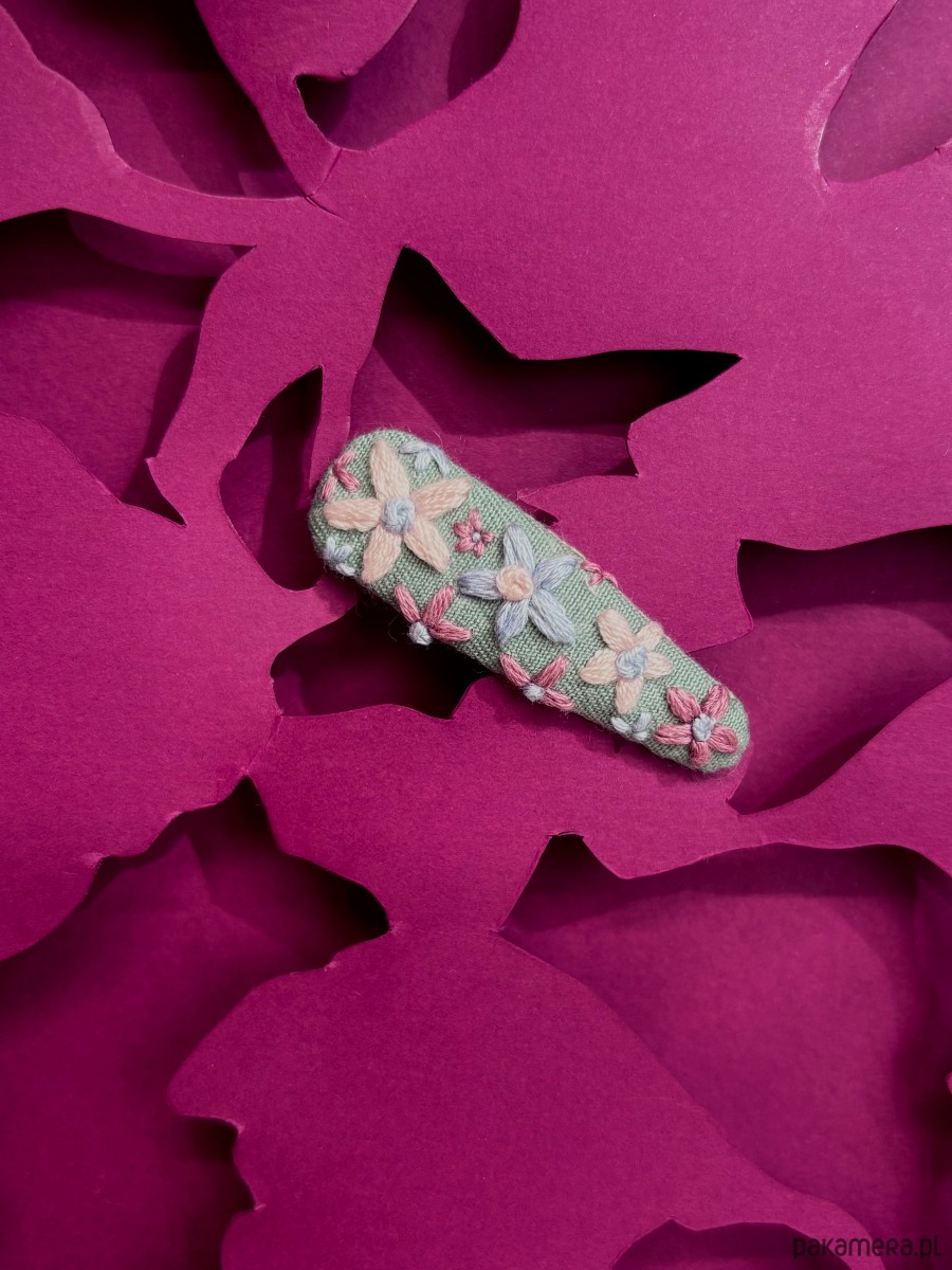 Spinka z łąkowymi kwiatami jest zaprojektowana w Polsce, starannie ręcznie wyszyta bawełnianą muliną na szałwiowej bawełnie, od spodu podszyta wiskozowo-wełnianym filcem.
