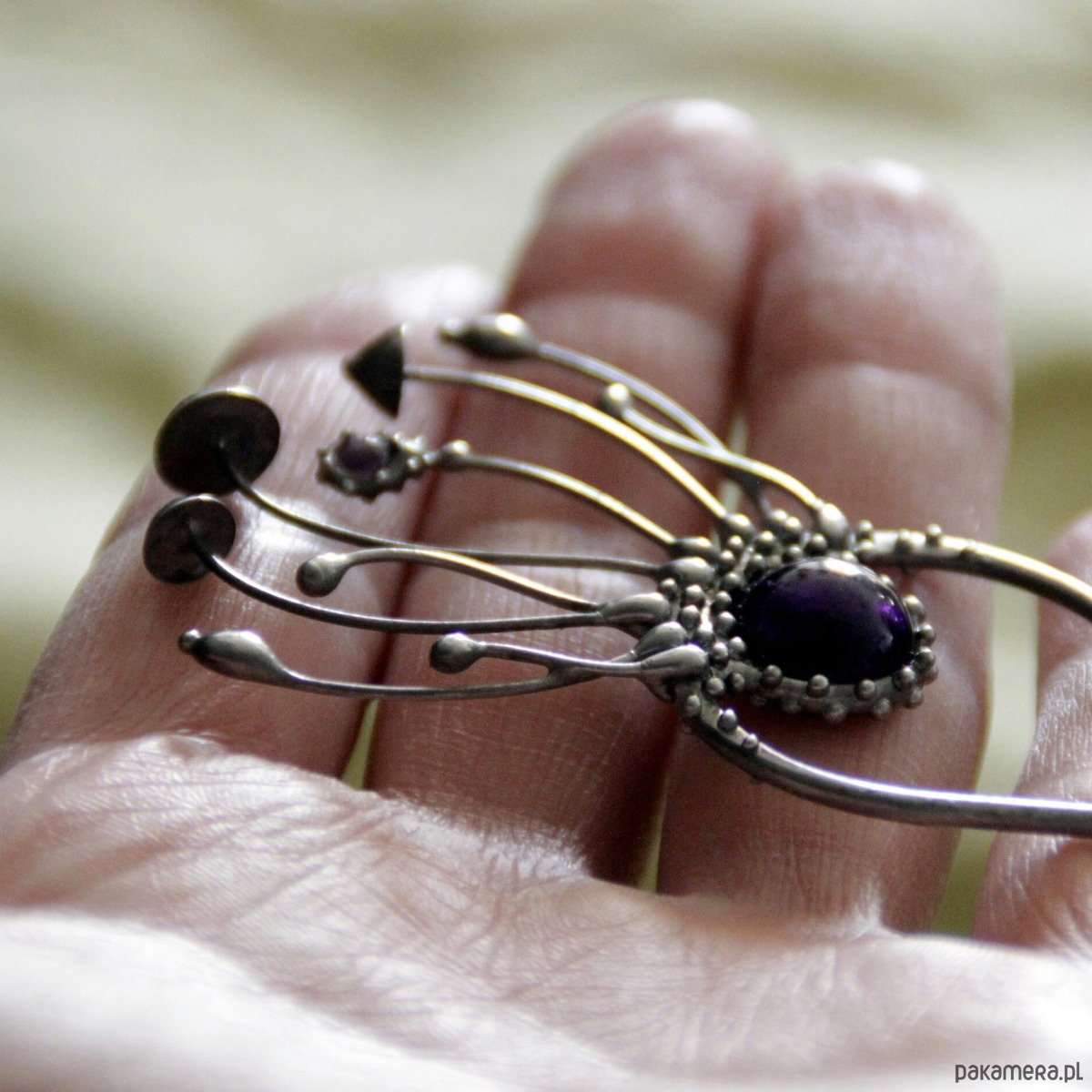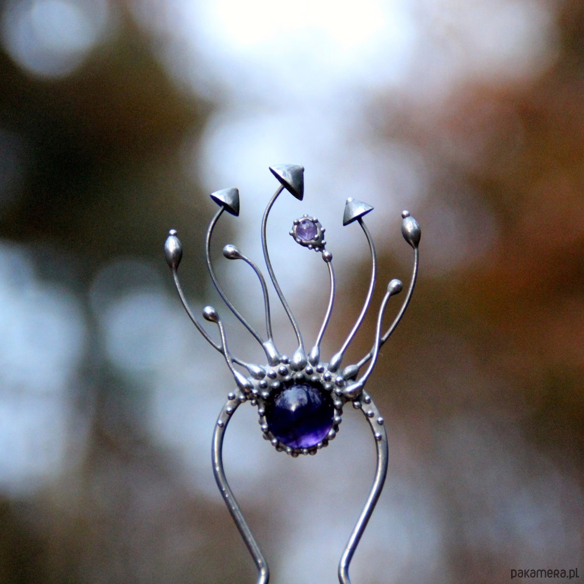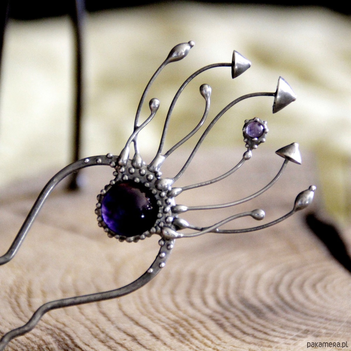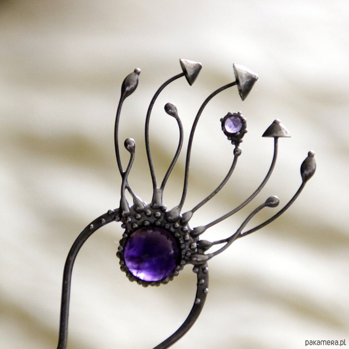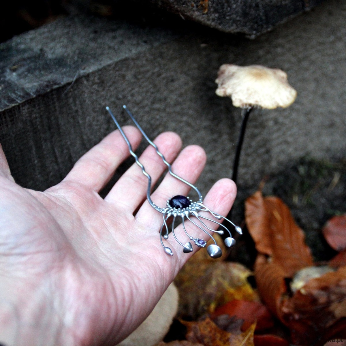 Srebrna metalowa magiczna grzybowa spinka do włosów w stylu cottagecore, wykonana ręcznie z miedzi, cyny, stali i dwóch kamieni ametystowych. Poddana obróbce antyoksydacyjnej, szlifowana, polerowana. Niezwykła i solidna, wyjątkowa spinka do włosów z motywem leśnym. Wszystkie elementy są wykonane ręcznie, co zapewnia indywidualność każdego produktu wytworzonego w warsztacie Yadovito. Stop cyny i miedzi jest polerowany roztworem wykończeniowym, aby nadać biżuterii szlachetny wygląd, a jednocześnie zapobiec utlenianiu się metalu. Rozmiar około 14,5/4,5 cm. Kolor czarny/fioletowy.