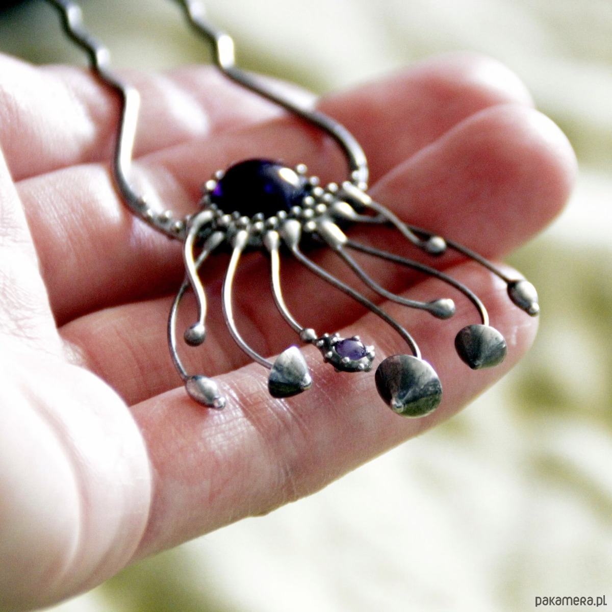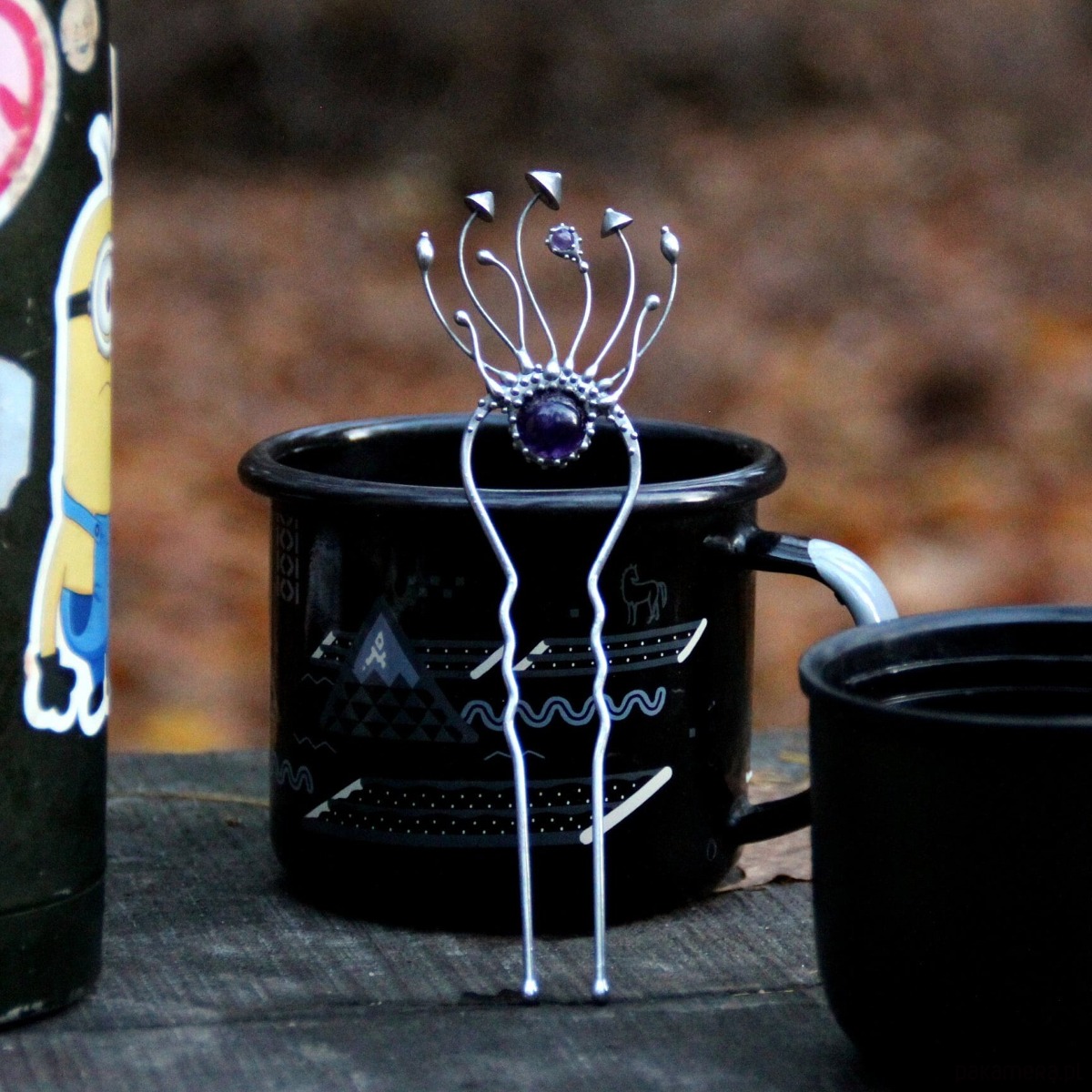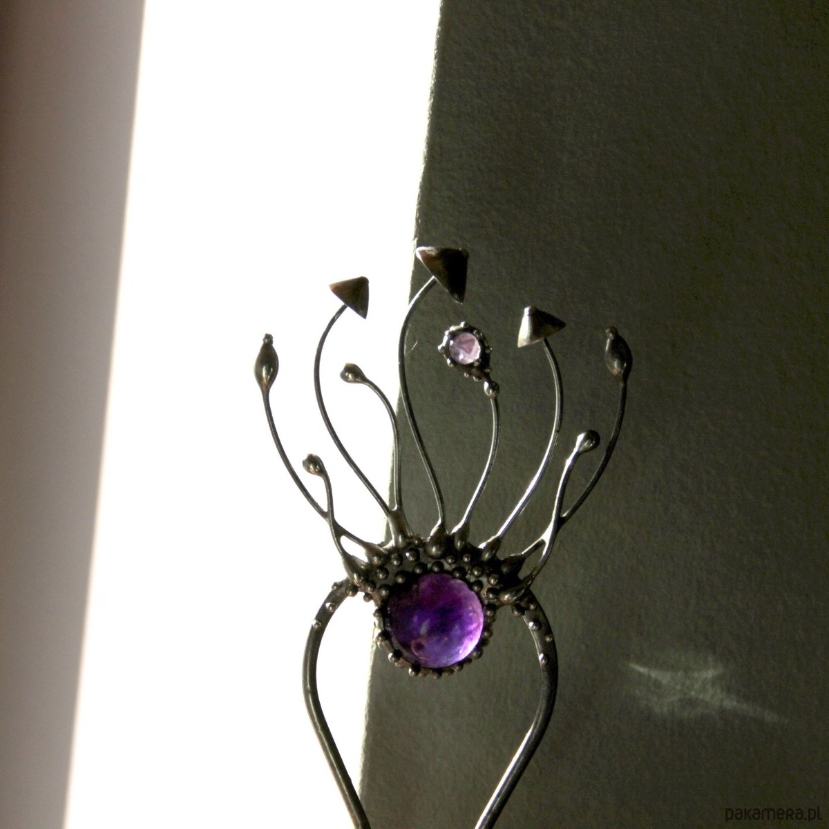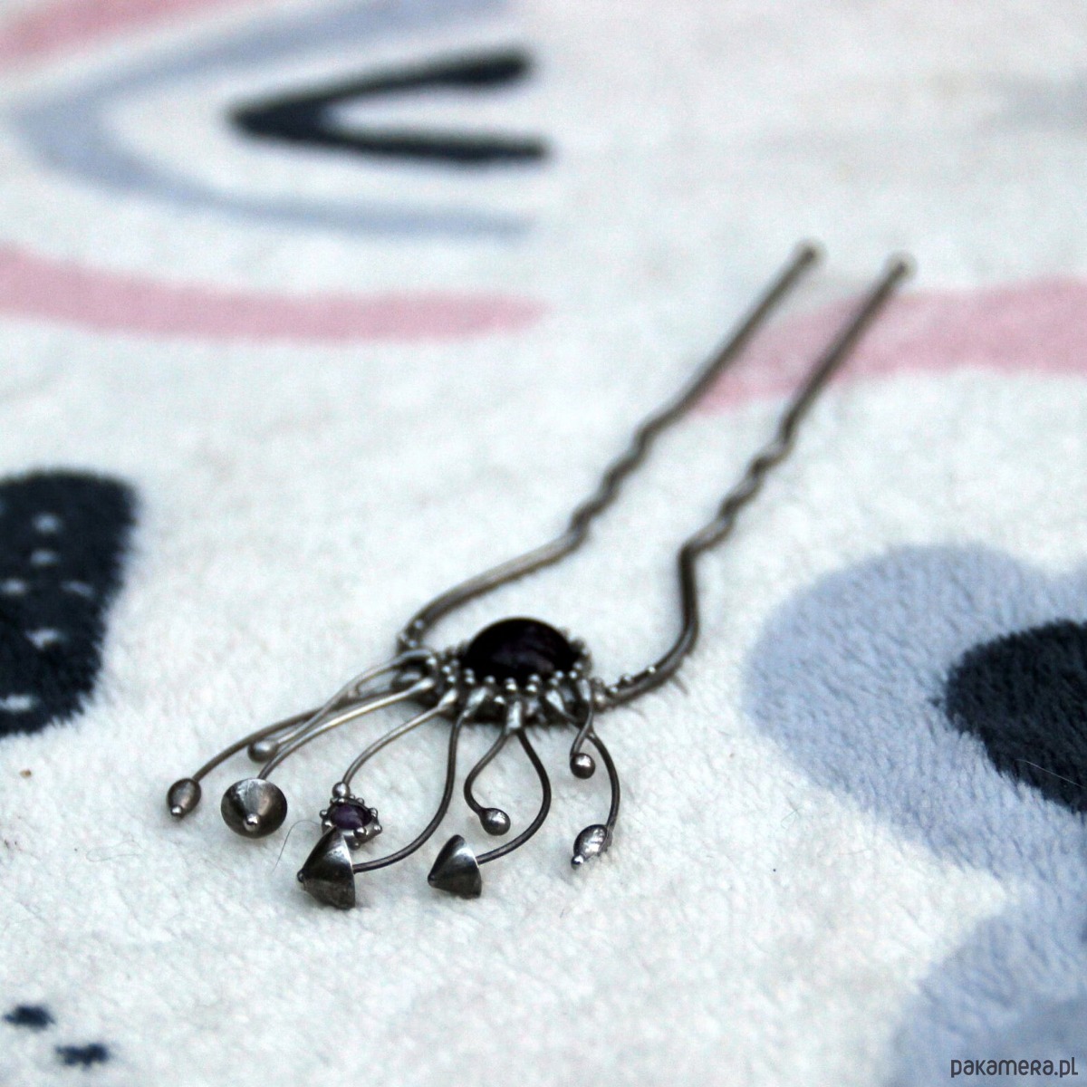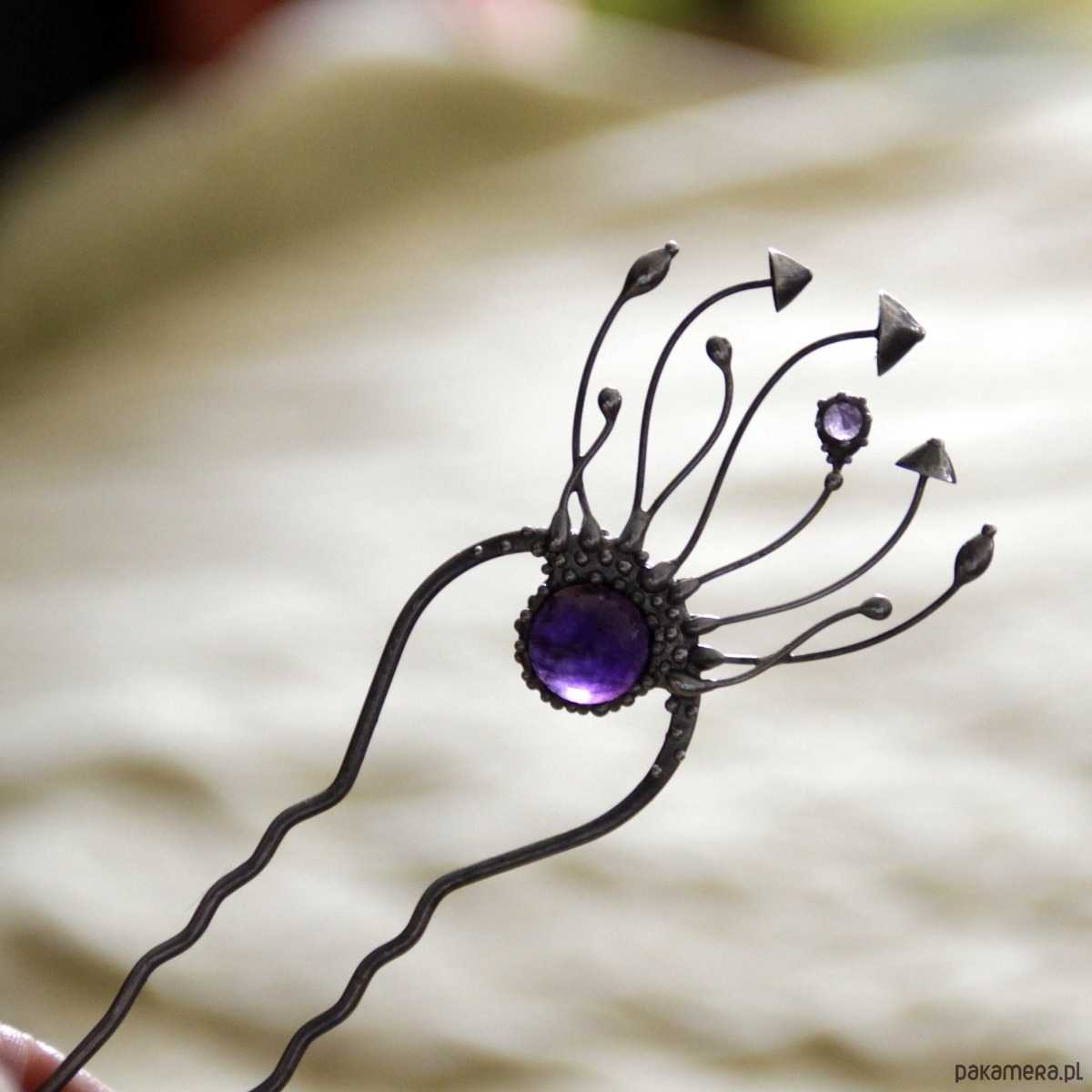 Srebrna metalowa magiczna grzybowa spinka do włosów w stylu cottagecore, wykonana ręcznie z miedzi, cyny, stali i dwóch kamieni ametystowych. Poddana obróbce antyoksydacyjnej, szlifowana, polerowana. Niezwykła i solidna, wyjątkowa spinka do włosów z motywem leśnym. Wszystkie elementy są wykonane ręcznie, co zapewnia indywidualność każdego produktu wytworzonego w warsztacie Yadovito. Stop cyny i miedzi jest polerowany roztworem wykończeniowym, aby nadać biżuterii szlachetny wygląd, a jednocześnie zapobiec utlenianiu się metalu. Rozmiar około 14,5/4,5 cm. Kolor czarny/fioletowy.
