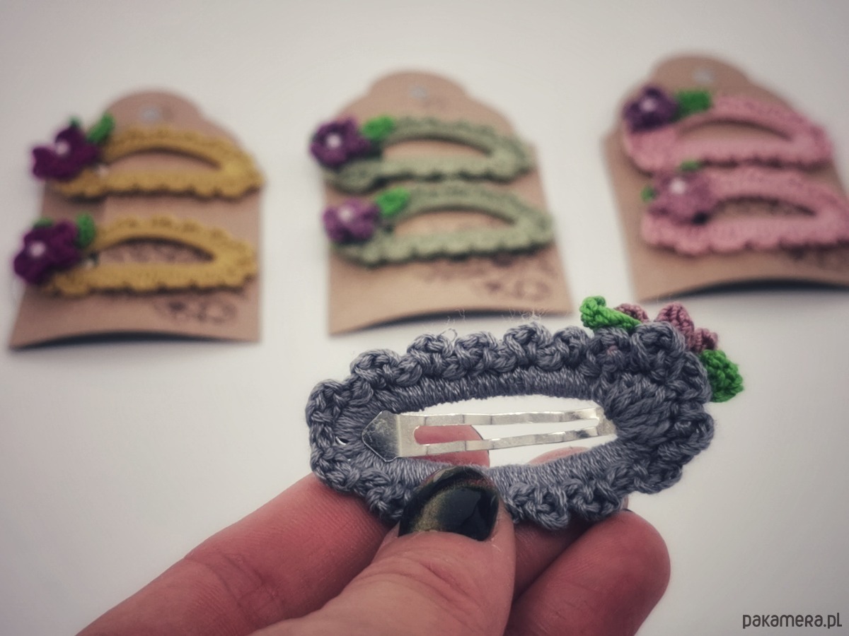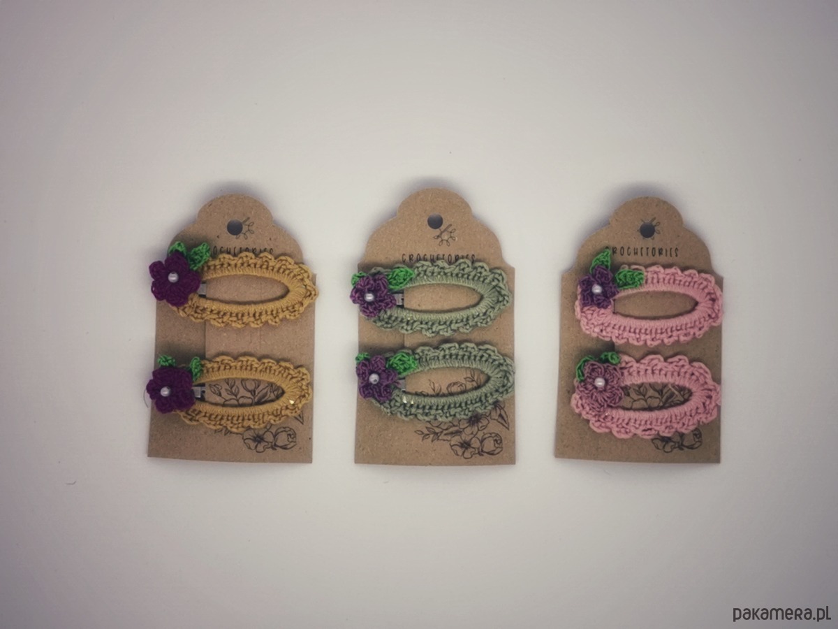 Spinki do włosów wykonane ręcznie na szydełku z bawełny macerowanej. Ozdobione delikatnym kwiatkiem i małą perłą.