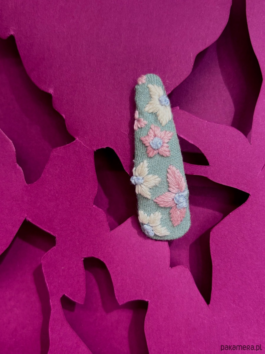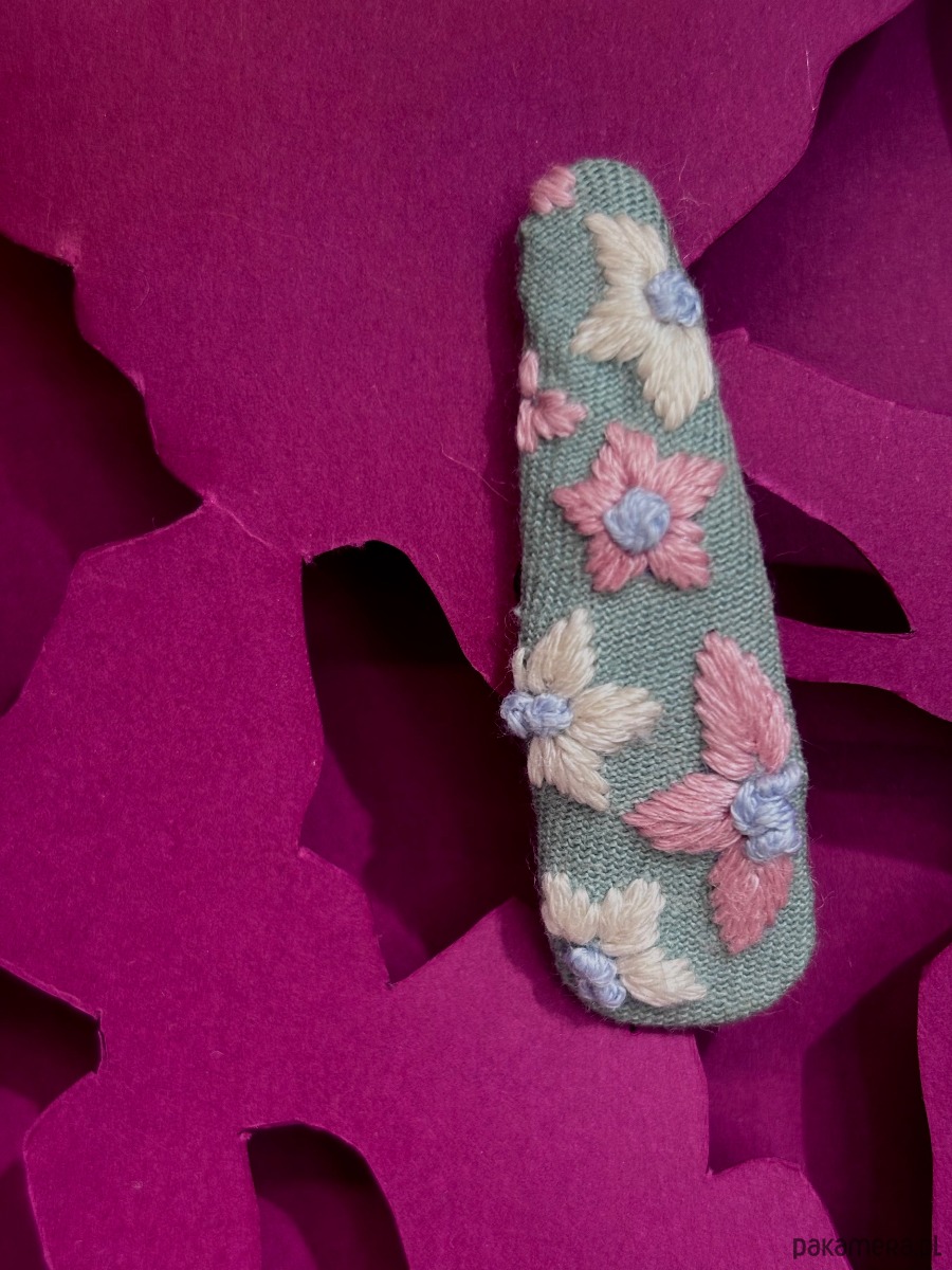 Spinka z różowymi i kremowymi sasankami jest zaprojektowana w Polsce, starannie ręcznie wyszyta bawełnianą muliną na szałwiowej bawełnie, od spodu podszyta wiskozowo-wełnianym filcem.