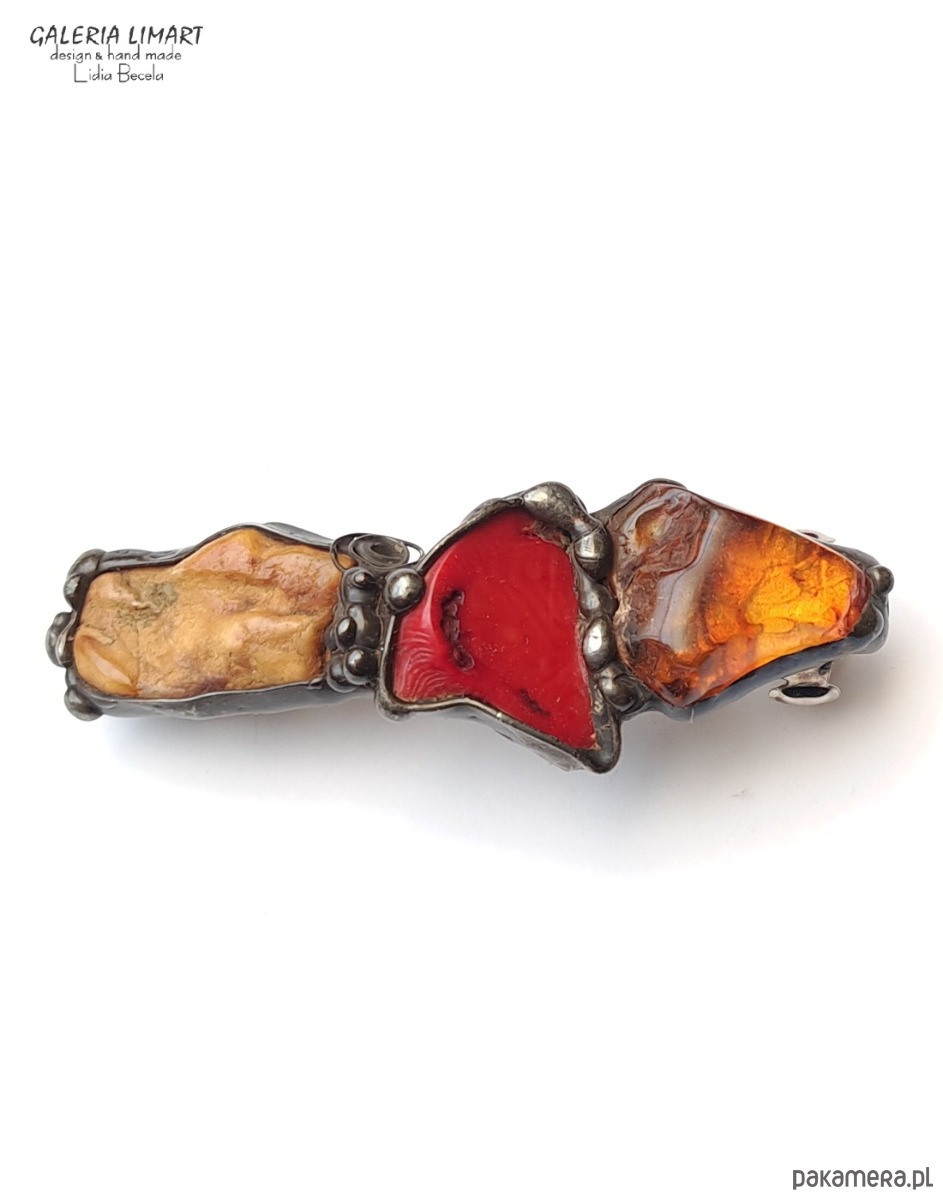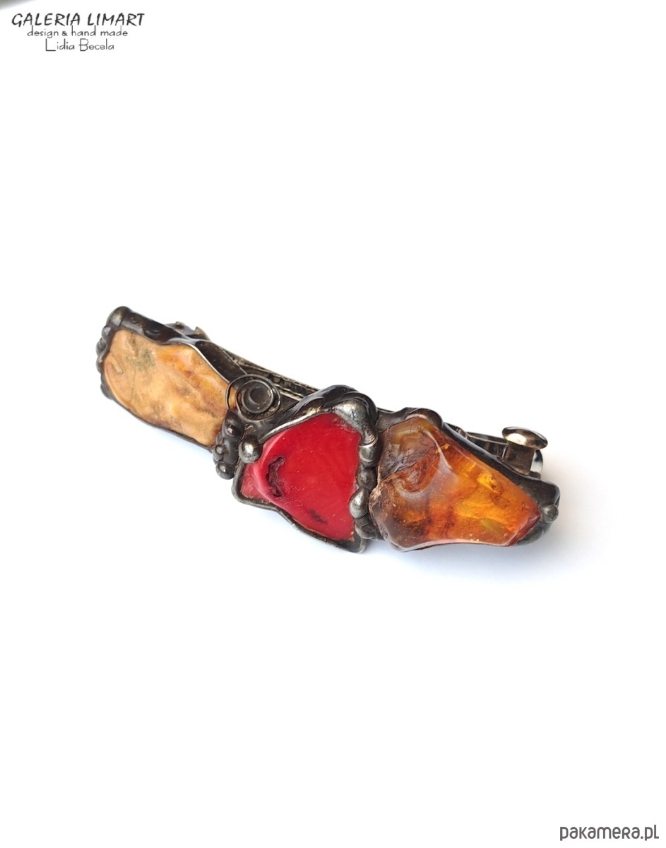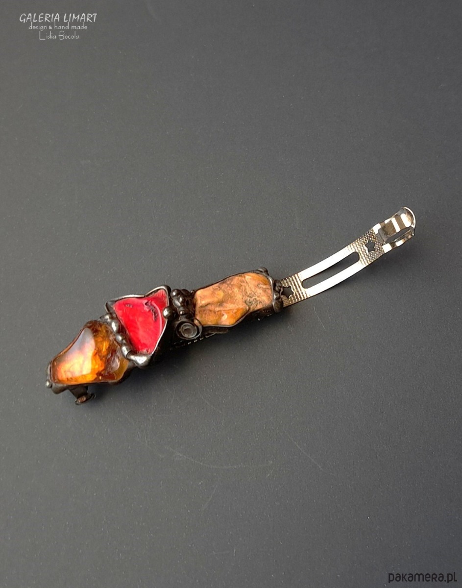 Unikatowa, jedyna w swoim rodzaju (ok. 9 cm) spinka do włosów z prawdziwym koralem tak zwaną "robaczywką" i dwoma bałtyckimi naturalnymi surowymi bursztynami w tym jeden mleczny, wysoko ceniony i jeden miodowy.