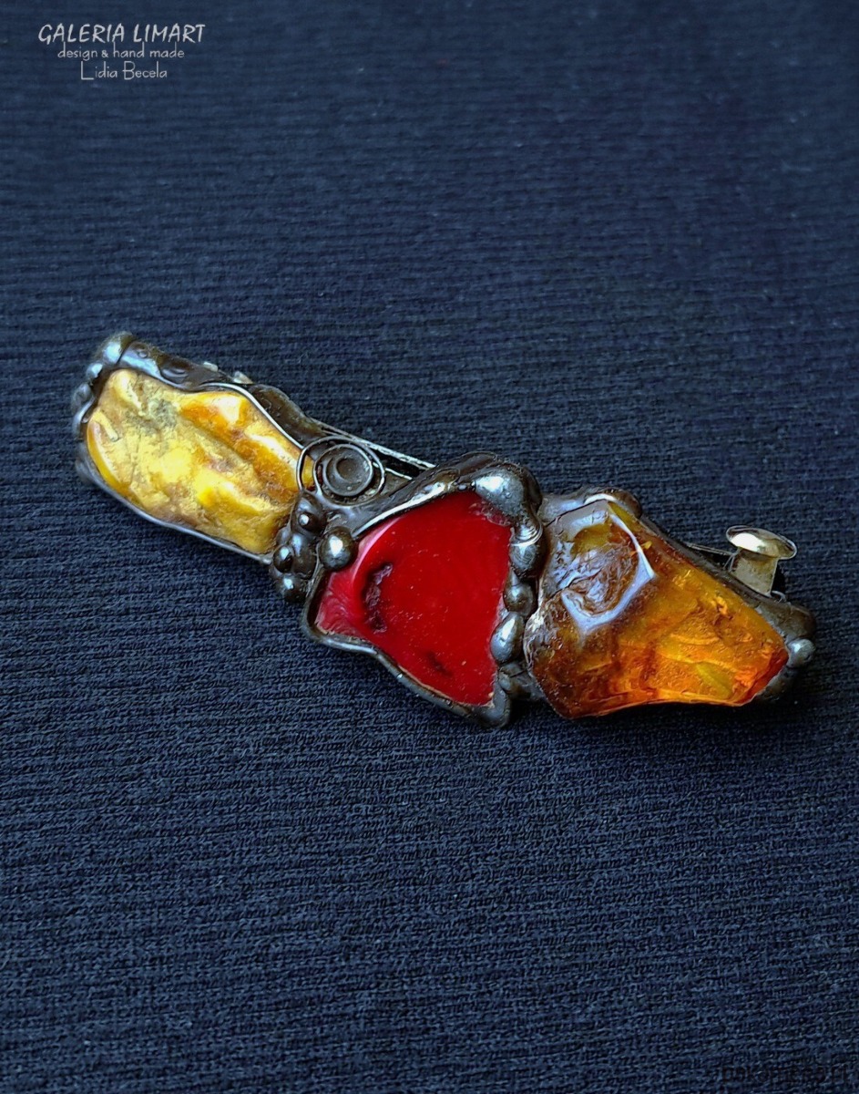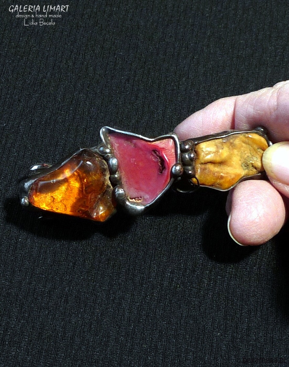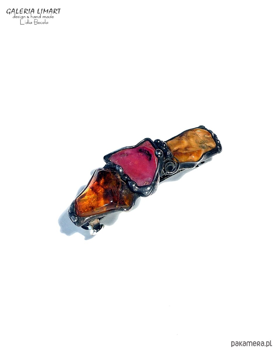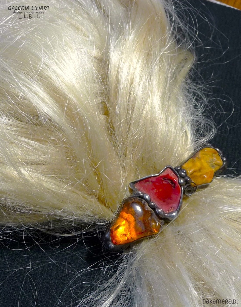 Unikatowa, jedyna w swoim rodzaju (ok. 9 cm) spinka do włosów z prawdziwym koralem tak zwaną "robaczywką" i dwoma bałtyckimi naturalnymi surowymi bursztynami w tym jeden mleczny, wysoko ceniony i jeden miodowy.