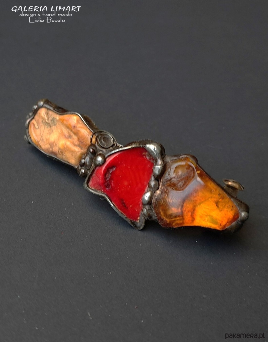 Artystycznie i ekologicznie oprawiona w technice Tiffany, patynowana na kolor starego srebra, co pięknie współgra z bursztynem i koralem.