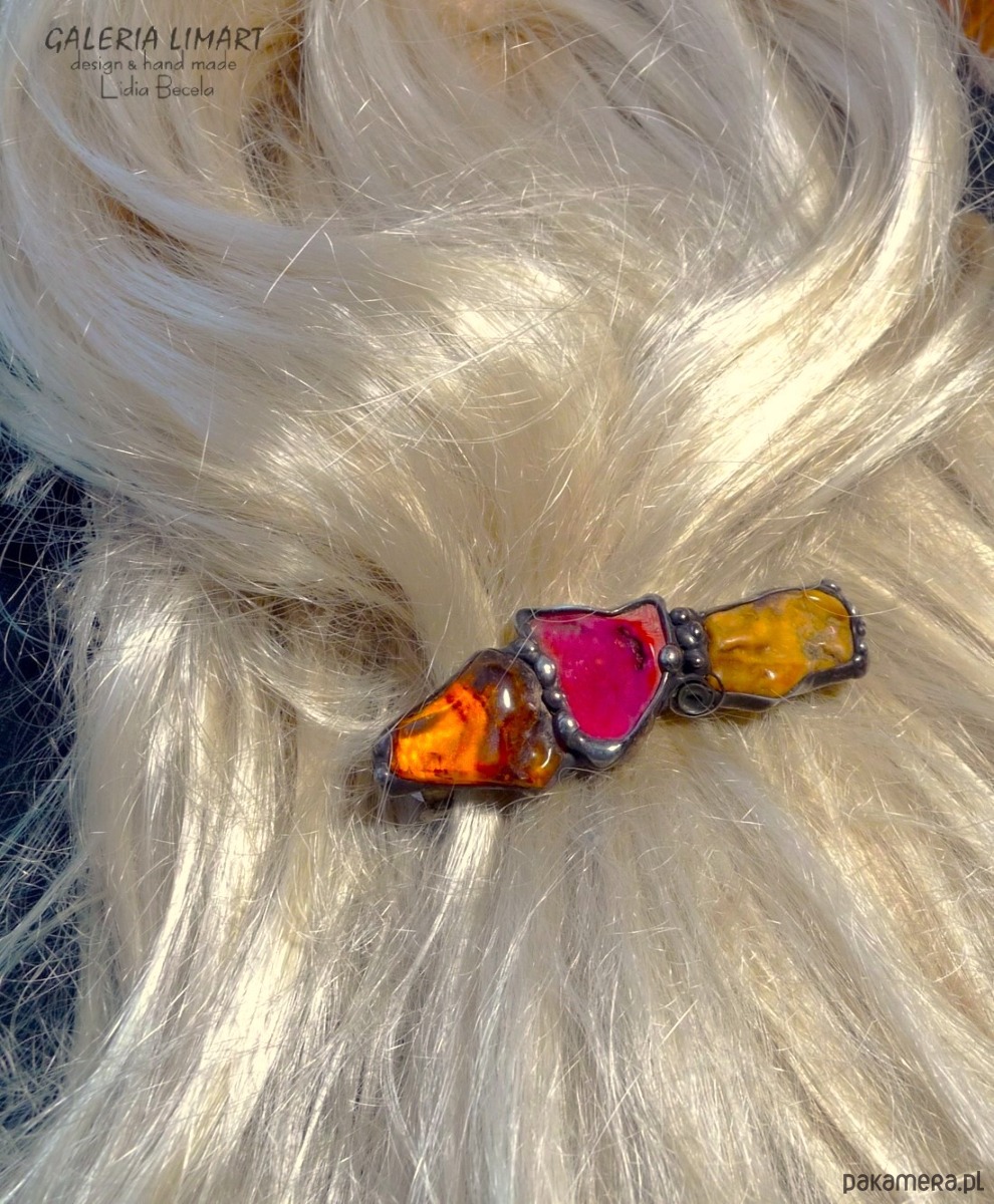 Spinka do włosów z surowego bursztynu bałtyckiego i korala PREZENT z klasą