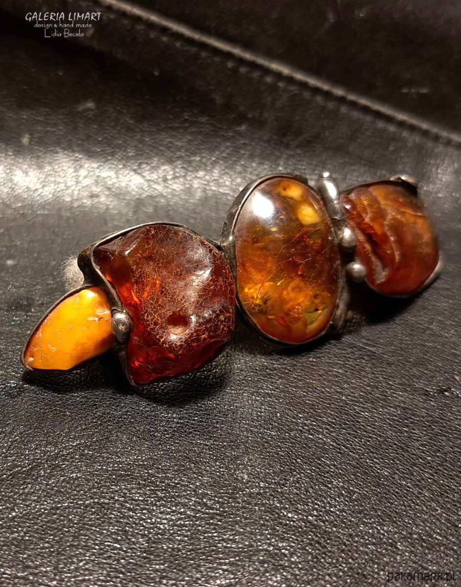 Autorska, UNIKATOWA (wykonana w jednym jedynym egzemplarzu) spinka do włosów z pięknymi surowymi bursztynami bałtyckimi, środkowy element to bursztyny zatopione w żywicy). Unikatowa i ekologiczna oprawa w technice Tiffany. Patynowana na kolor starego srebra, co idealnie współgra z barwą bursztynu.