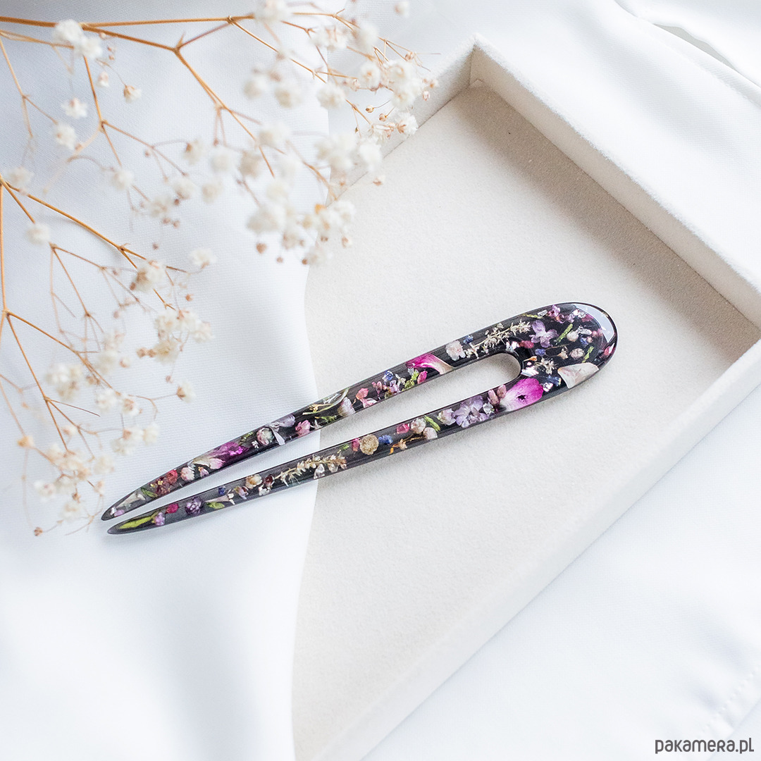 Spinka do włosów wykonana jest z żywicy epoksydowej z wykorzystaniem suszonych kwiatów.