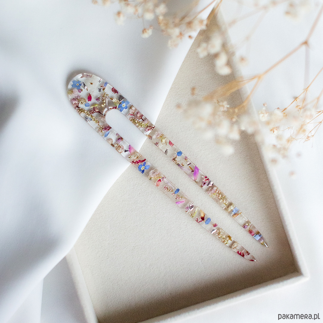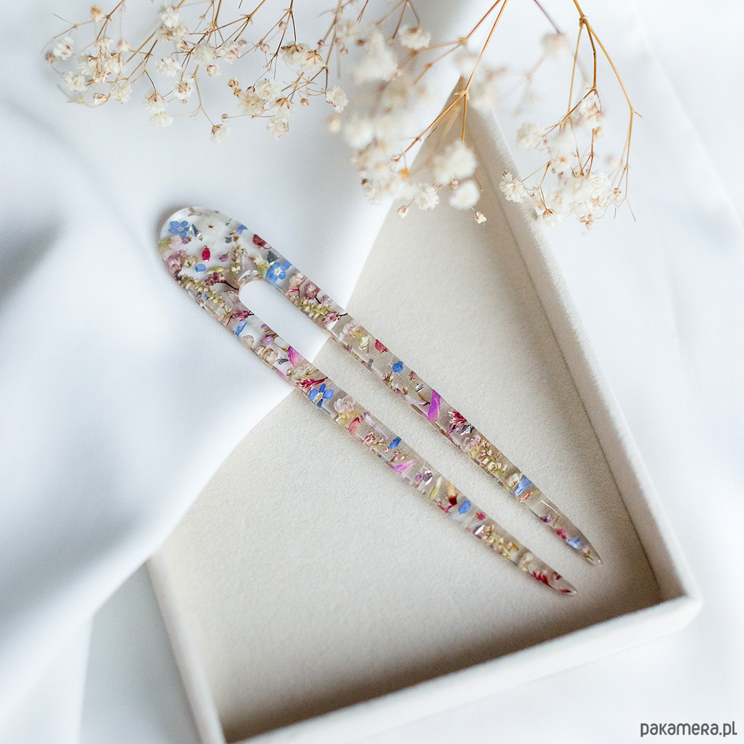 Spinka do włosów wykonana jest z żywicy epoksydowej z wykorzystaniem suszonych kwiatów.