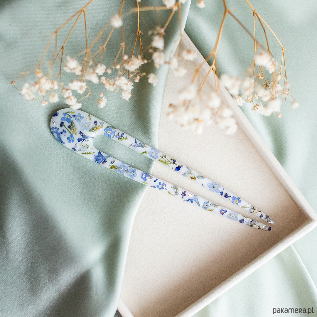 Spinka do włosów wykonana jest z żywicy epoksydowej z wykorzystaniem suszonych kwiatów.