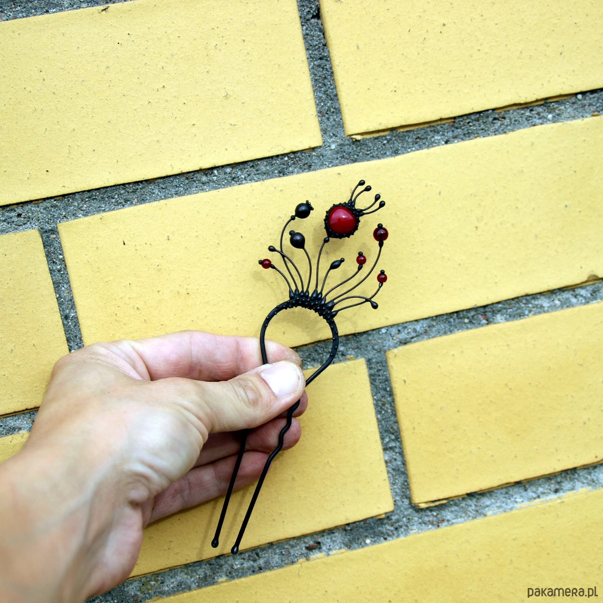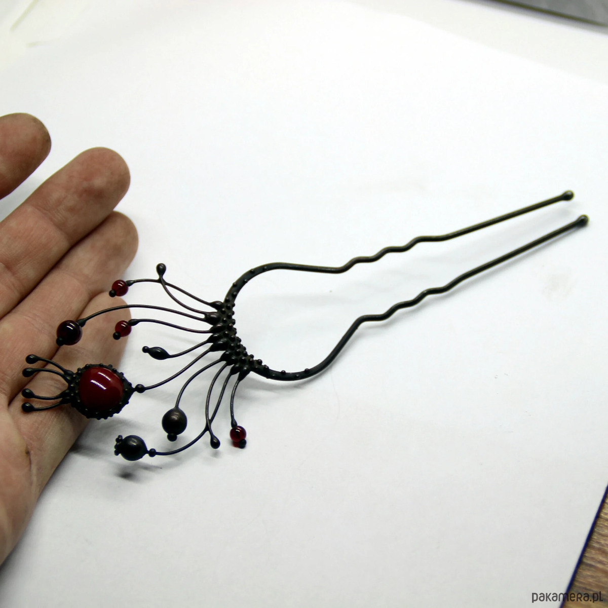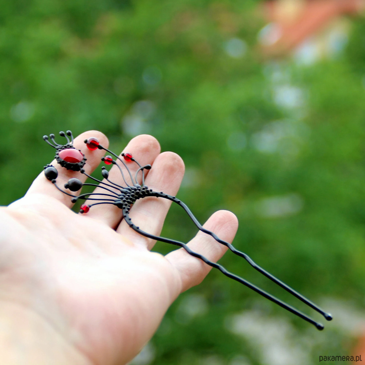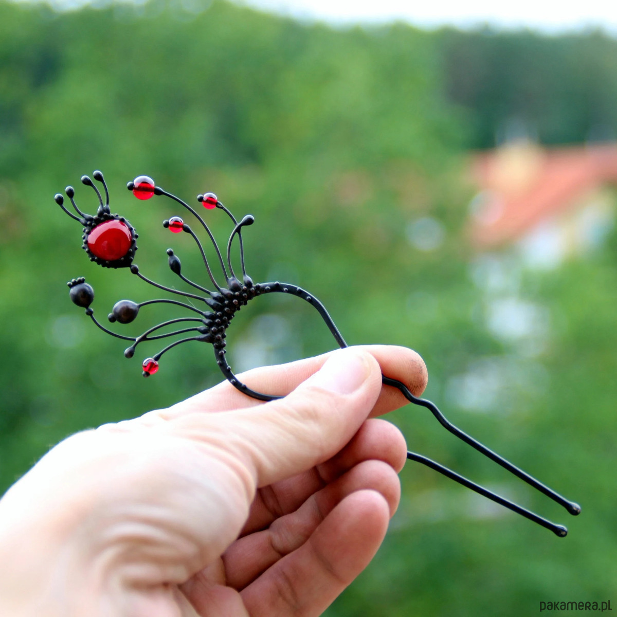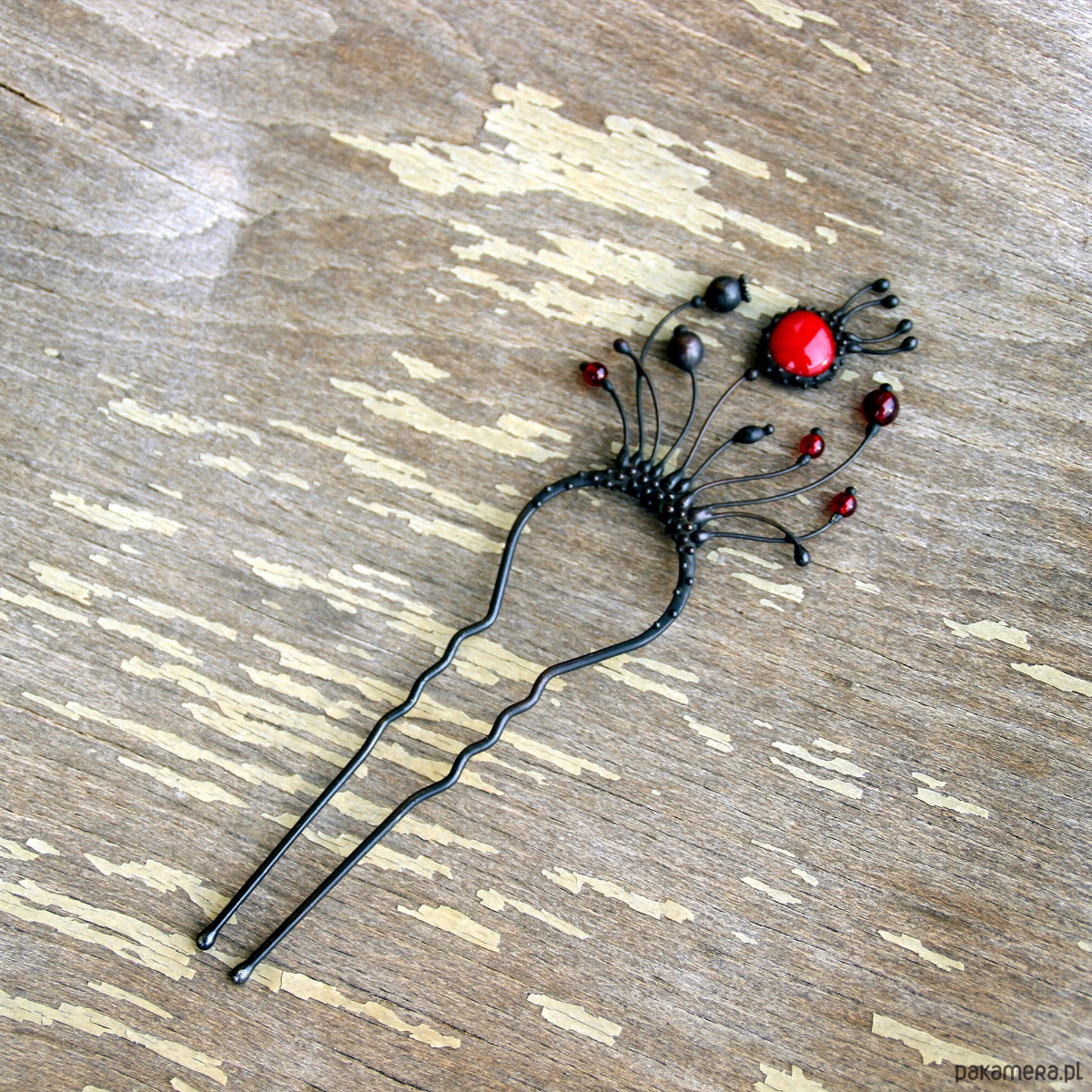 Ręcznie wykonana metalowa spinka do włosów z motywem dzikich kwiatów maku, wykonana z miedzi, cyny, stali i czerwonego szkła. Pokryta patyną i zabezpieczona środkiem przeciwutleniającym, szlifowana, polerowana. Solidna spinka do włosów z motywem dzikich kwiatów maku w stylu witchcraft. Wszystkie elementy są wykonane ręcznie, co zapewnia indywidualność każdego produktu wytworzonego w warsztacie Yadovito. Stop cyny i miedzi jest polerowany roztworem wykończeniowym, aby nadać biżuterii szlachetny wygląd, a jednocześnie zapobiec utlenianiu się metalu. Rozmiar około 14,5/5 cm. Kolor czarny/czerwony.