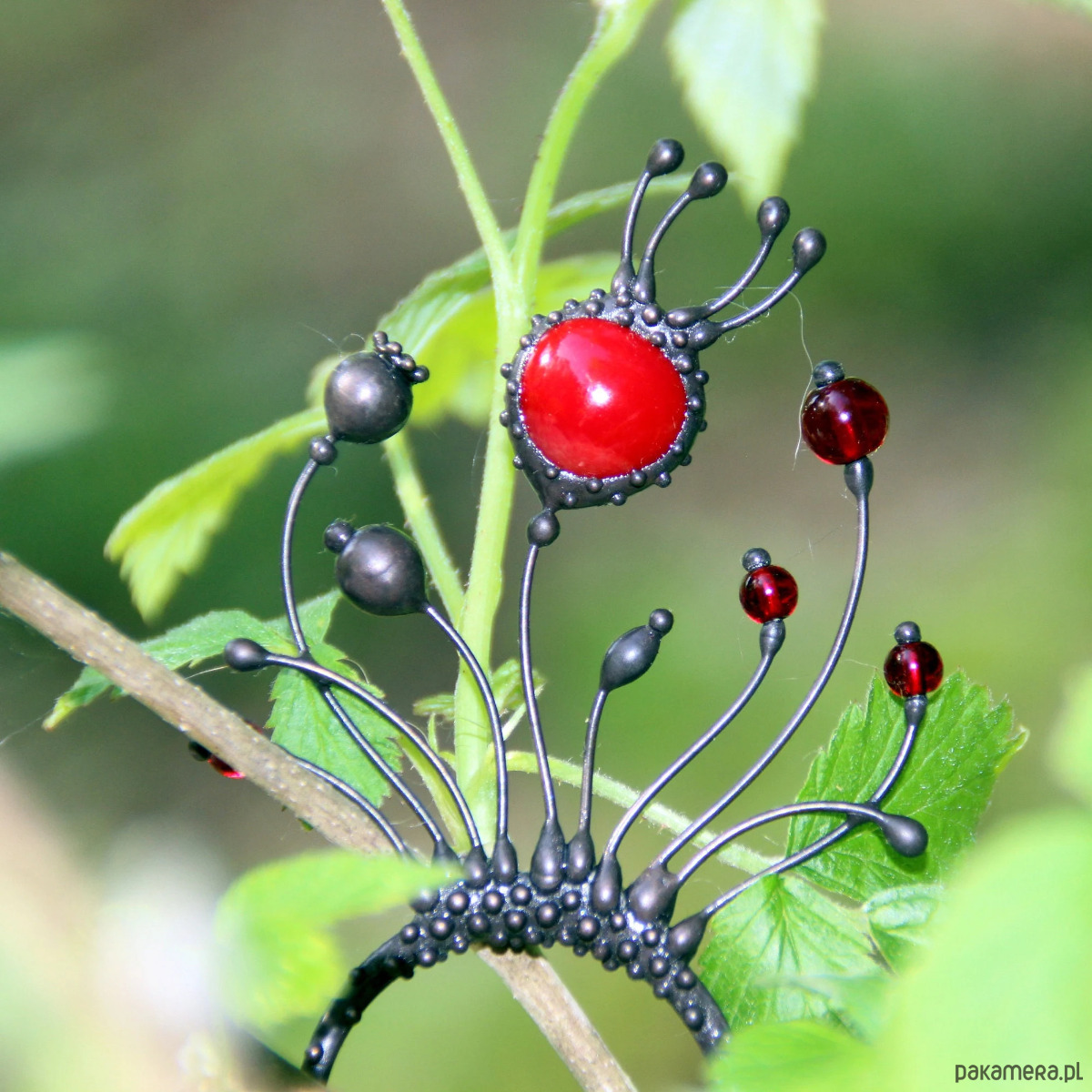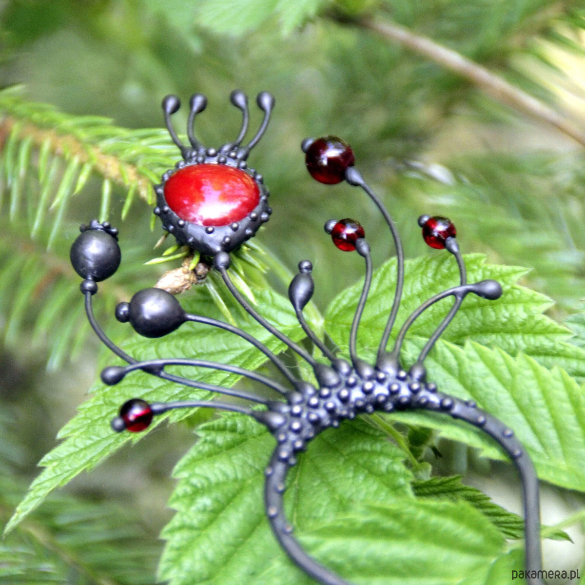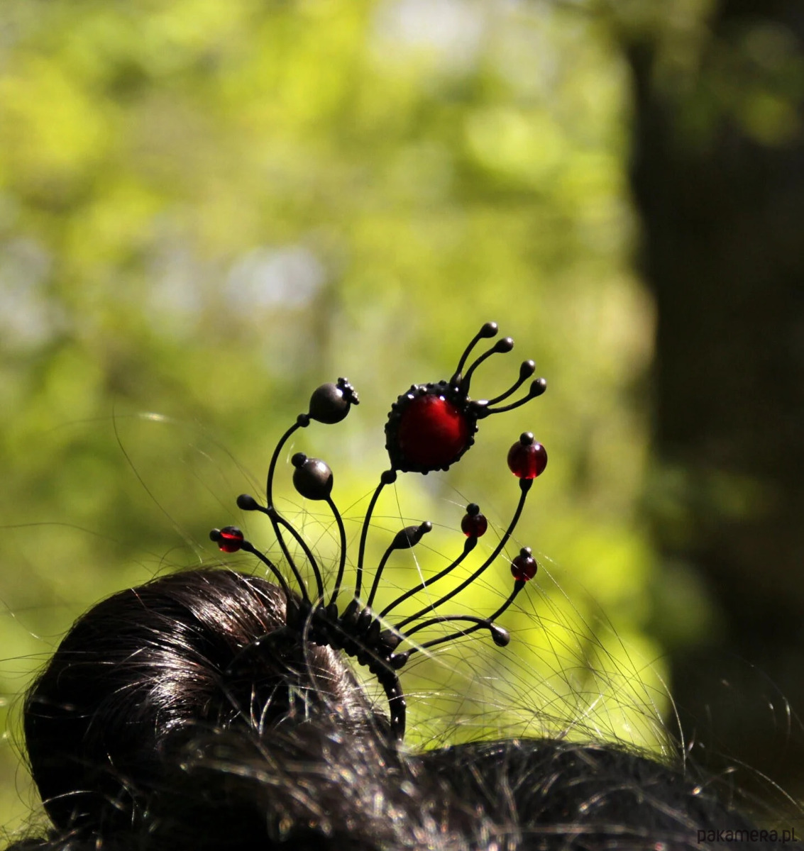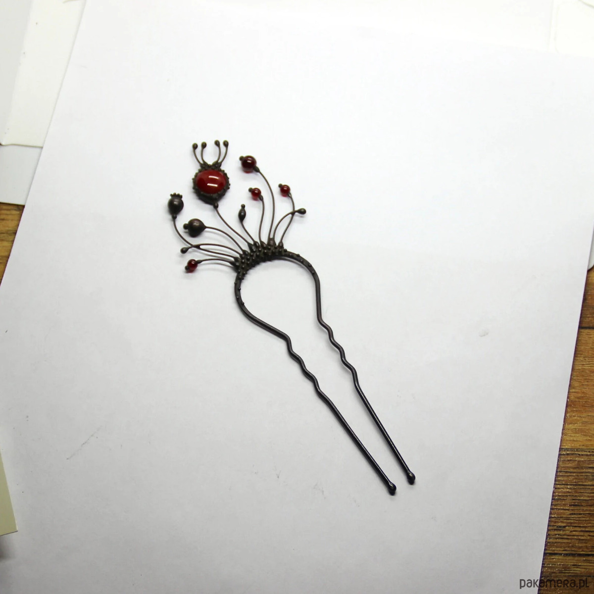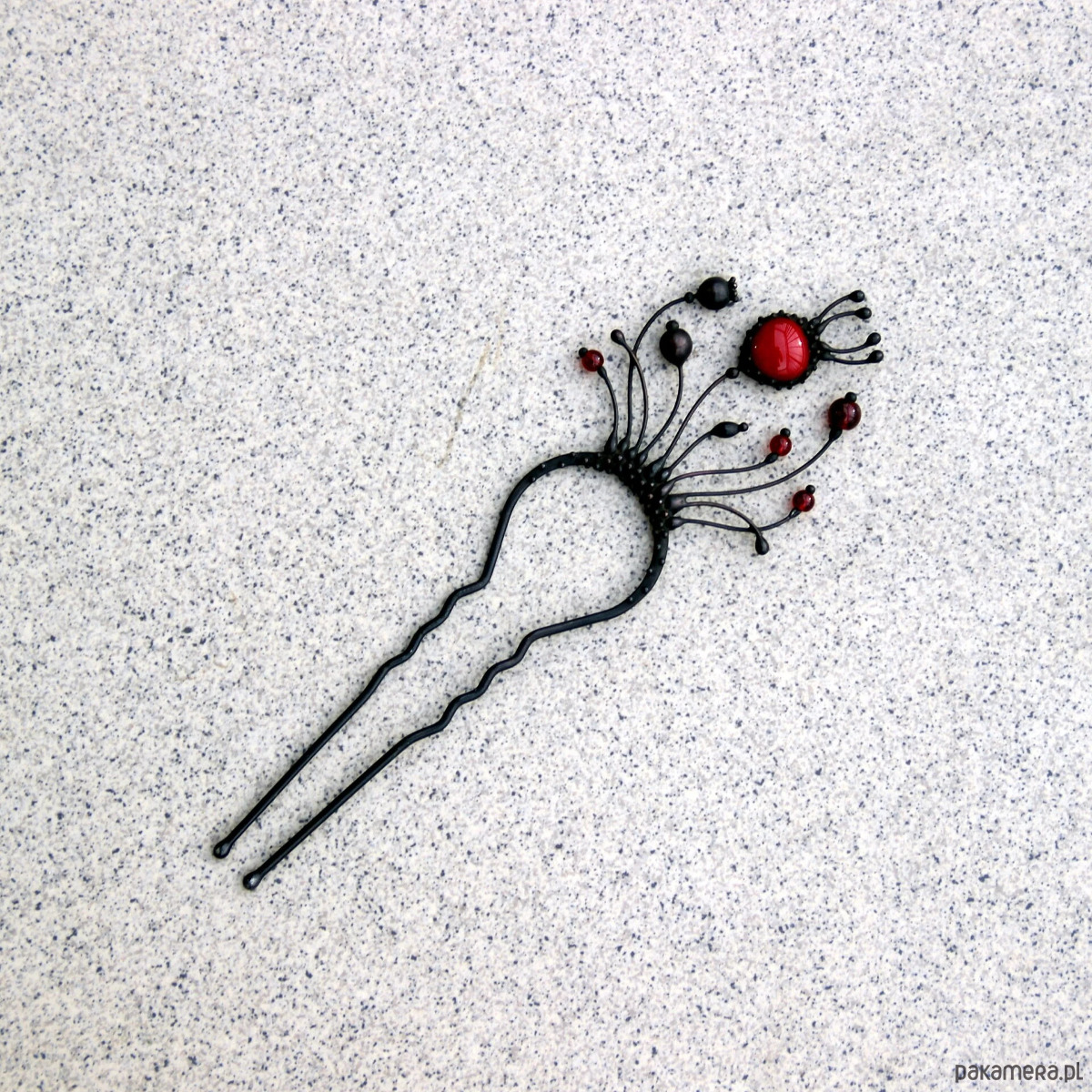Ręcznie wykonana metalowa spinka do włosów z motywem dzikich kwiatów maku, wykonana z miedzi, cyny, stali i czerwonego szkła. Pokryta patyną i zabezpieczona środkiem przeciwutleniającym, szlifowana, polerowana. Solidna spinka do włosów z motywem dzikich kwiatów maku w stylu witchcraft. Wszystkie elementy są wykonane ręcznie, co zapewnia indywidualność każdego produktu wytworzonego w warsztacie Yadovito. Stop cyny i miedzi jest polerowany roztworem wykończeniowym, aby nadać biżuterii szlachetny wygląd, a jednocześnie zapobiec utlenianiu się metalu. Rozmiar około 14,5/5 cm. Kolor czarny/czerwony.