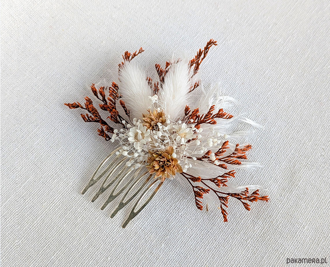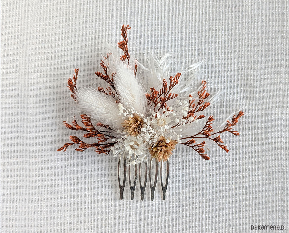 Wyjątkowa spinka do włosów „Brązowa Łąka” wykonana z naturalnych, starannie suszonych kwiatów, które zachwycają swoją autentycznością i subtelnym pięknem. Kompozycja w ciepłych, ziemistych odcieniach brązu, beżu i delikatnej zieleni przywołuje klimat spokojnej, jesiennej łąki, dodając stylizacji naturalnego uroku i elegancji. Każda spinka jest unikatowa – układ kwiatów może się nieznacznie różnić, co podkreśla jej rękodzielniczy charakter. Solidna baza zapewnia wygodne i stabilne utrzymanie we włosach, dzięki czemu idealnie sprawdzi się zarówno na co dzień, jak i podczas wyjątkowych okazji. To doskonały wybór dla osób ceniących naturę, oryginalność i delikatne, romantyczne dodatki.