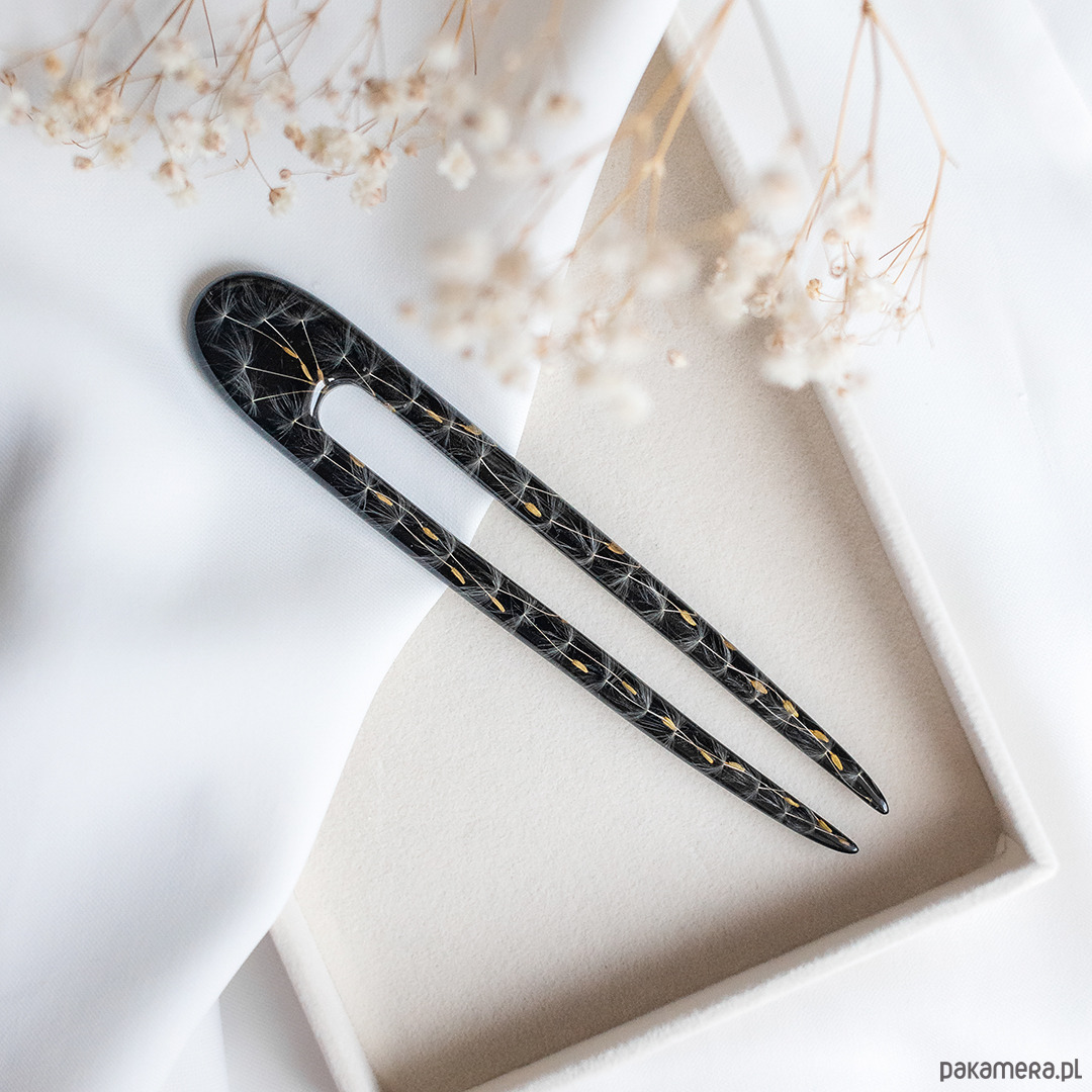 Dodaj odrobinę magii do swojej stylizacji dzięki unikalnej szpilce do włosów, wykonanej ręcznie z przezroczystej żywicy. W jej wnętrzu zamknięty został prawdziwy dmuchawiec, który symbolizuje lekkość, marzenia i ulotne piękno natury.