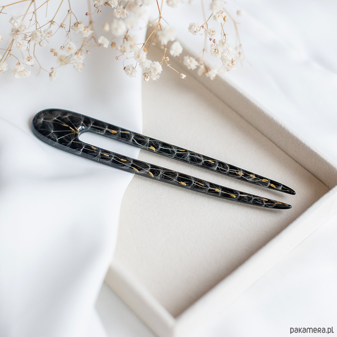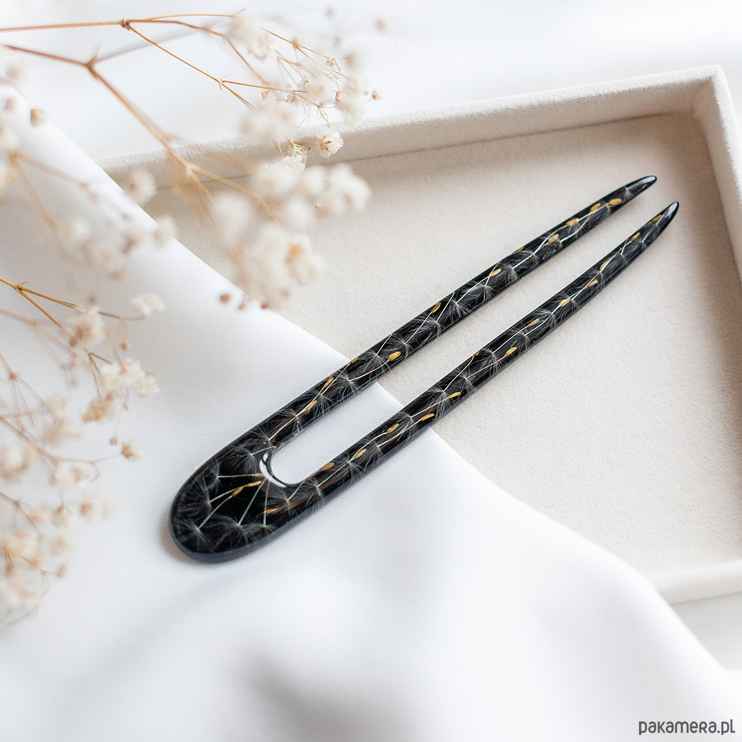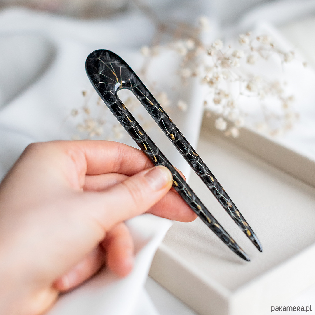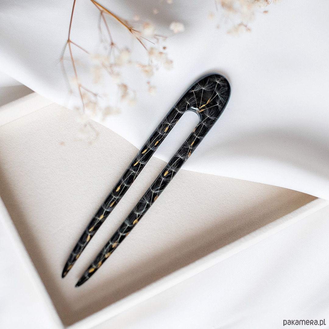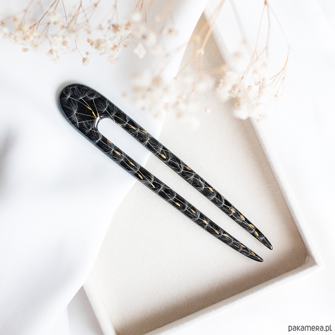 Dodaj odrobinę magii do swojej stylizacji dzięki unikalnej szpilce do włosów, wykonanej ręcznie z przezroczystej żywicy. W jej wnętrzu zamknięty został prawdziwy dmuchawiec, który symbolizuje lekkość, marzenia i ulotne piękno natury.