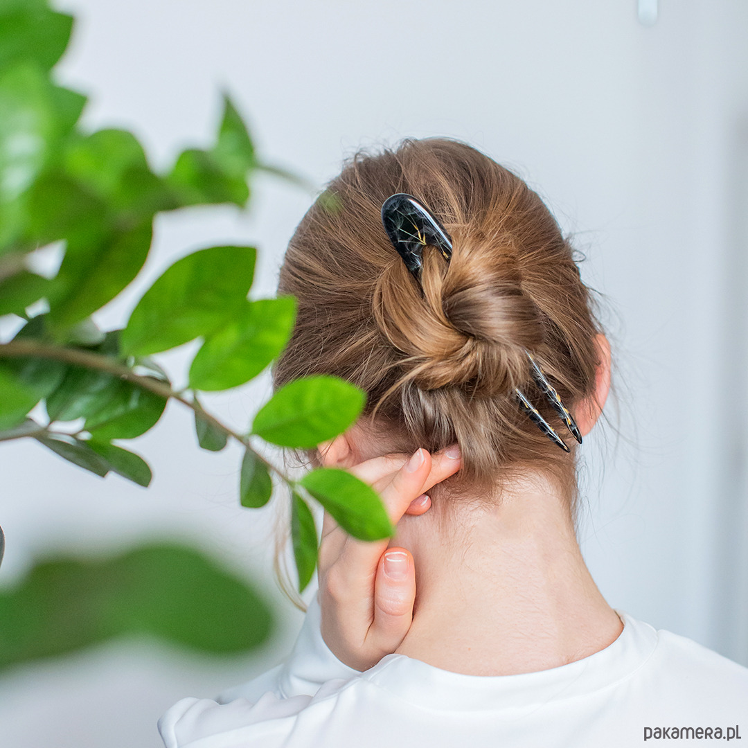 Spinka do włosów wykonana jest z żywicy epoksydowej z wykorzystaniem suszonych kwiatów.