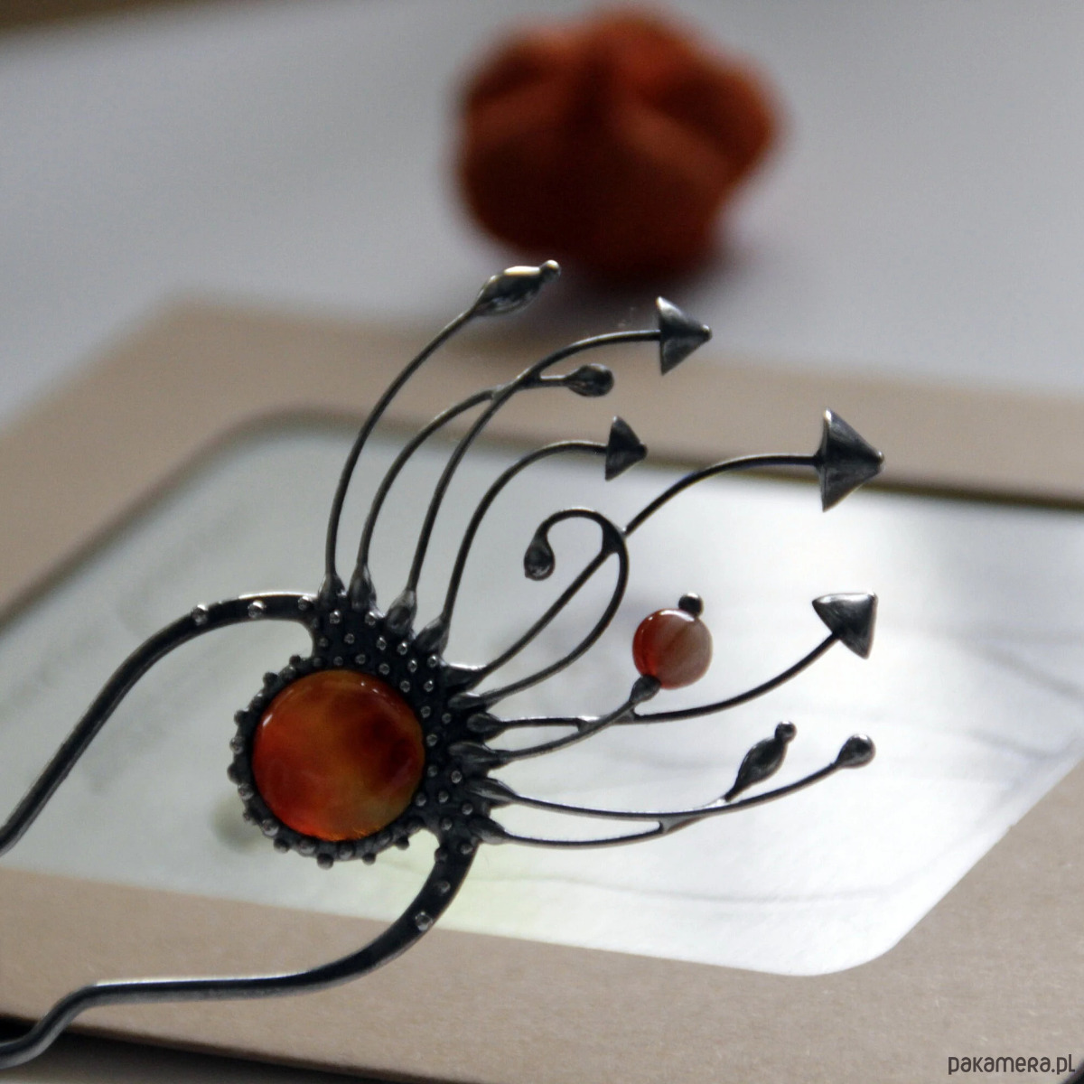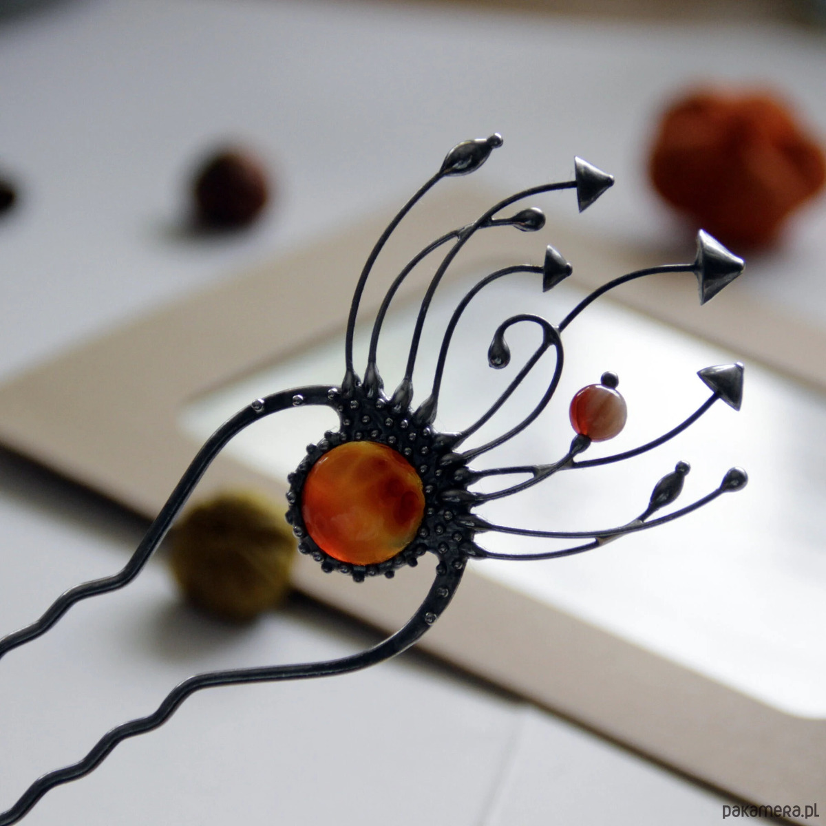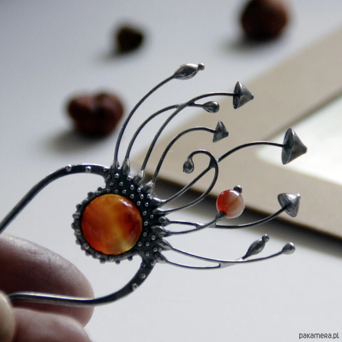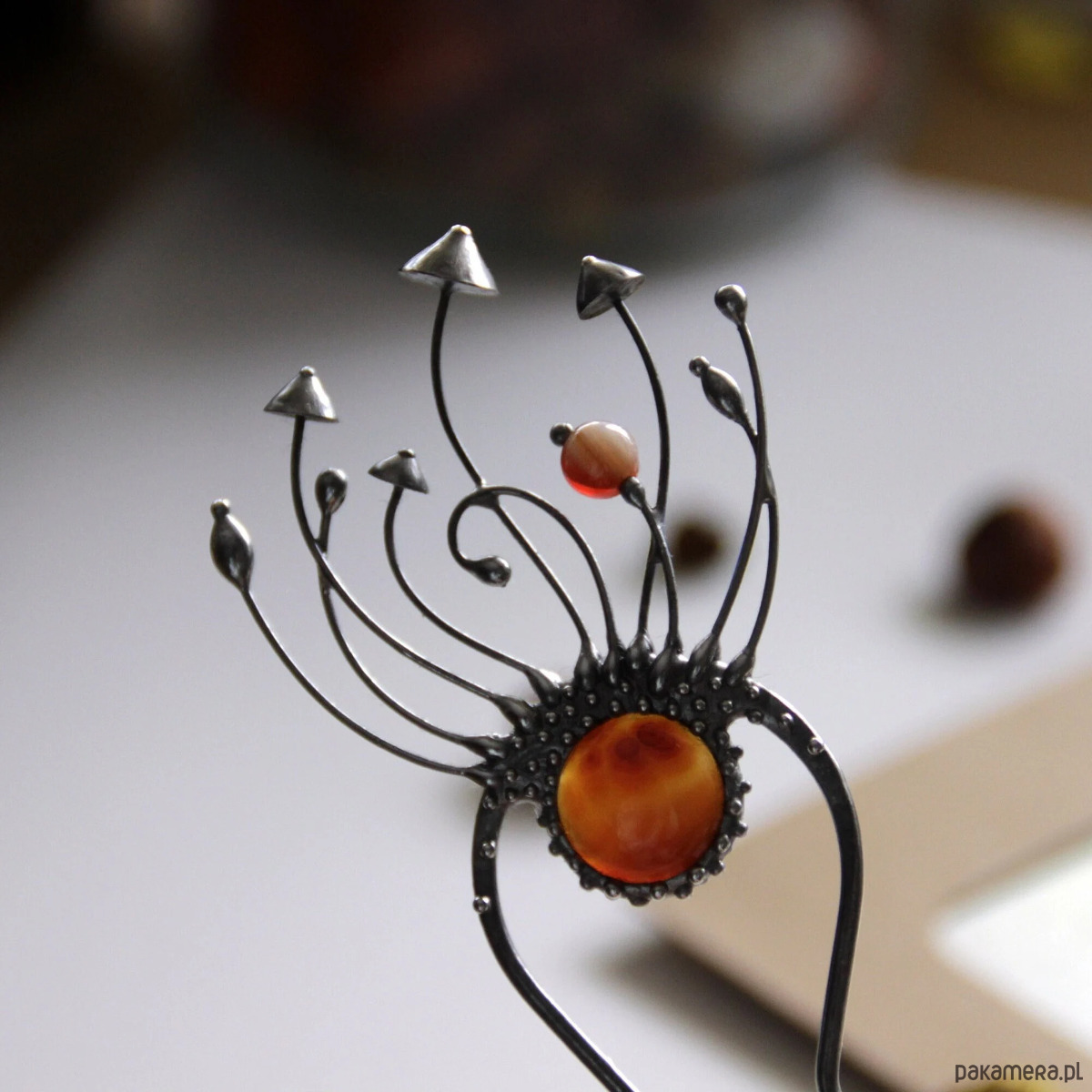 Srebrna metalowa magiczna grzybowa spinka do włosów w stylu cottagecore i czarownic. Poddana obróbce antyoksydacyjnej, szlifowana, polerowana. Niezwykła i solidna biżuteria w stylu czarownic, inspirowana dziką naturą. Wszystkie elementy są wykonane ręcznie, co zapewnia indywidualność każdego produktu wytworzonego w warsztacie Yadovito. Stop cyny i miedzi jest polerowany roztworem wykończeniowym, aby nadać biżuterii szlachetny wygląd, a jednocześnie zapobiec utlenianiu się metalu. Rozmiar około 14,5/4,5 cm. Kolor srebrny/brązowy.
