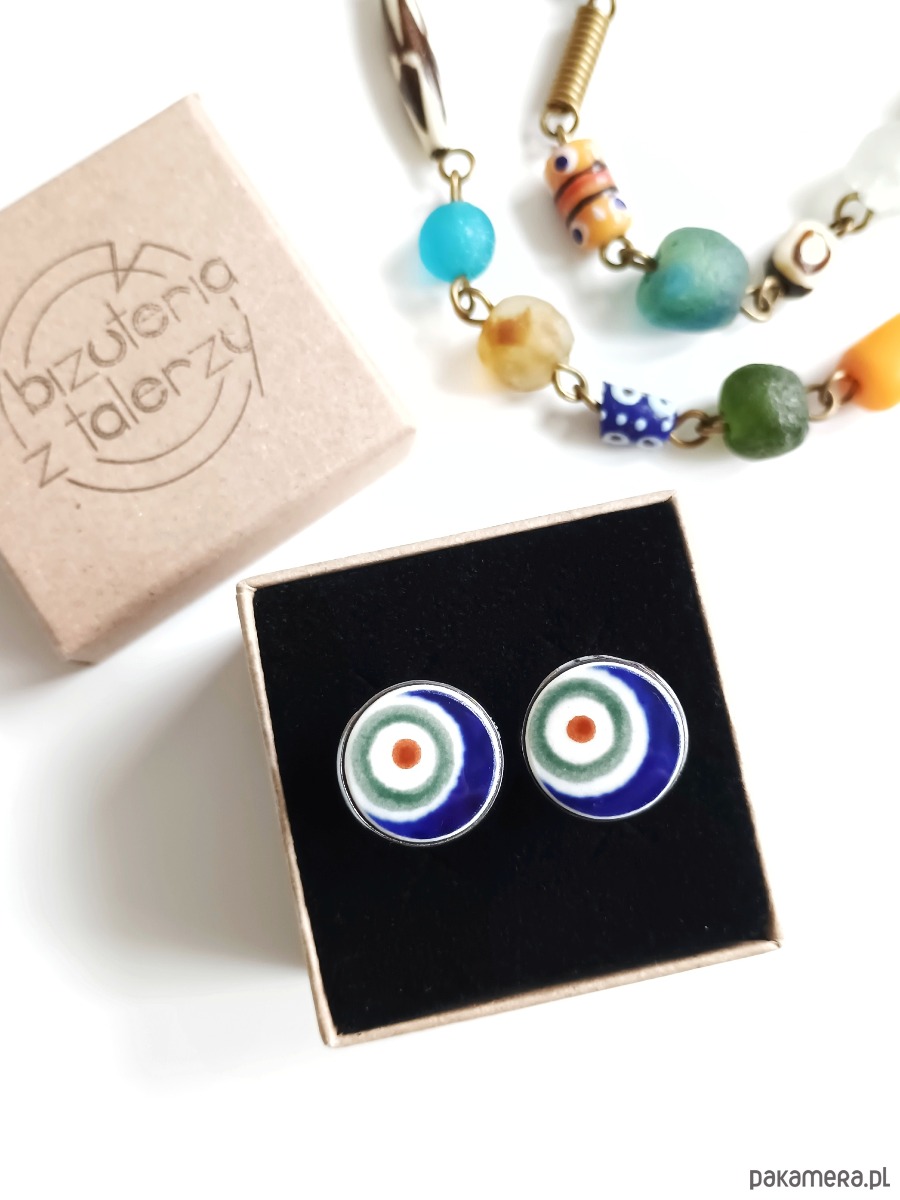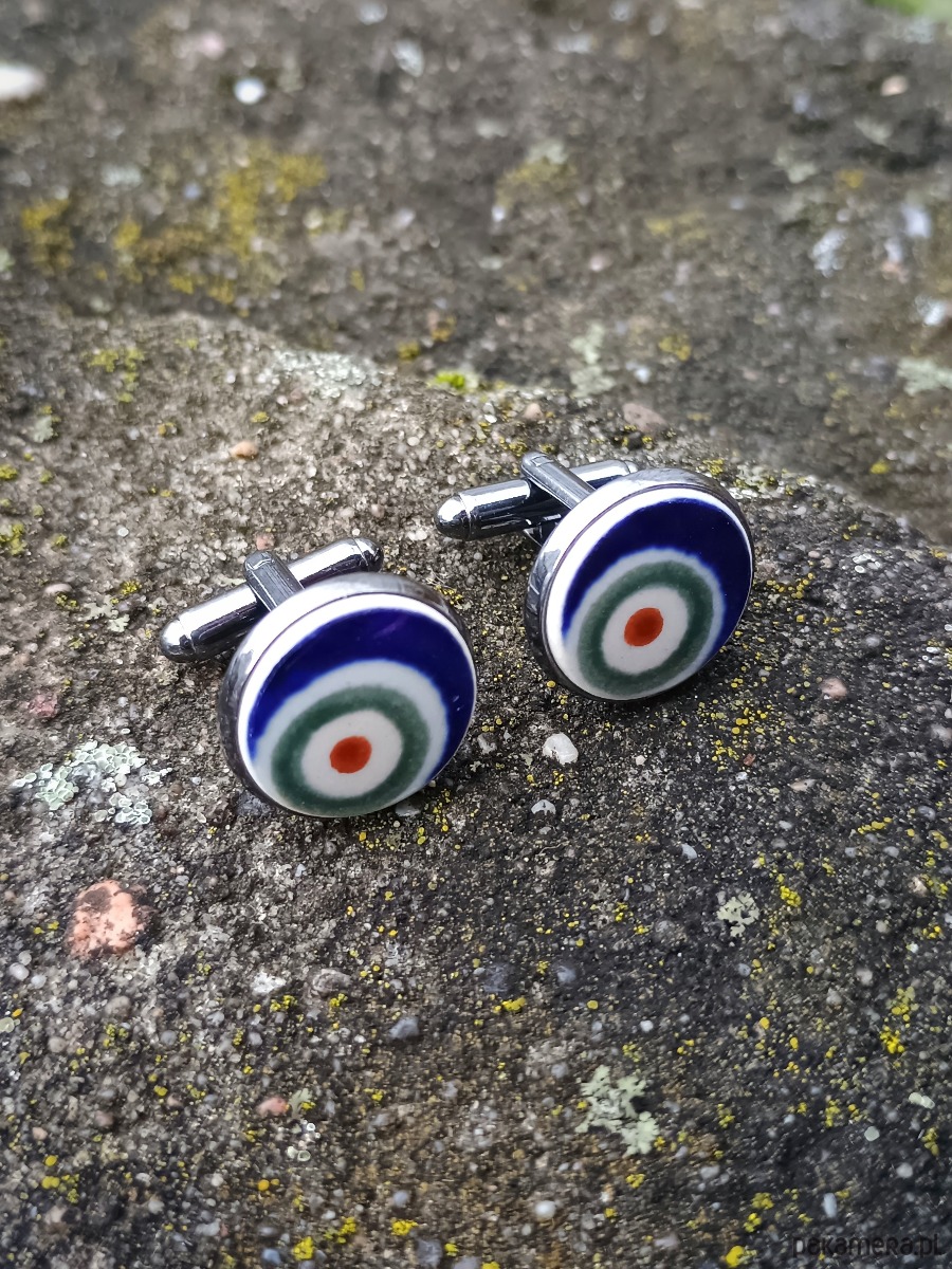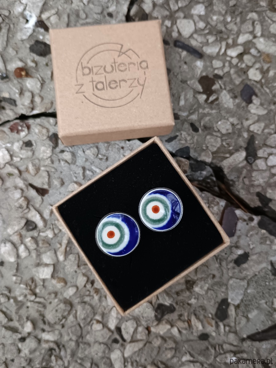 Ceramika w Bolesławcu i jego okolicach produkowana była już w XIV wieku. Do dziś najważniejszy surowiec, czyli glina wydobywany jest na miejscu, a tradycja wyrobu naczyń ceramicznych, rozwijana i kultywowana przez wieki - trwa. Bolesławiec jako marka, tworzona przez kilkadziesiąt różnych manufaktur, znana jest na całym świecie, a charakterystycznego wzoru w kobaltowe kropki nie sposób pomylić z żadnym innym. Co najbardziej wyróżnia Bolesławiec, to że szkliwo nakładane jest ręcznie, za pomocą stempelków z gąbki. Oto spinki do mankietów, które wykonałam z fragmentów stłuczonego kubka, wykonanego właśnie w Bolesławcu (dekoracja nr 8, pawie oko). Kawałki stłuczki oszlifowałam w okrągłe kształty i połączyłam z metalowymi zapięciami w kolorze grafitowym. Ceramikę zeszlifowałam również z grubości - jest cieńsza niż pierwotnie, dzięki czemu spinki nie są masywne. Brzegi pokryłam lakierem, co sprawia, że nie brudzą się i nie chłoną wilgoci. Średnica elementów ceramicznych: 16 mm. Unikat - każdy z moich wyrobów występuje w jednym egzemplarzu. Upcykling - nie reprodukuję wykorzystywanych wzorów, niczego nie domalowuję - wykorzystuję wyłącznie oryginalne naczynia i motywy, które się na nich znajdują. Tym samym, stłuczce z odzysku nadaję nowe życie.