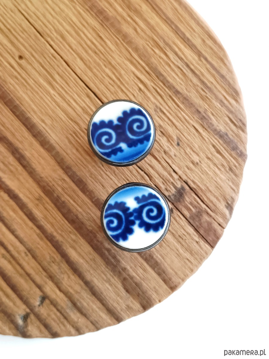 Ceramika w Bolesławcu i jego okolicach produkowana była już w XIV wieku. Do dziś najważniejszy surowiec, czyli glina wydobywany jest na miejscu, a tradycja wyrobu naczyń ceramicznych, rozwijana i kultywowana przez wieki - trwa. Bolesławiec jako marka, tworzona przez kilkadziesiąt różnych manufaktur, znana jest na całym świecie, a charakterystycznego wzoru w kobaltowe kropki nie sposób pomylić z żadnym innym. Co najbardziej wyróżnia Bolesławiec, to że szkliwo nakładane jest ręcznie, za pomocą stempelków z gąbki. Oto spinki do mankietów, które wykonałam z fragmentów stłuczonego kubka, wykonanego właśnie w Bolesławcu. Kawałki stłuczki oszlifowałam w okrągłe kształty i połączyłam z metalowymi zapięciami w kolorze grafitowym. Ceramikę zeszlifowałam również z grubości - jest cieńsza niż pierwotnie, dzięki czemu spinki nie są masywne. Brzegi pokryłam lakierem, co sprawia, że nie brudzą się i nie chłoną wilgoci. Średnica elementów ceramicznych: 16 mm. Unikat - każdy z moich wyrobów występuje w jednym egzemplarzu. Upcykling - nie reprodukuję wykorzystywanych wzorów, niczego nie domalowuję - wykorzystuję wyłącznie oryginalne naczynia i motywy, które się na nich znajdują. Tym samym, stłuczce z odzysku nadaję nowe życie.