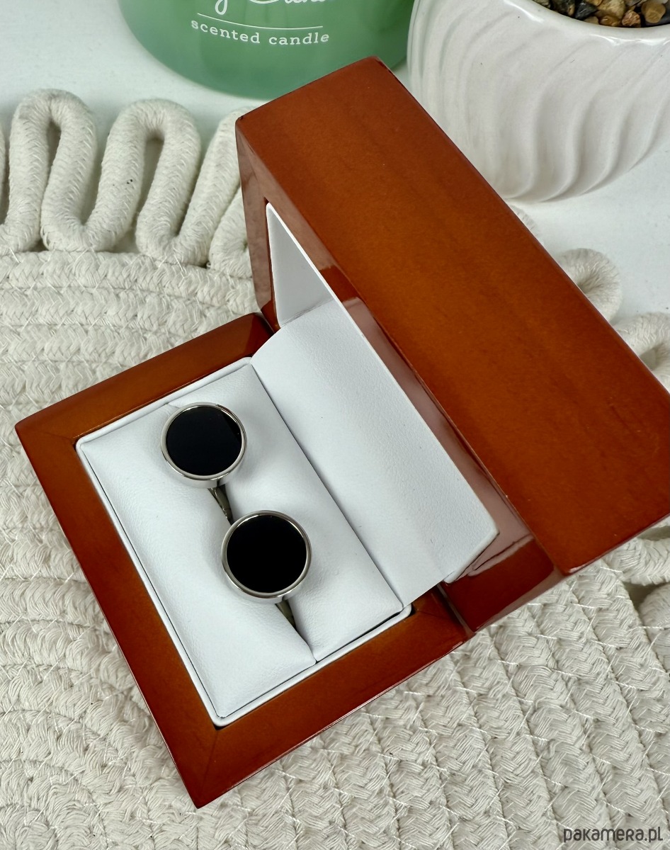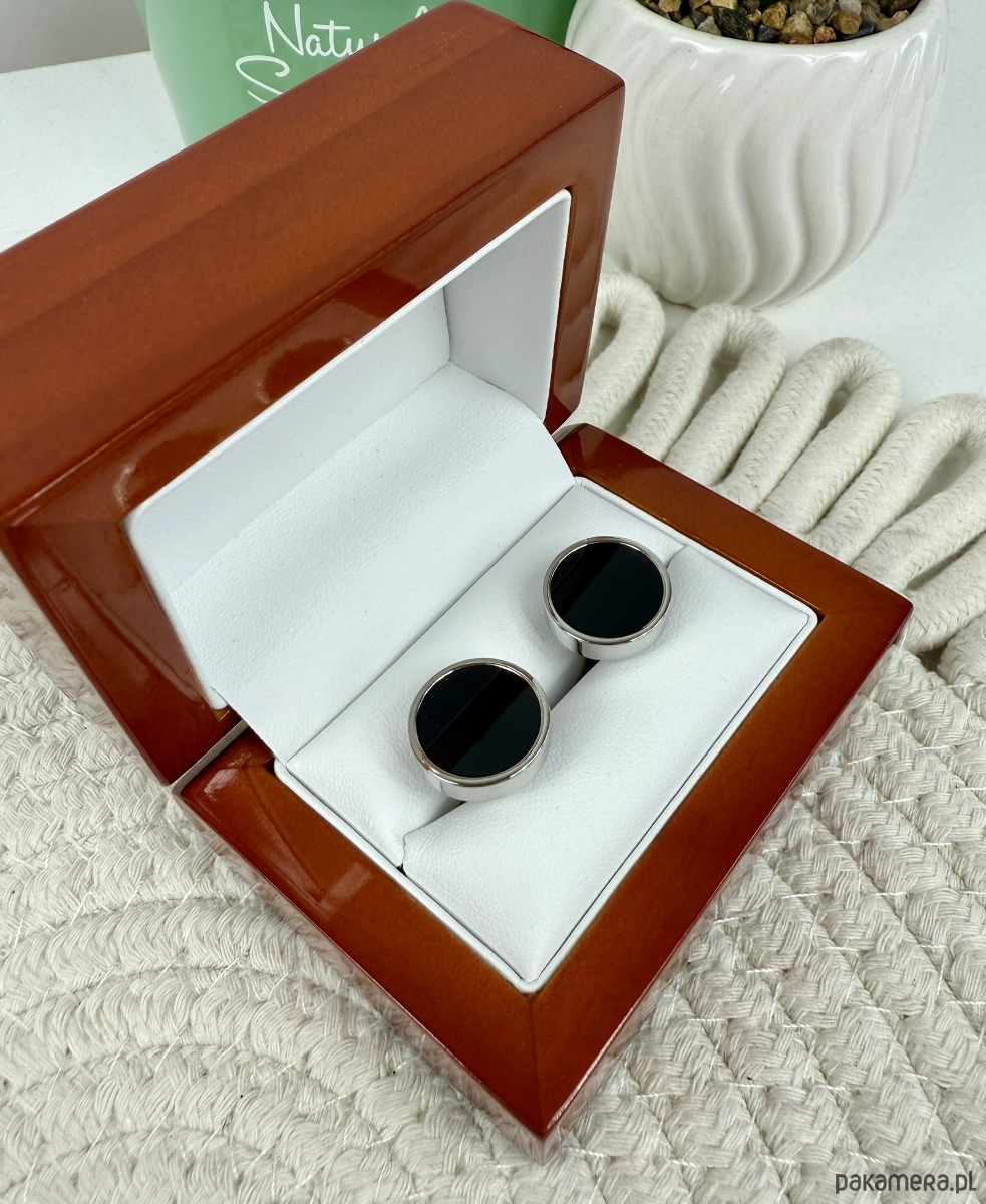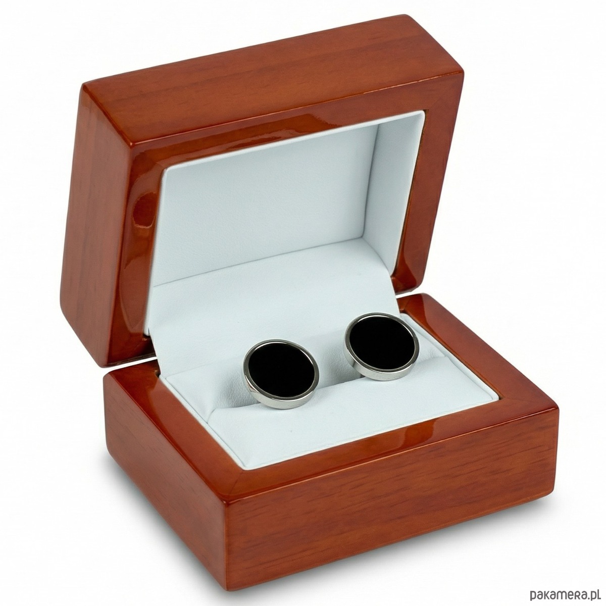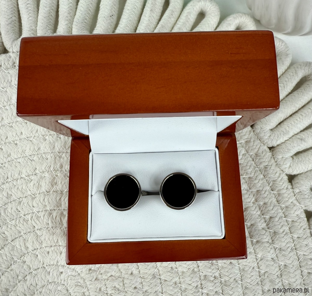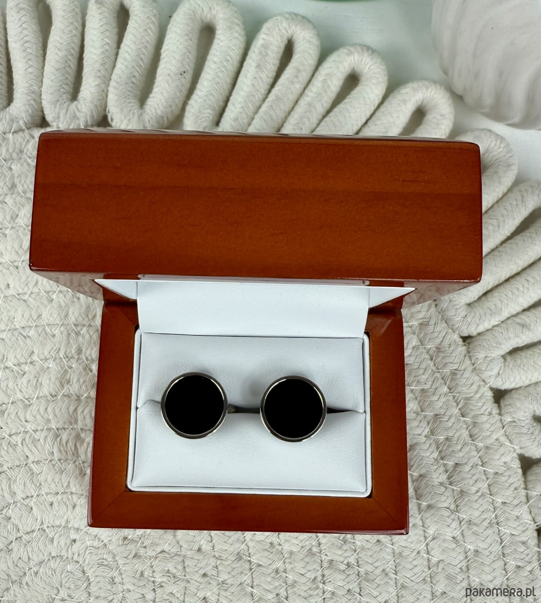 Spinki zapakowane w drewniane pudełko wykończone na wysoki połysk