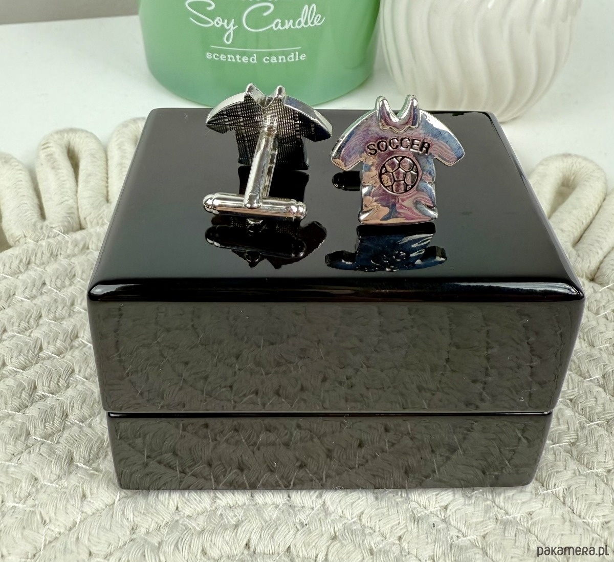 Spinki zapakowane w drewniane pudełko wykończone na wysoki połysk