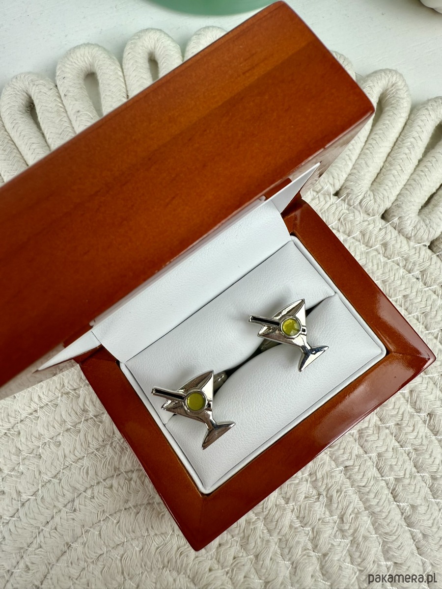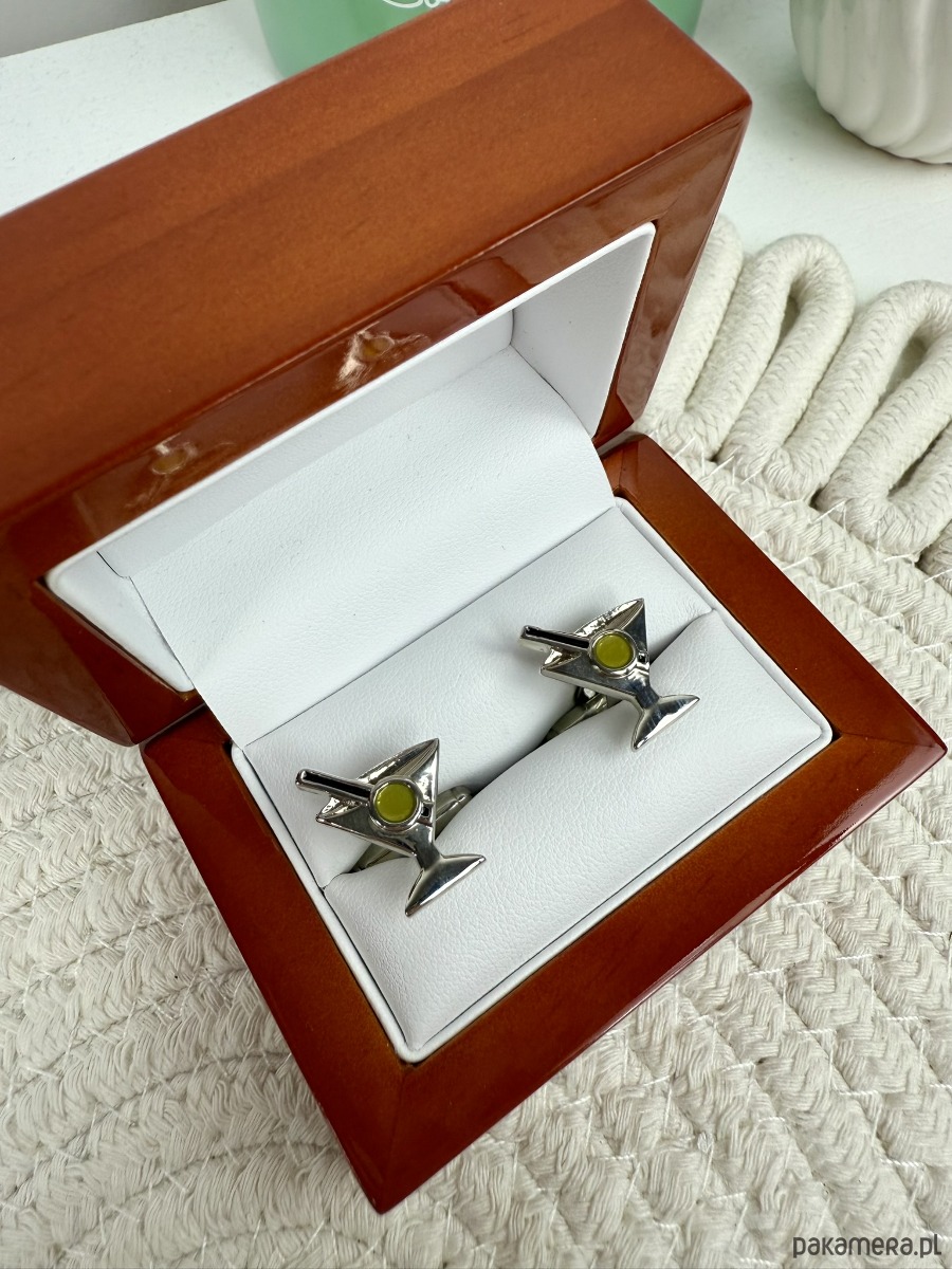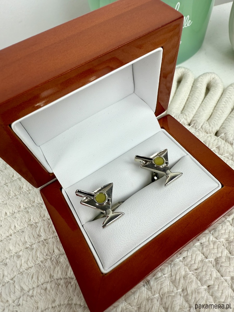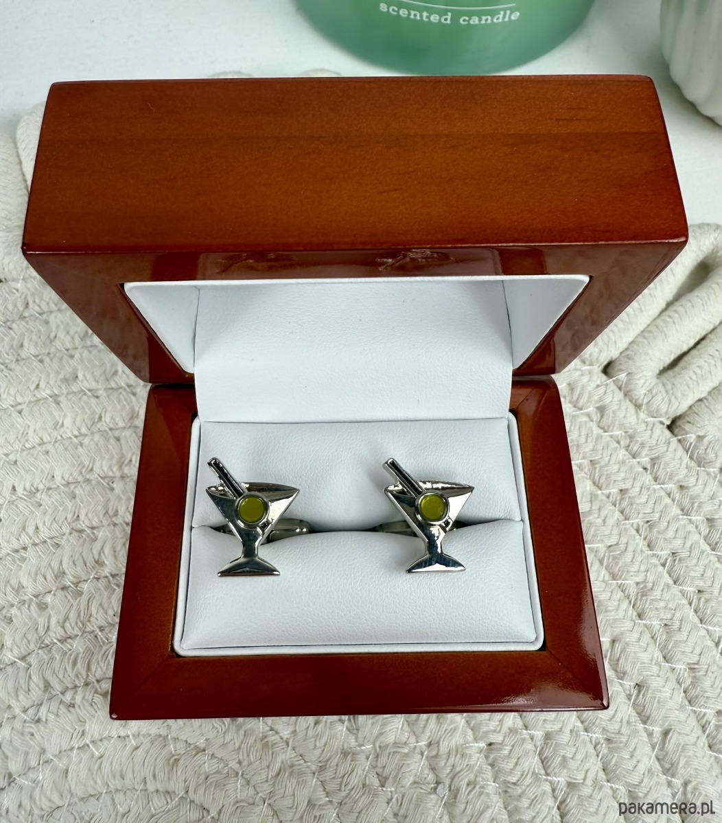 Spinki zapakowane w drewniane pudełko wykończone na wysoki połysk