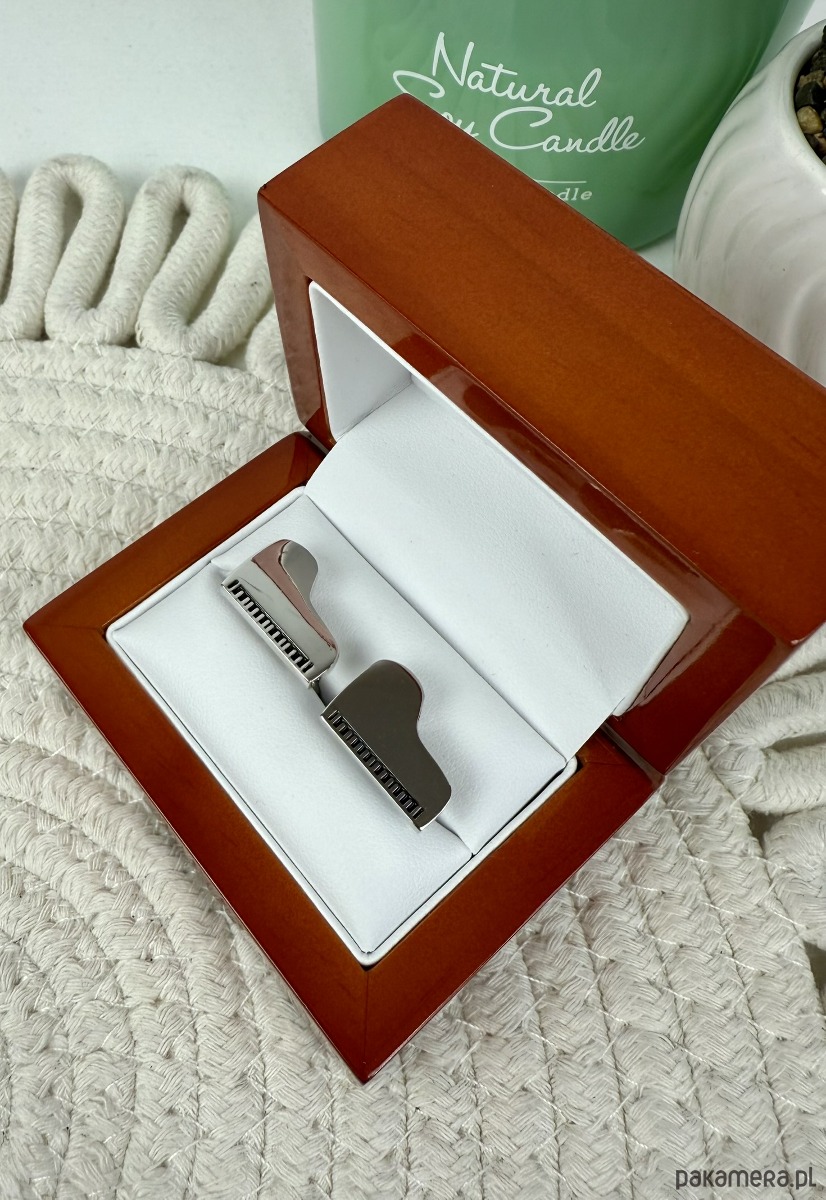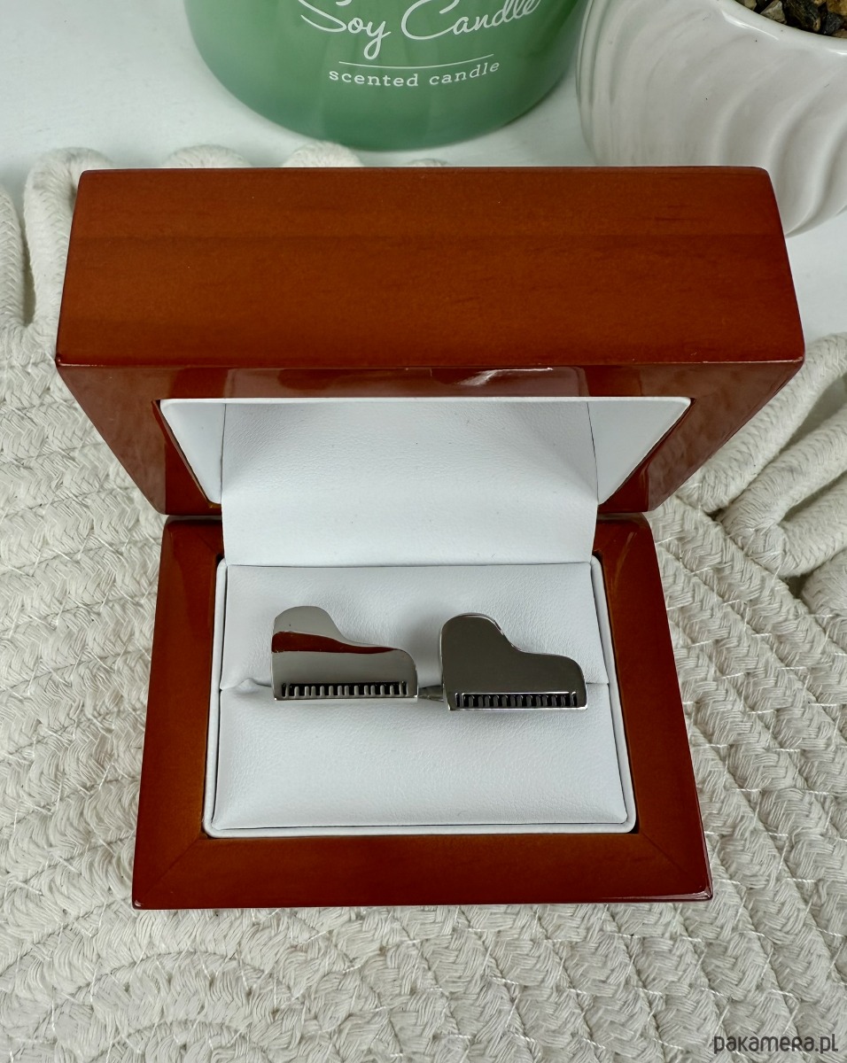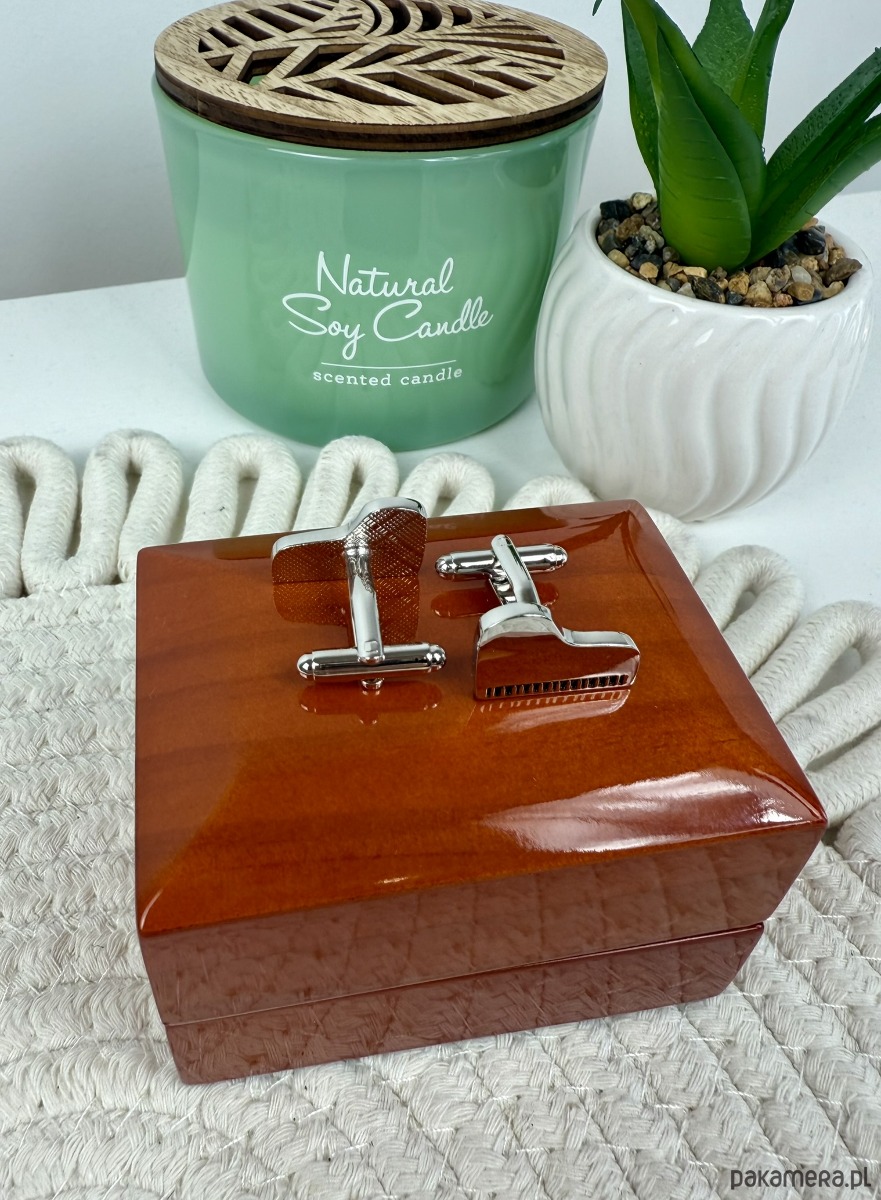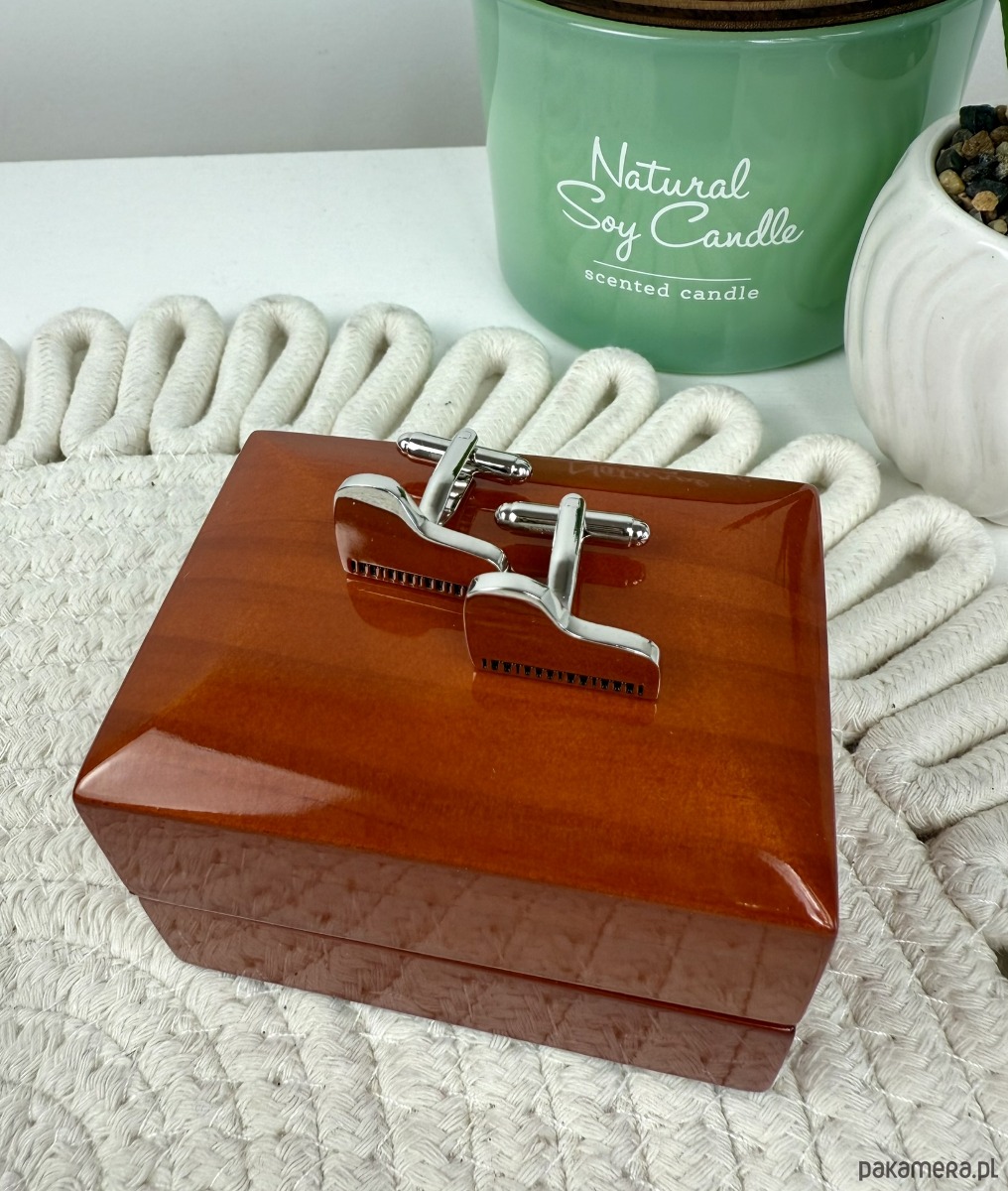 Spinki zapakowane w drewniane pudełko wykończone na wysoki połysk
