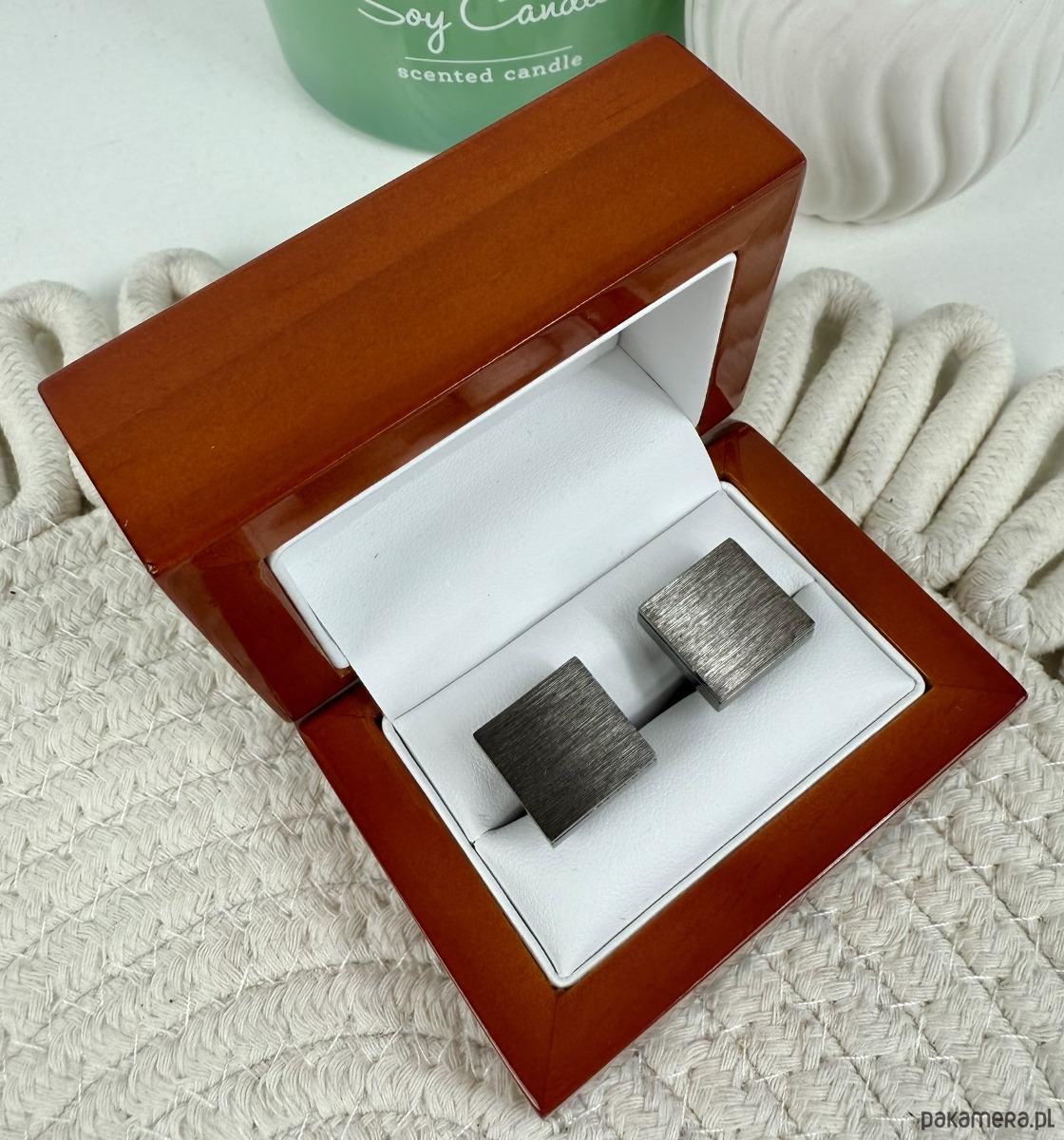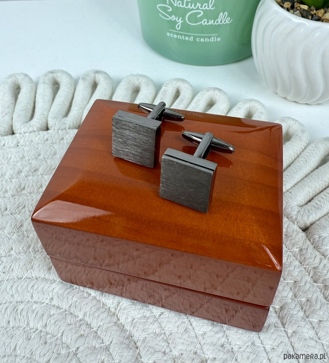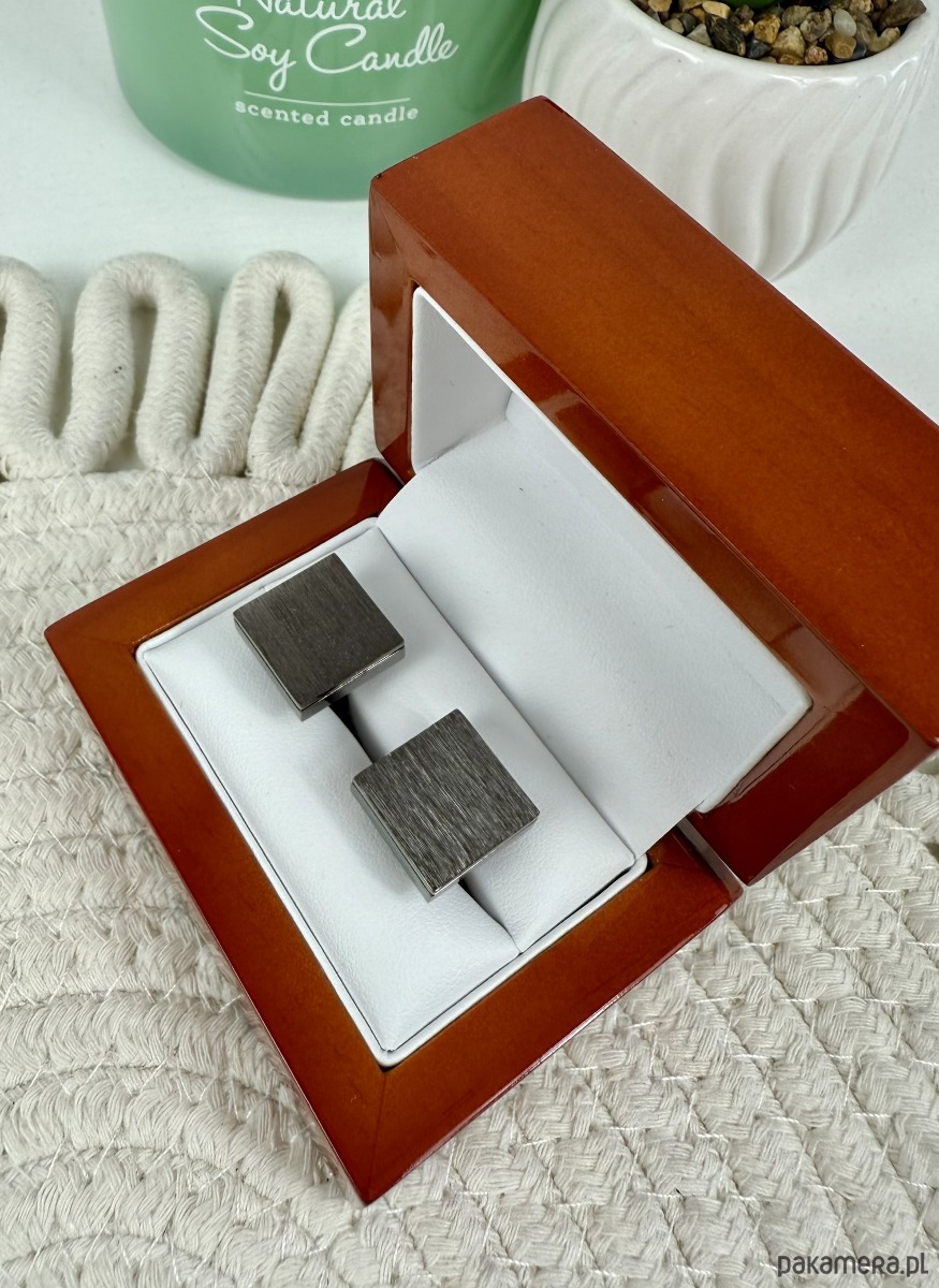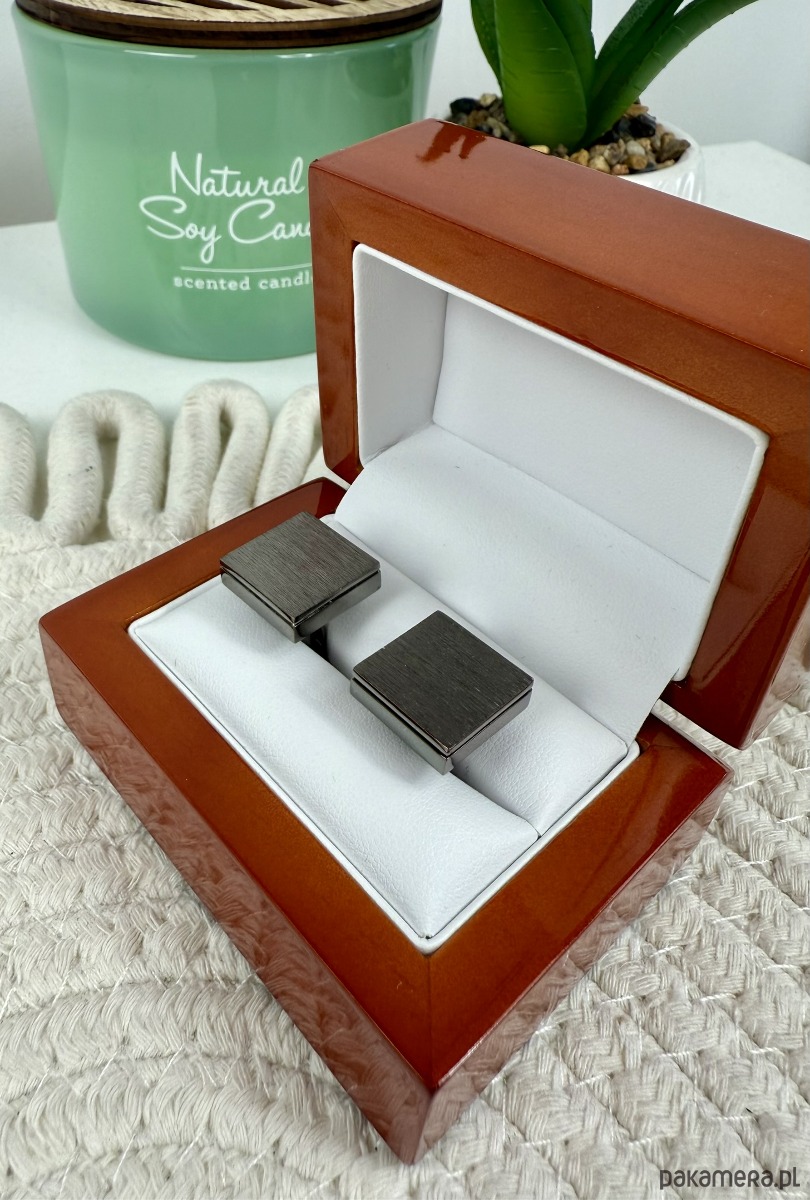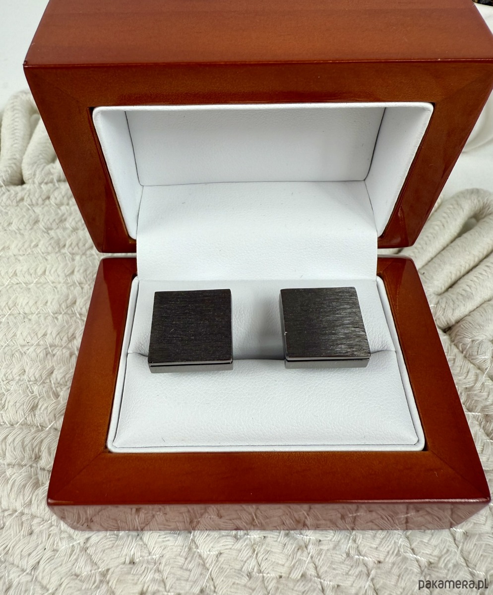 Spinki zapakowane w drewniane pudełko wykończone na wysoki połysk