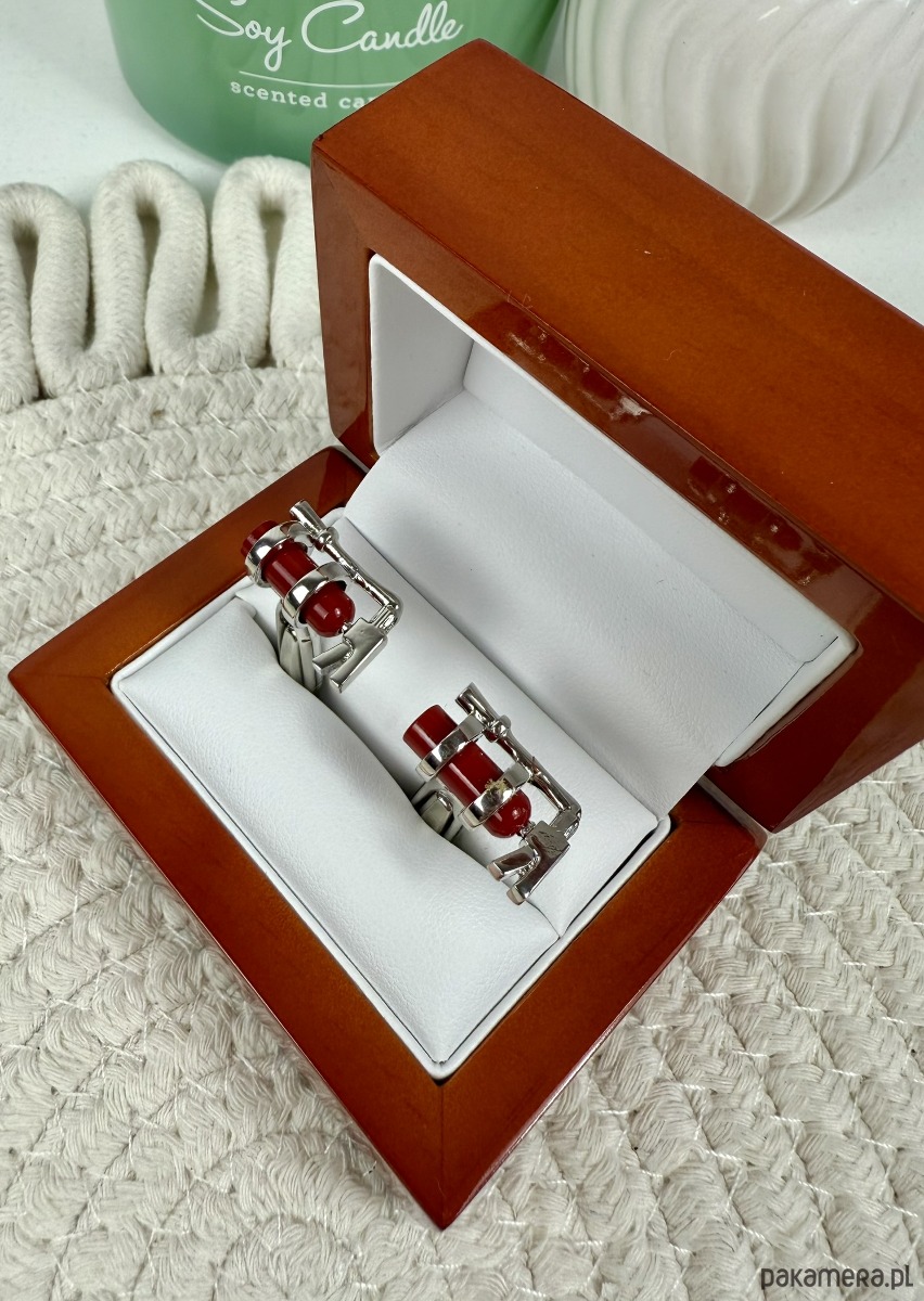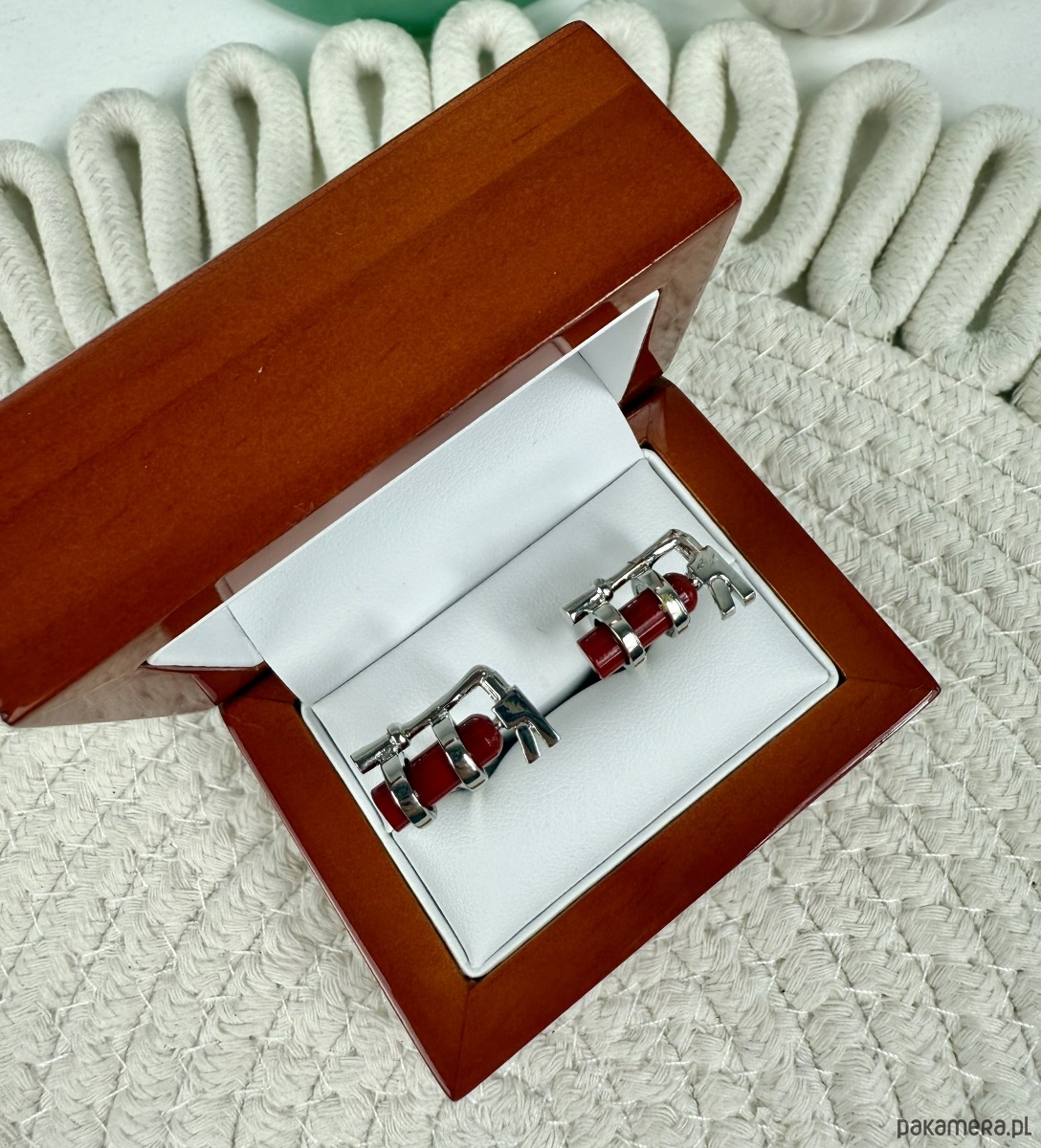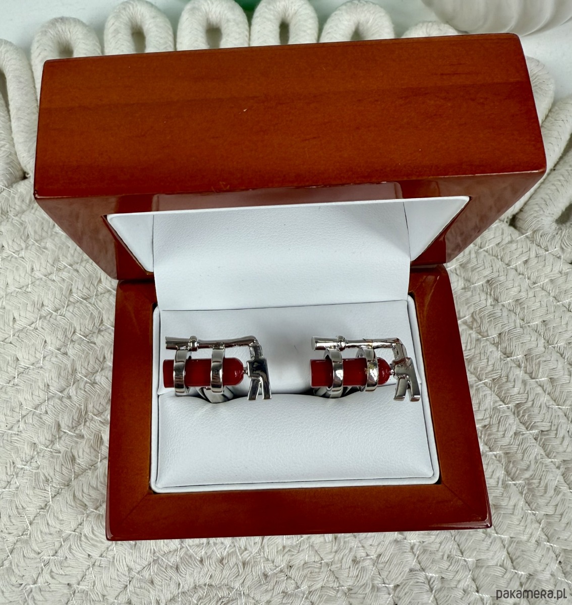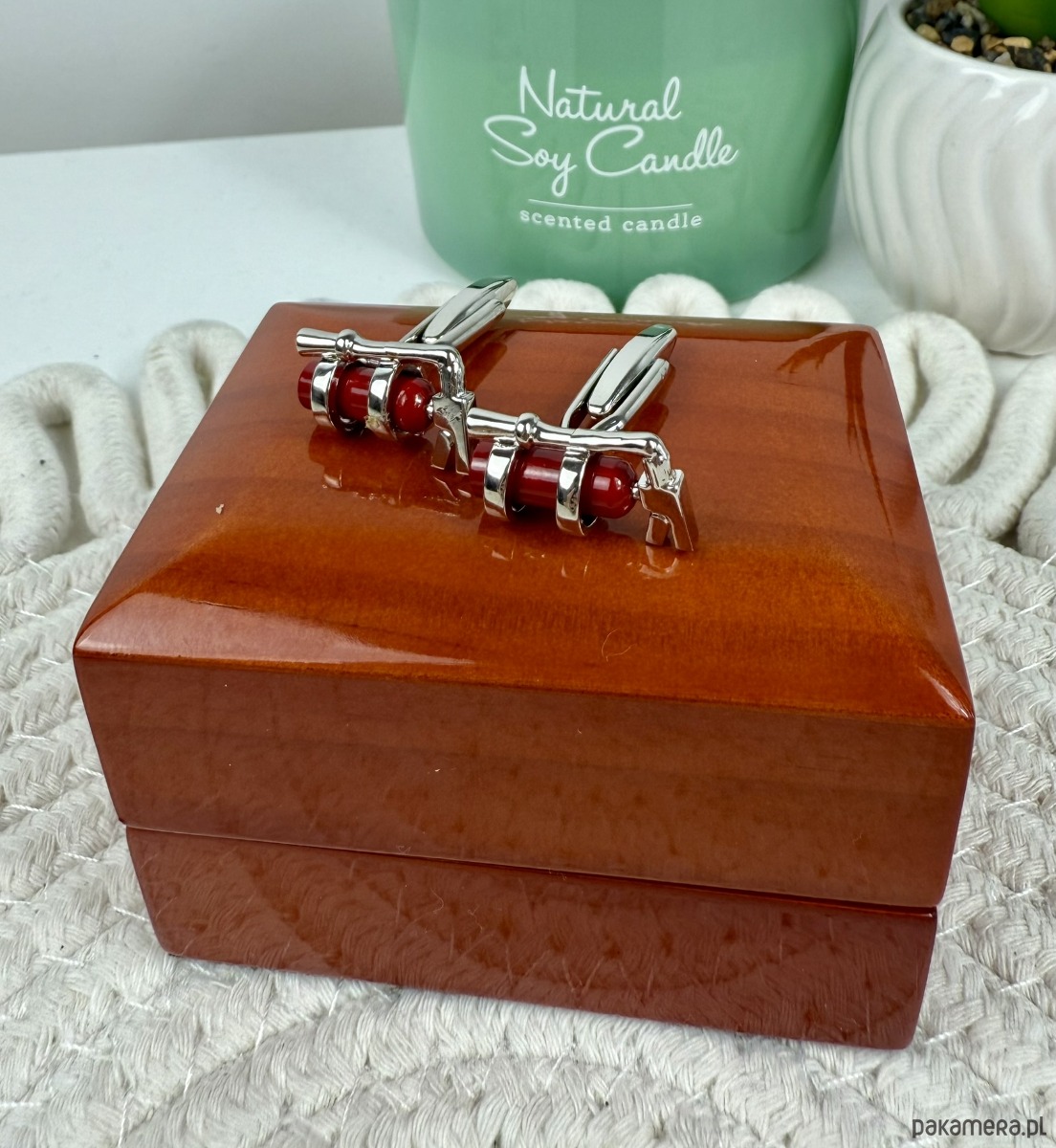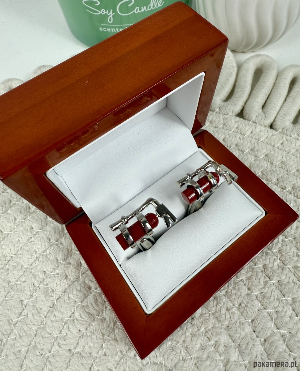 Spinki zapakowane w drewniane pudełko wykończone na wysoki połysk