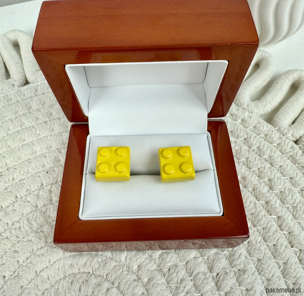 Spinki zapakowane w drewniane pudełko wykończone na wysoki połysk