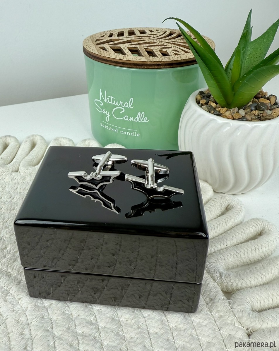 Spinki zapakowane w drewniane pudełko wykończone na wysoki połysk