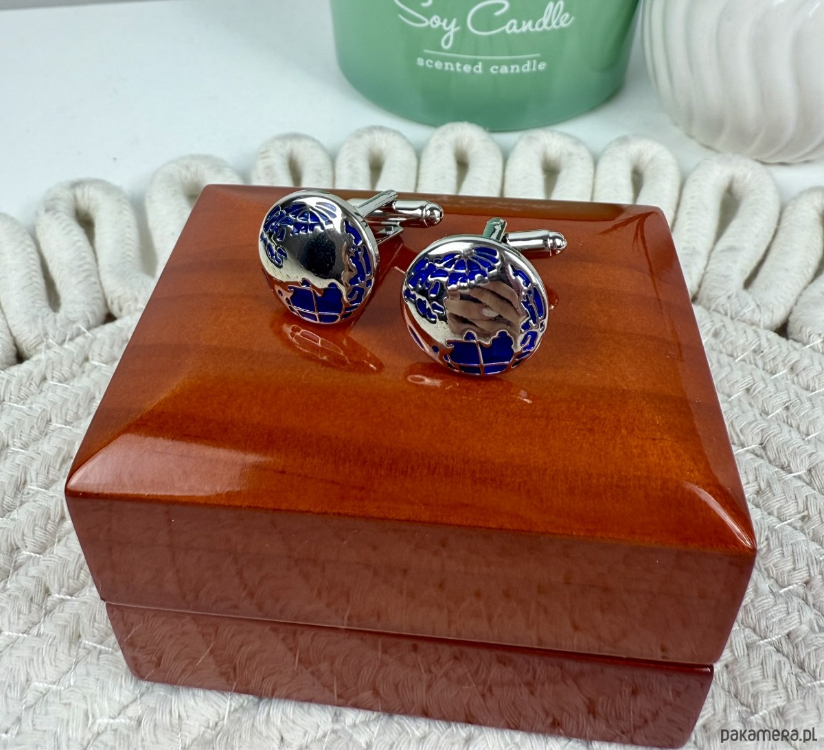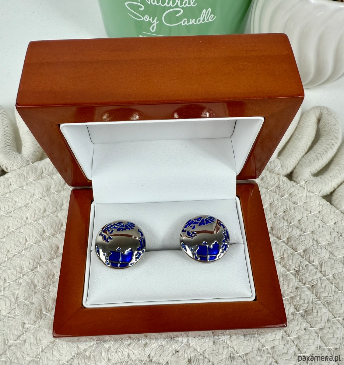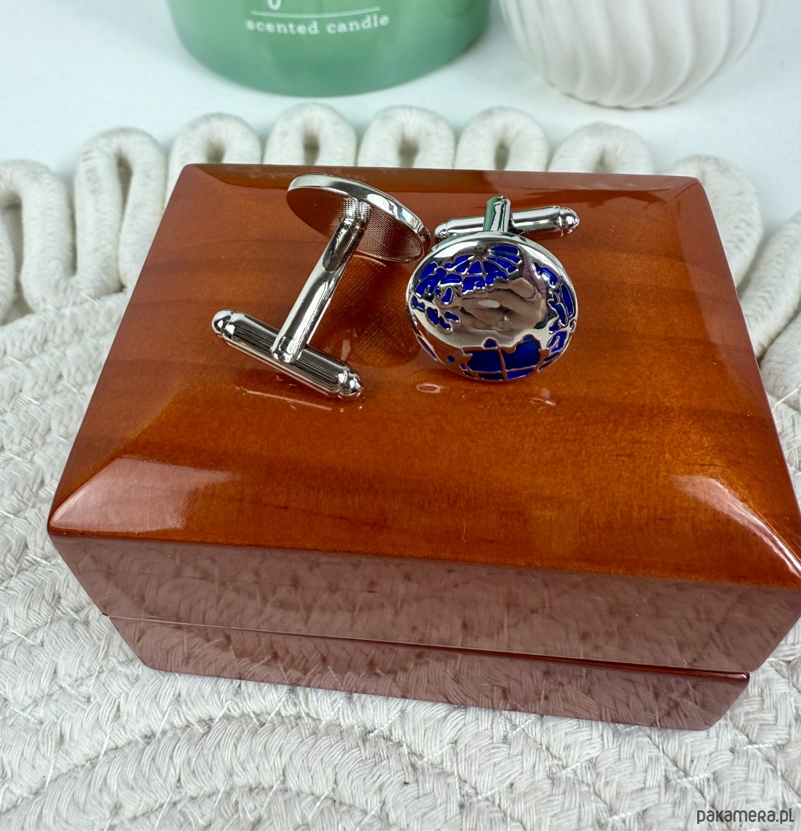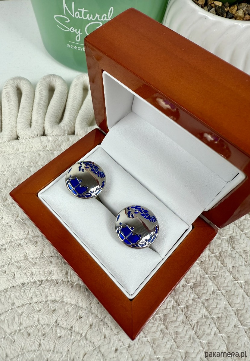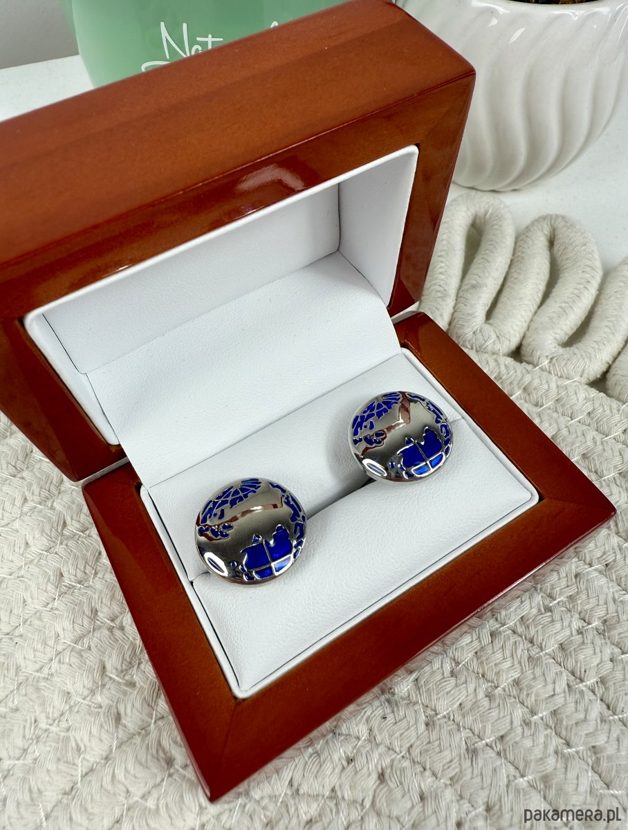 Spinki zapakowane w drewniane pudełko wykończone na wysoki połysk