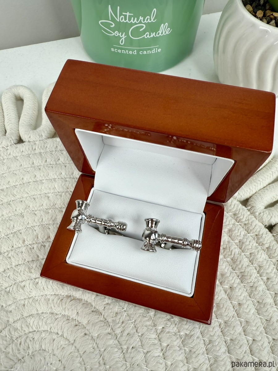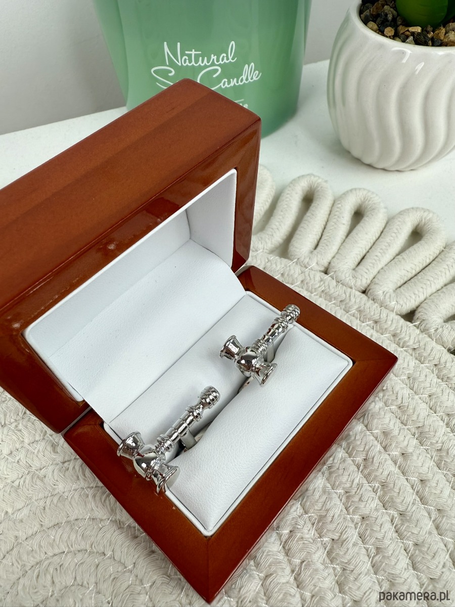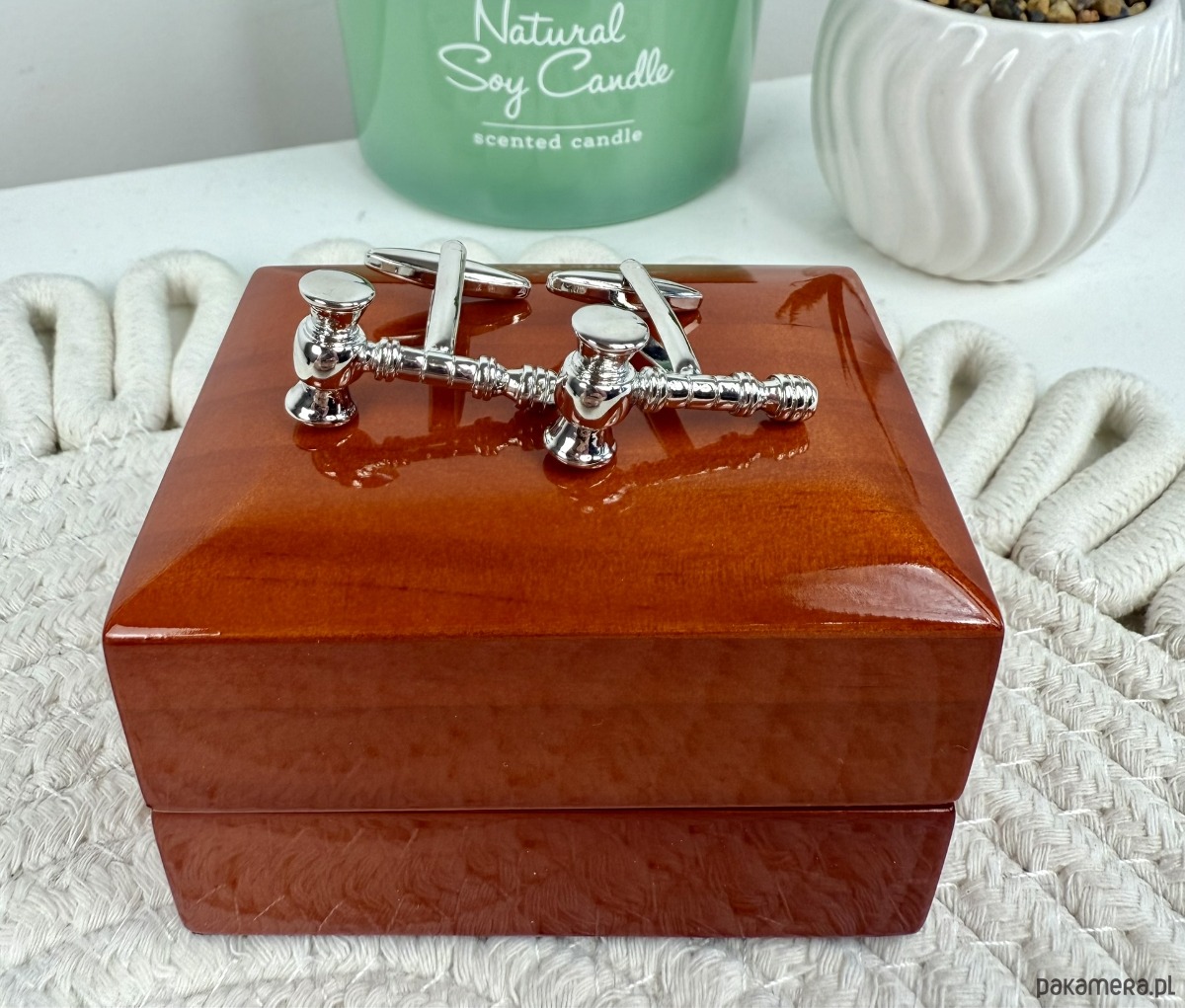 Spinki zapakowane w drewniane pudełko wykończone na wysoki połysk