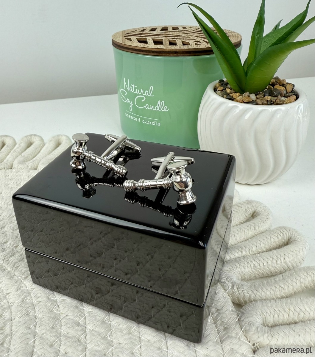 Spinki zapakowane w drewniane pudełko wykończone na wysoki połysk