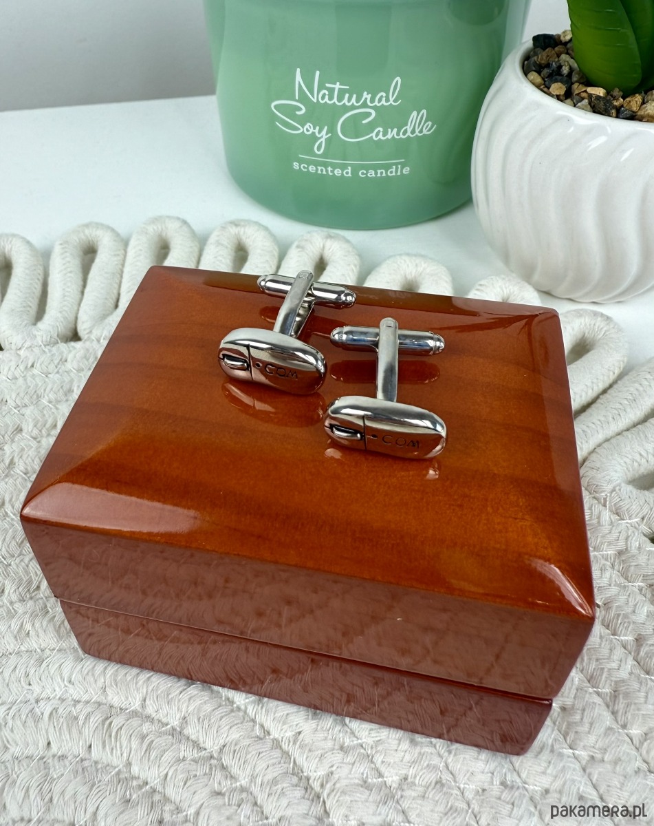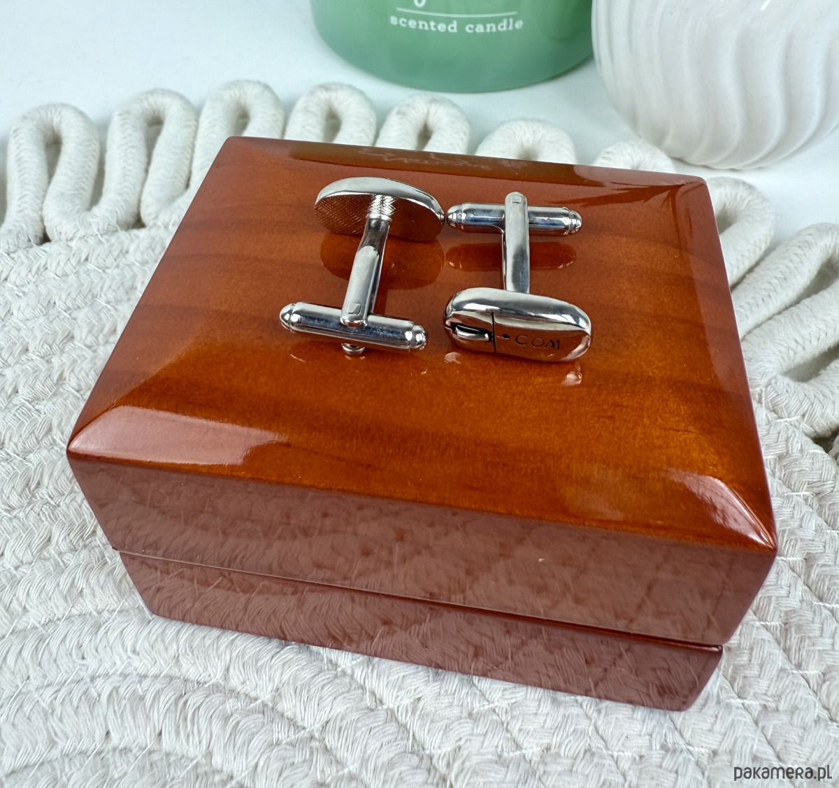 Spinki zapakowane w drewniane pudełko wykończone na wysoki połysk